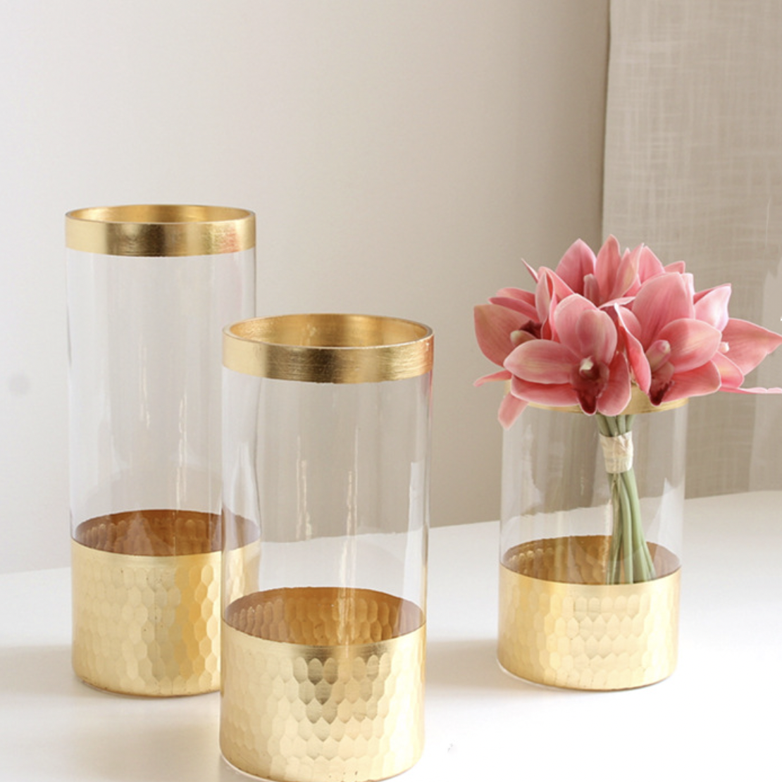 The gorgeous hand-blown glass vase is a wonderful match for the coffee table design. The glass vase adds a rich touch to the existing decor and makes a spectacular impression in the living room or dining area. The vase's simple lead-free material and shape make it excellent for grouping similar items of various shapes and sizes to decorate tables and shelves. The lovely glass vase with the gold metal rim provides a great housewarming gift for friends and family. The vase is a fantastic accent to any living space for a fresh look.