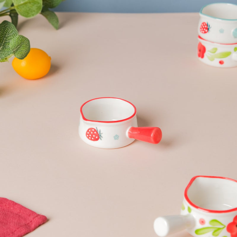 The ceramic creamer with handle is beautifully patterned by cutesy strawberries and little flowers to make it a perfect eclectic tableware. The small bowl has a spout for hassle-free pour and a red coloured handle for a good grip. The red rimmed creamer can be used to pour maple syrup or chocolate sauce on pancakes and waffles.
