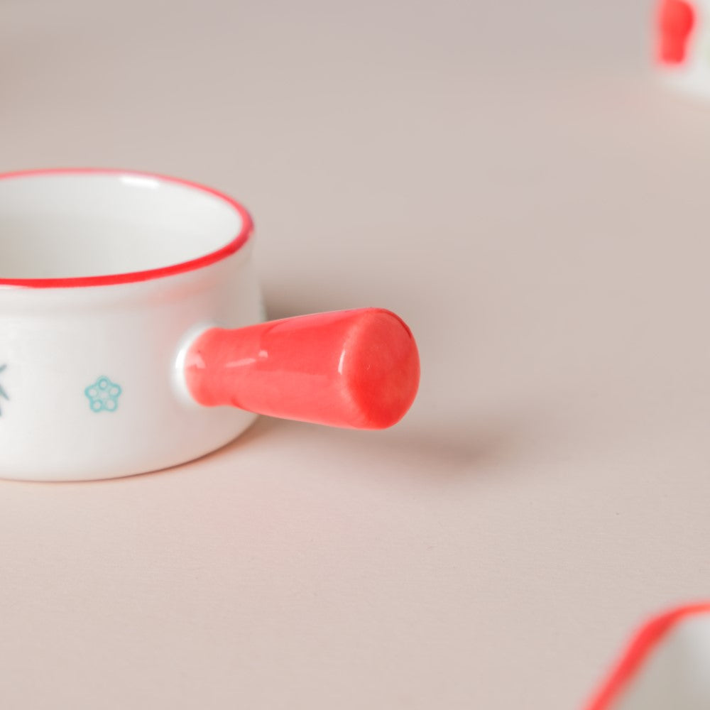 Nestip: The red rimmed ceramic creamer can be used to melt chocolates.