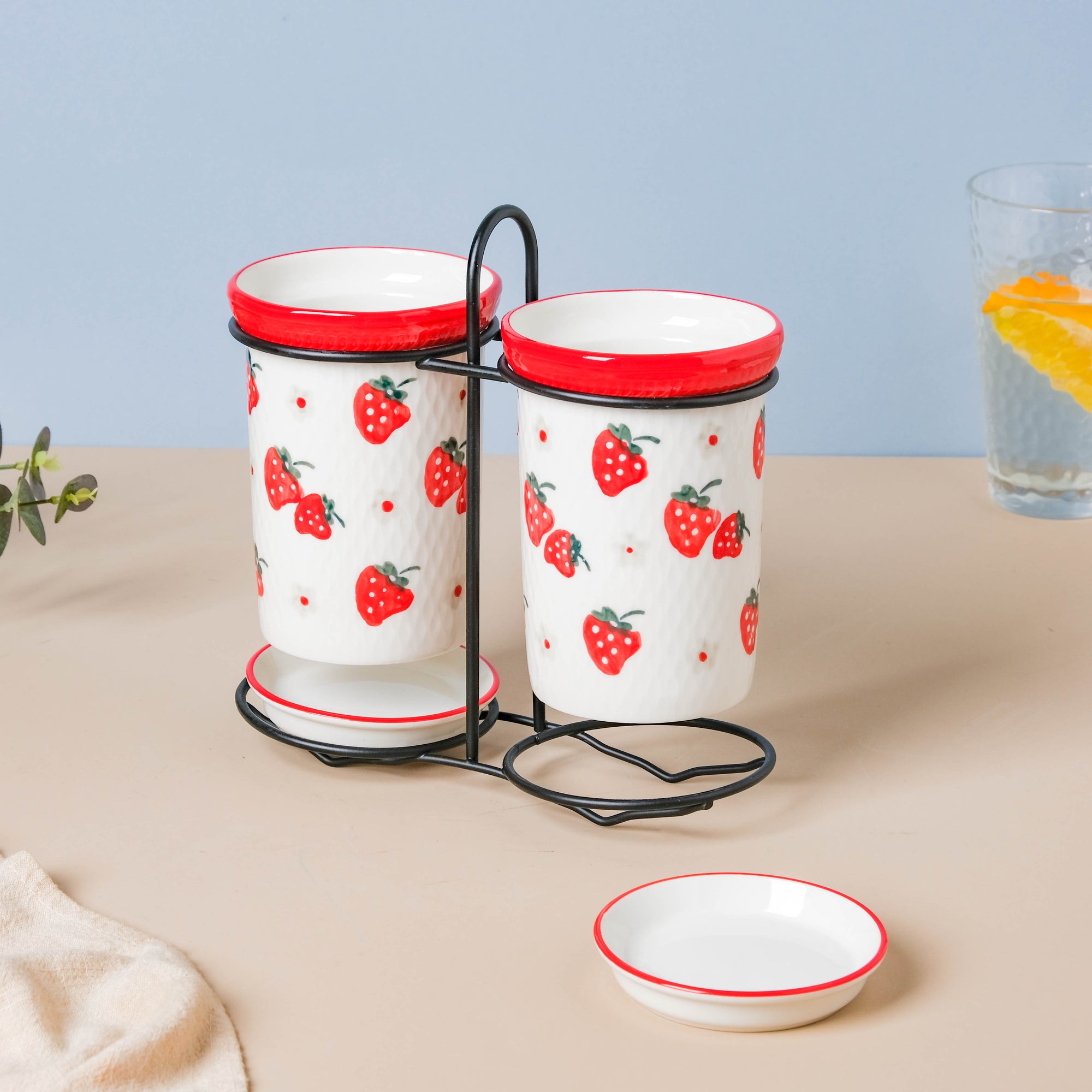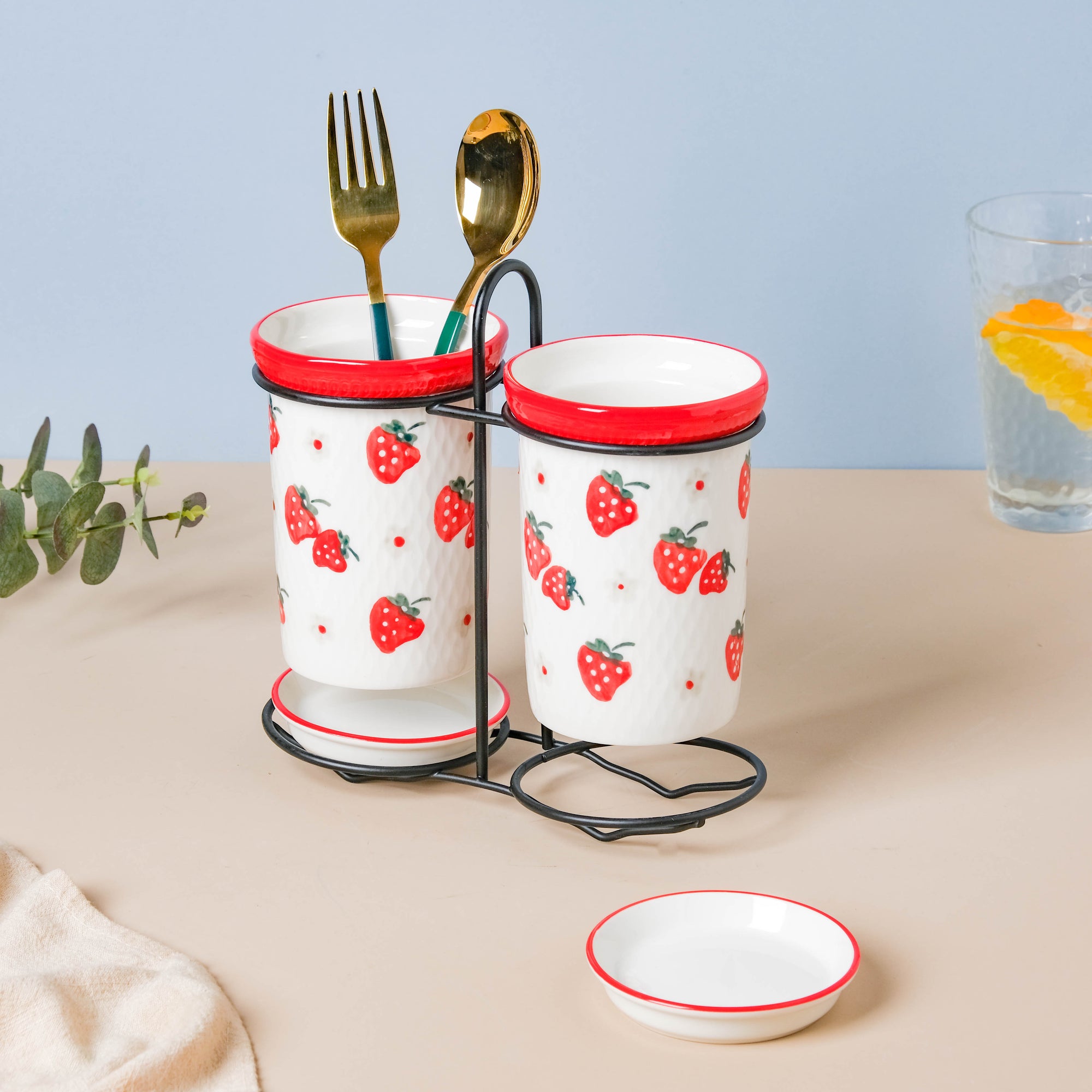 The chopstick holders come in a set of two, with bright strawberry motifs. Equipped with an articulately defined rim, the ceramic holders are designed to keep the chopsticks safe on the dining table. Plus, a metal rack is provided which has two distinct infoldings for the chopsticks cases. To drain out the excess water dripping from the chopsticks or spoons (if they have just undergone a wash), a pair of coasters also accompanies the set.