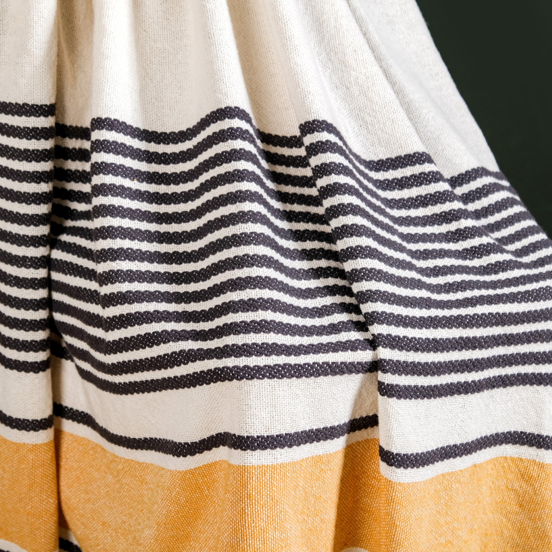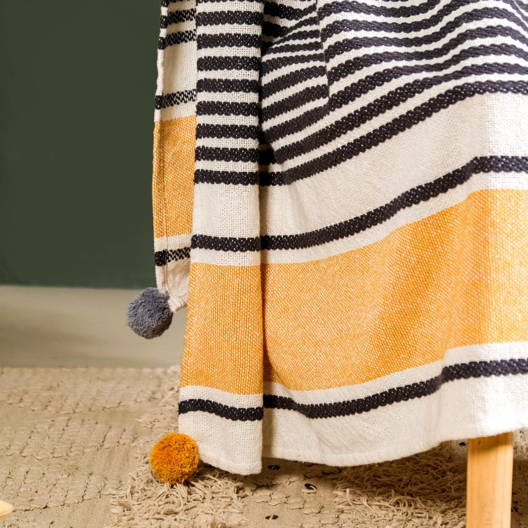 Design: Woven from 100% cotton, the throw with pom poms features a soft, breathable texture that’s both durable and skin-friendly. The base is an elegant off-white, brought to life with thick mustard yellow bands at the ends and a bold section of tightly spaced black horizontal stripes. What sets this throw apart is the playful addition of pom-poms along both sides, adding a pop of personality. The balanced mix of minimalism and whimsy makes it ideal for both modern and eclectic home settings.