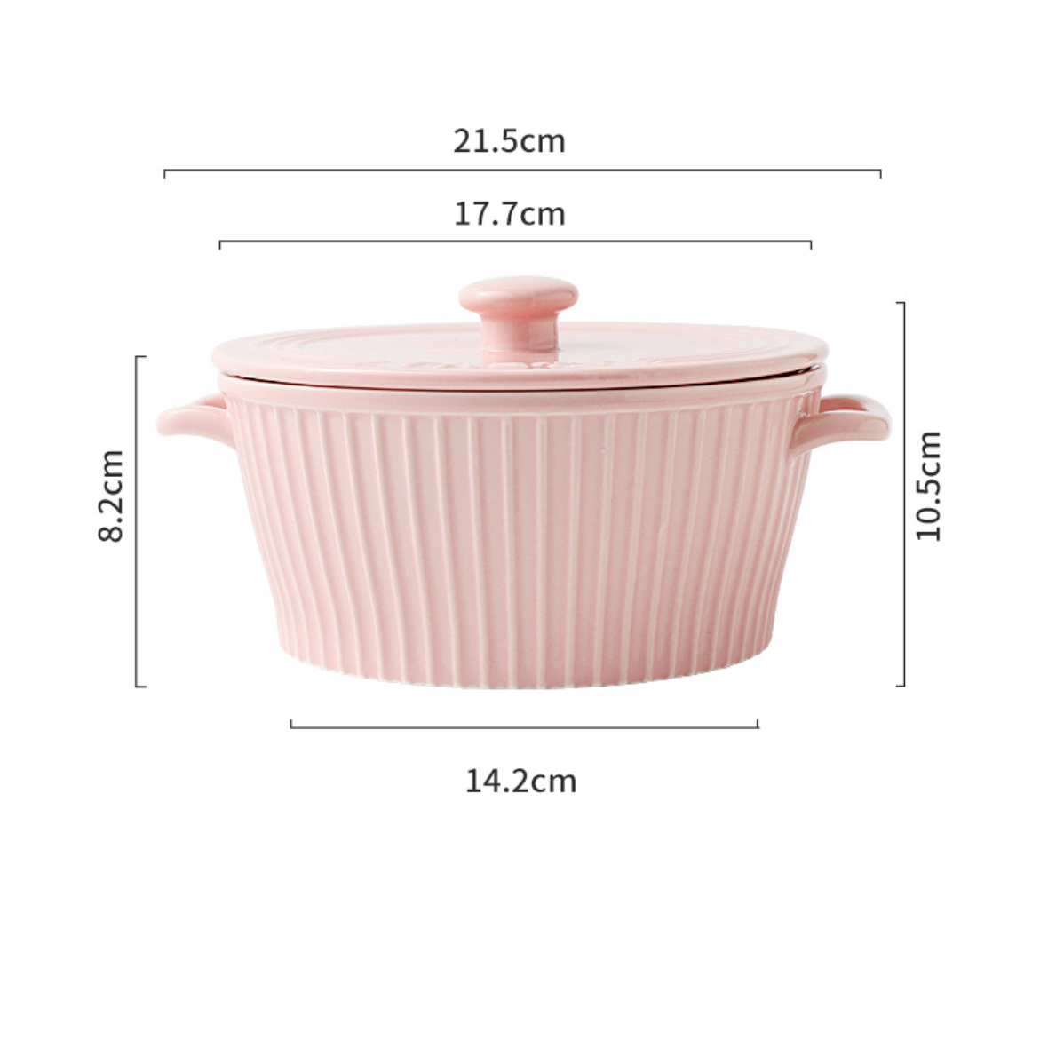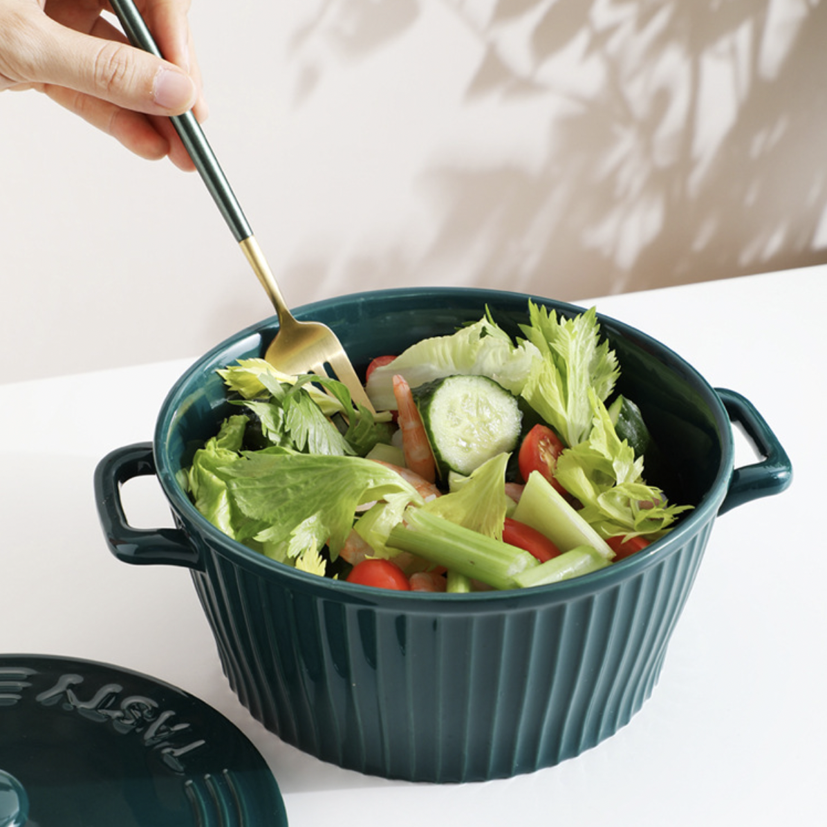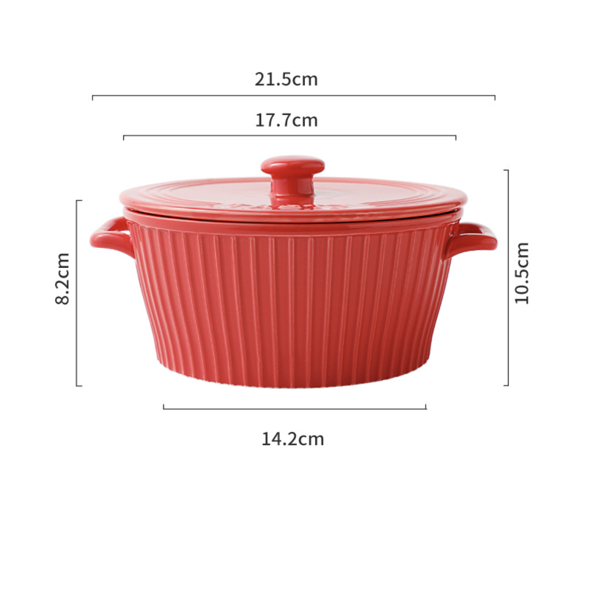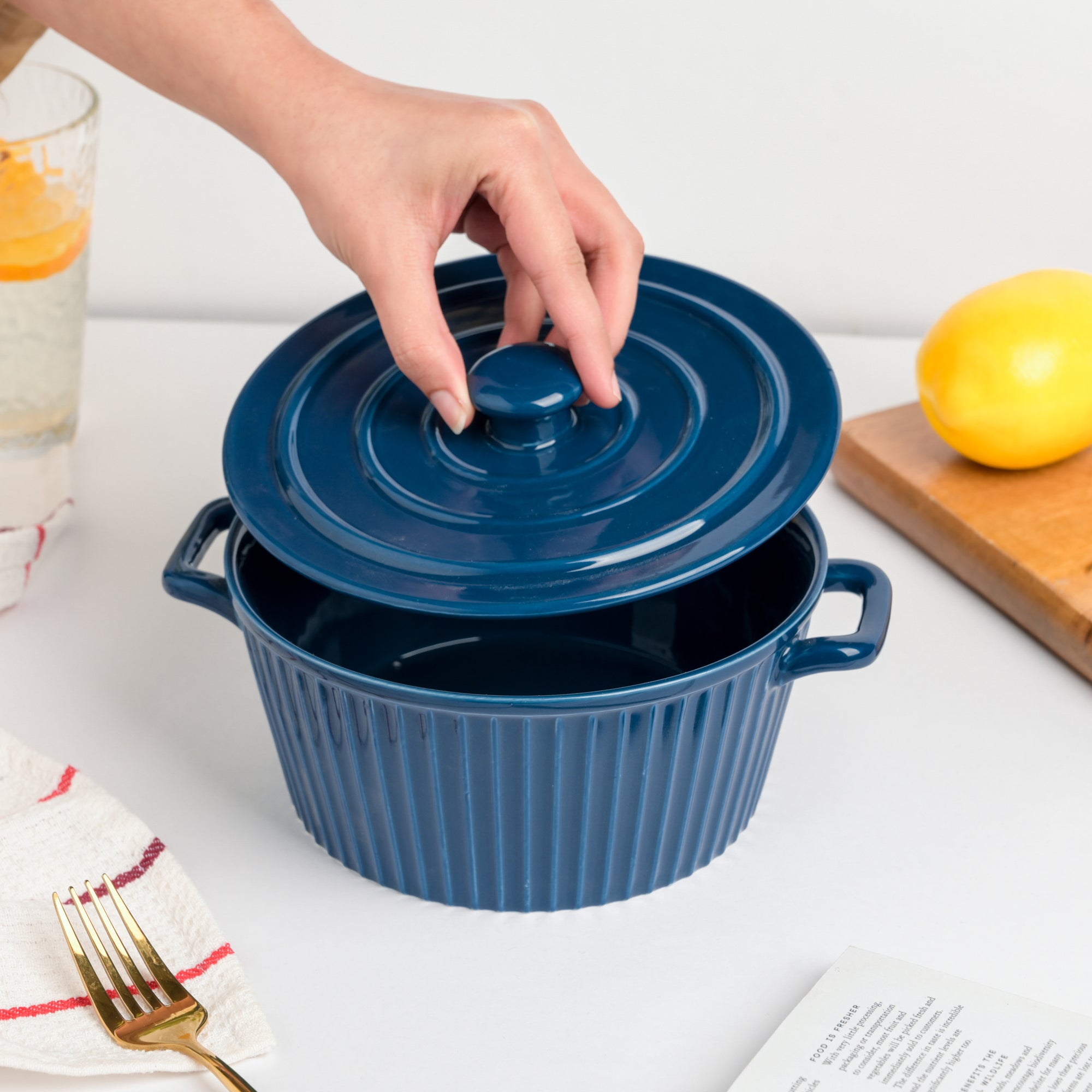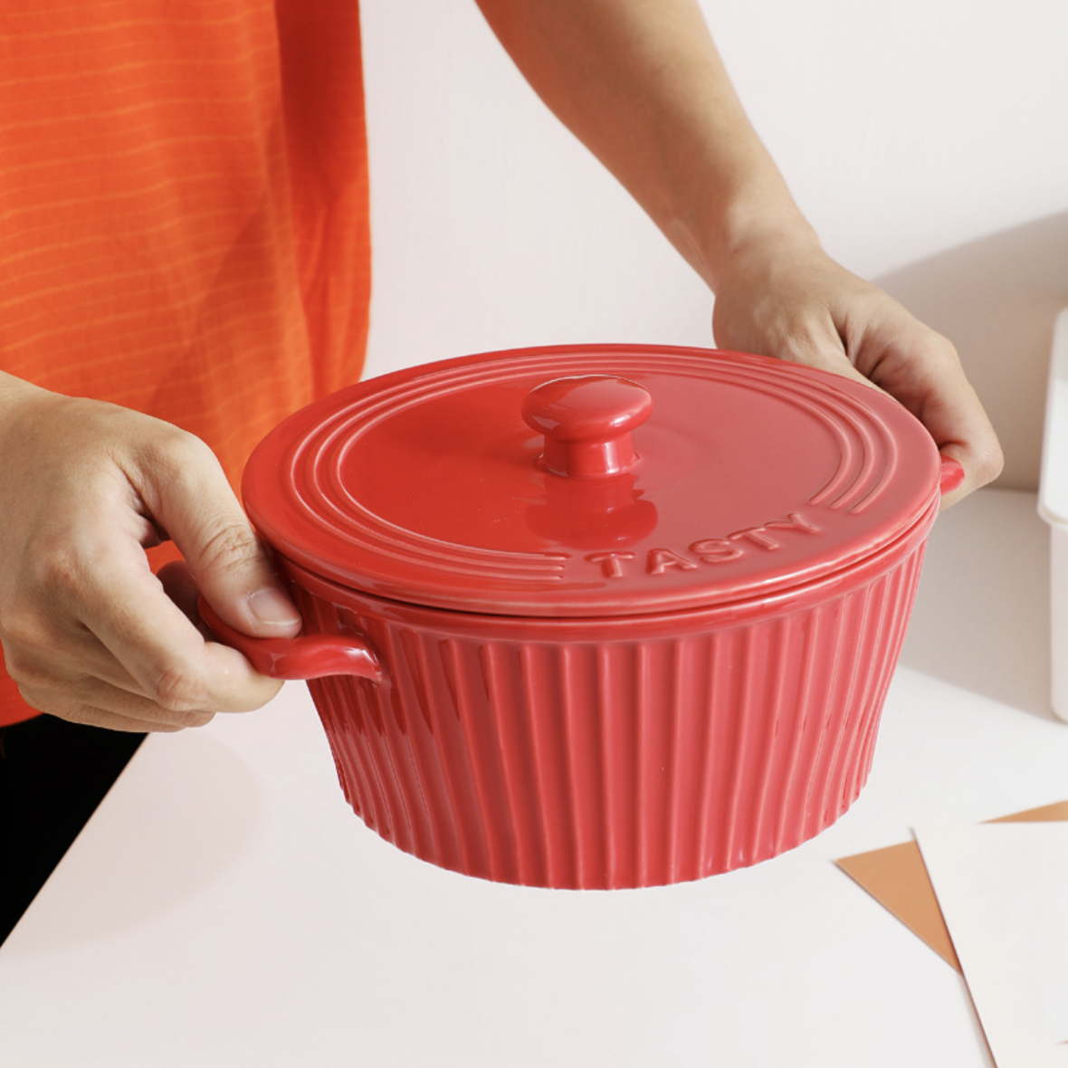 Cooking pots made of ceramic with a striped polished surface is quite a trendy addition to the kitchen collection. The lid and handles on the cooking pots make cooking more pleasurable, engaging, and safe. The dishwasher-safe ceramic pots make cleaning an easy affair. Rice, noodles, broth, vegetables, lentils, meat, and a range of other items may be cooked and heated in the pots. With or without the cover, the pot may be used to bake and prepare foods in the microwave oven, or simply as a casserole on the dinner table, or to serve breakfast. There are a number of colorful variations available in different colors to take a pick from. The lid has the words TASTY written on it in bold which further adds to its charm.