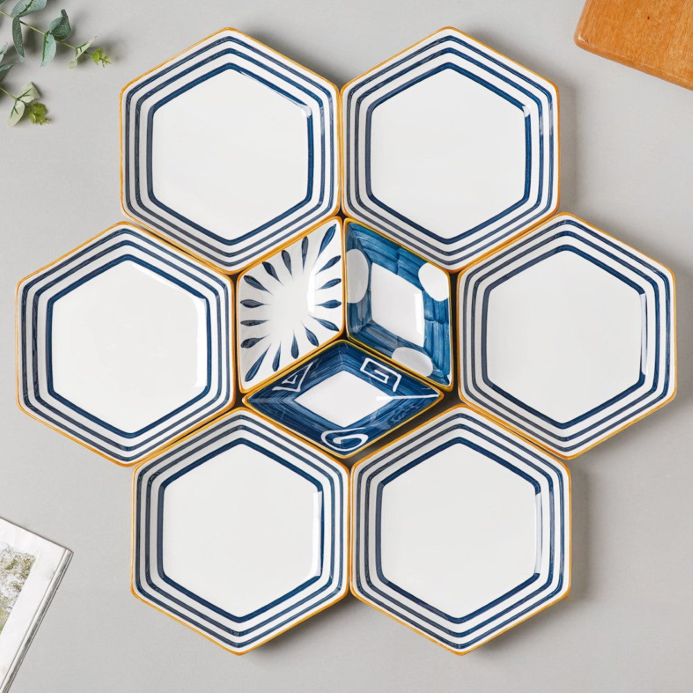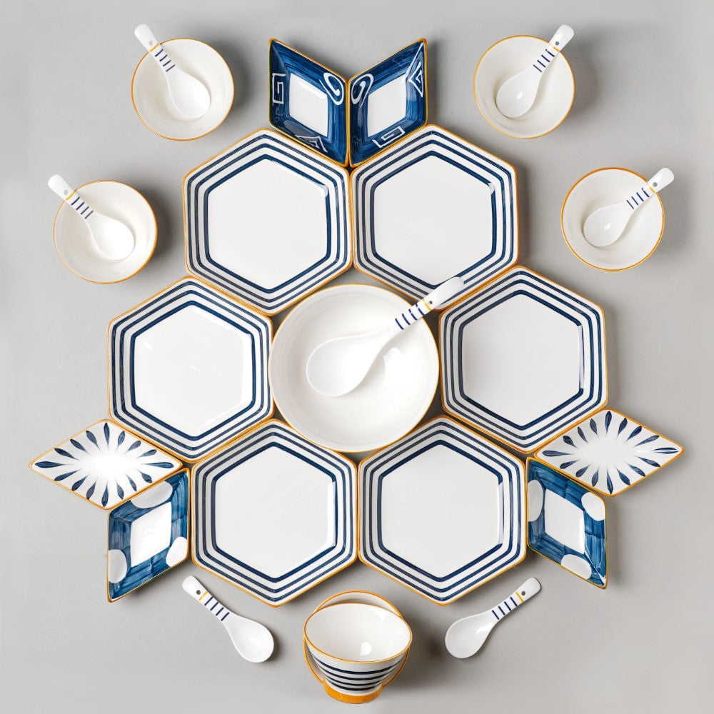 The Nitori collection is an everlasting picture of the peace and tranquility that the seashores provide us whenever we visit it. We may now enjoy a peaceful environment at home, right at the dinner table. Because they enhance the flavor of the food placed on them, the aqua plates and bowls are calming to the spirit. And when the white is blended, not only does it allow serenity but also comfort with every serving. The fine craftsmanship of the Nitori collection is evident with every stroke of geometric shapes on its surface. 6 lines hexagon plates, 2 spiral diamond plates, 2 polka dots diamond plates, 2 teardrop diamond plates, 6 lines soup bowls, 6 soup spoons, 1 serving bowl, and 1 serving spoon are included in the set.