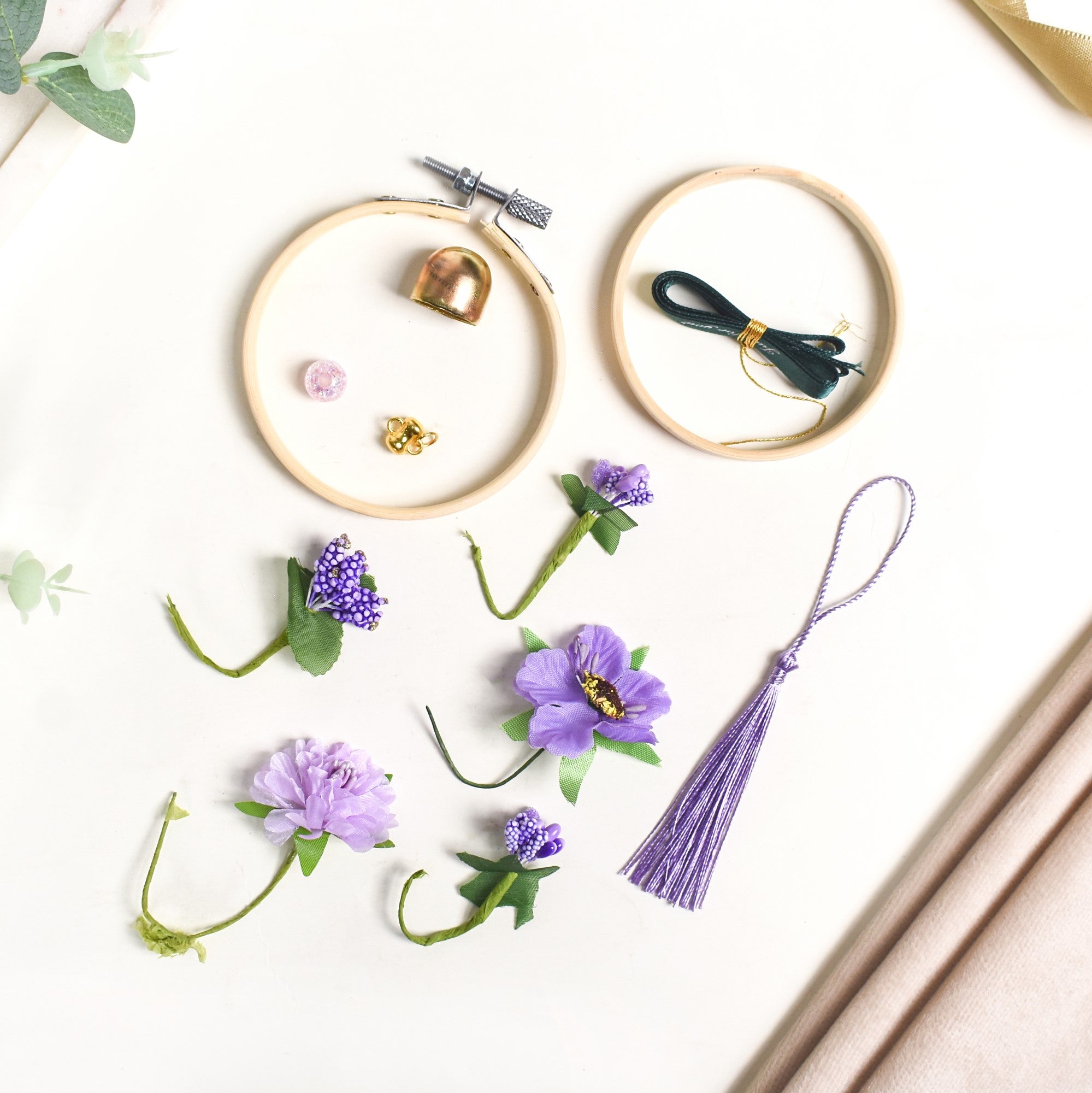 Cruise in style with this beautiful DIY car charm. Featuring a round bamboo wood frame in a soft beige hue, it offers a natural and rustic base for the elegant lavender artificial flowers that surround it. These soft, pastel florals, made from high-quality polyester, add a calming vibe while the green leaves and stems enhance the natural, fresh feel.