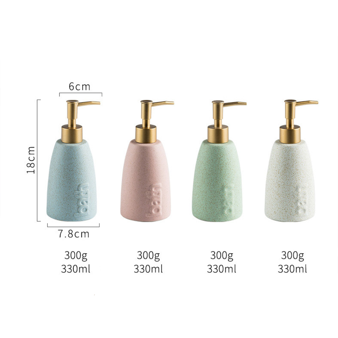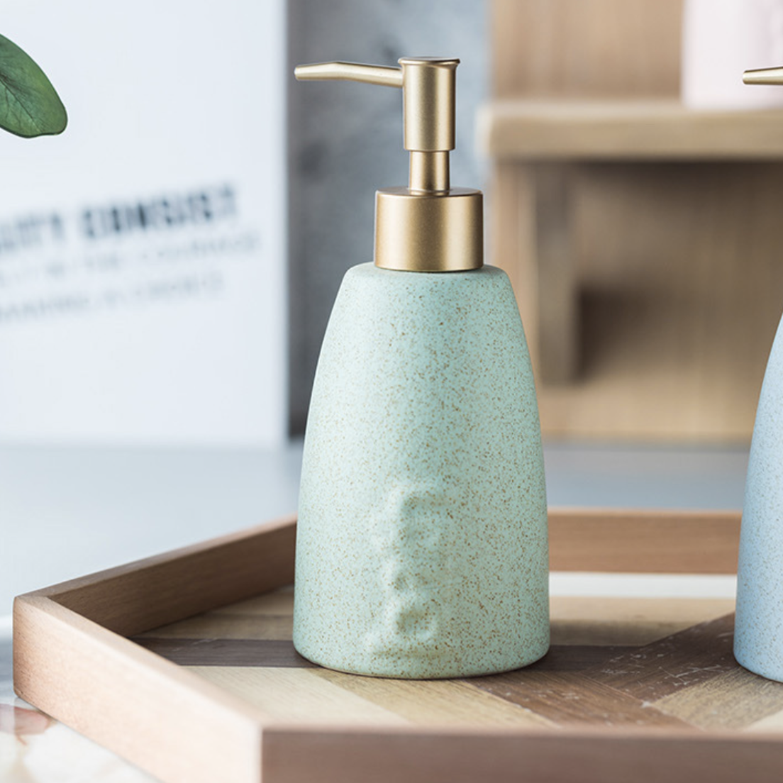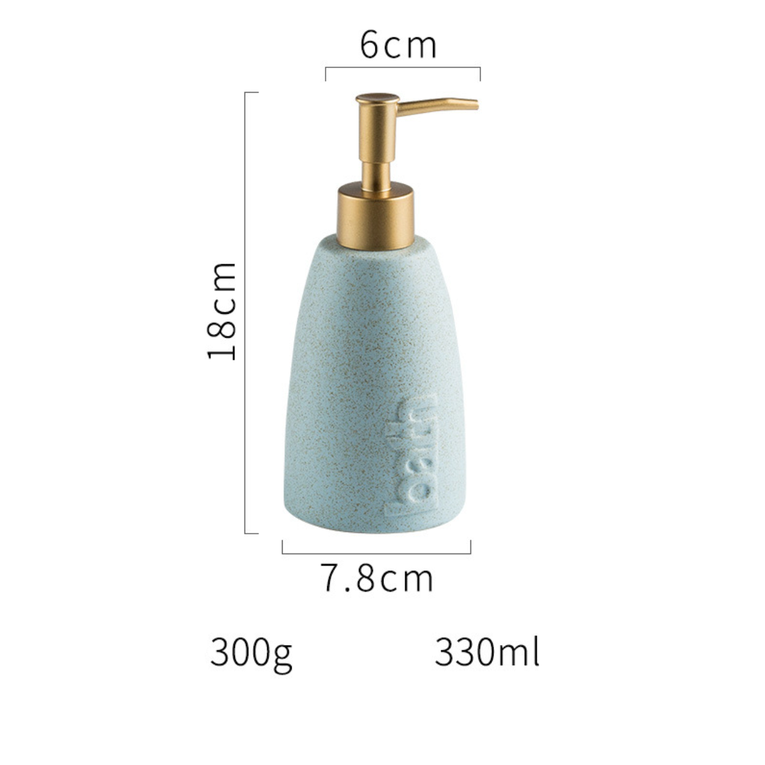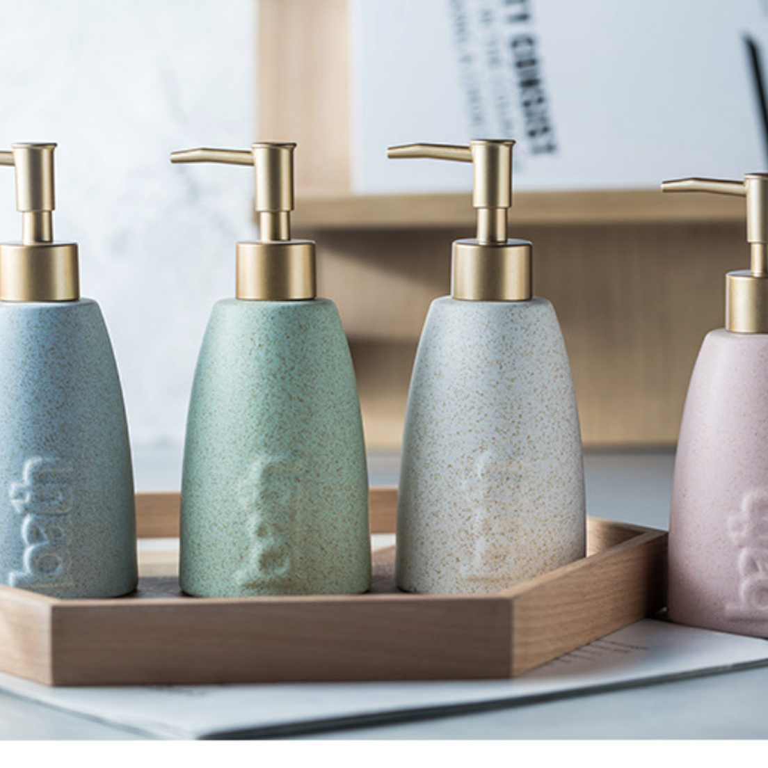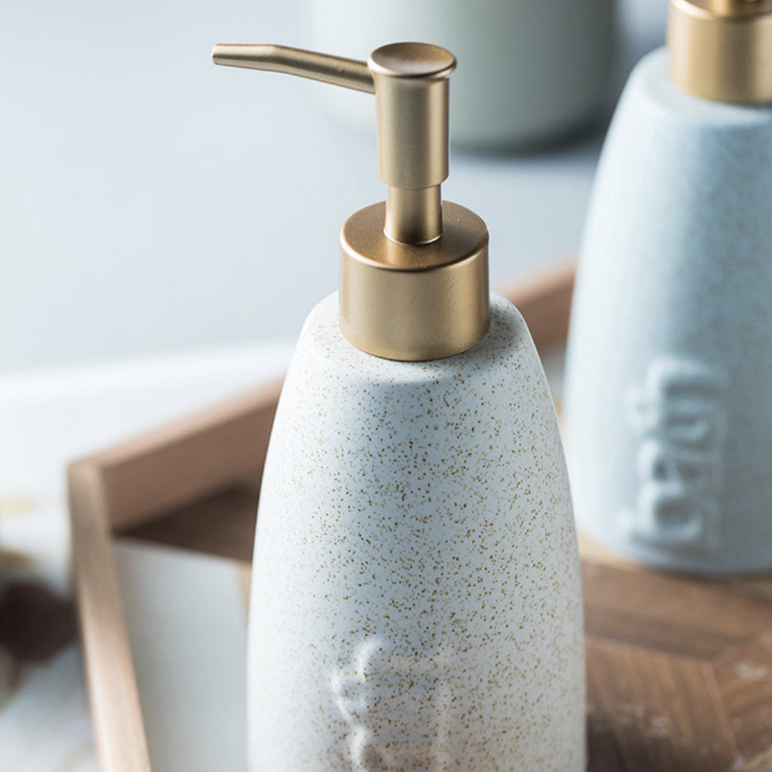 Stylish dispenser for bathroom that is made in ceramic and comes in multiple pastel colour variants to choose from. The liquid soap dispensers have a unique shape with a golden dispenser pump that adds to the look of the ceramic dispensers. The dispenser bottles have freckles on the surface making them look like a stoneware dispensers with bath written on the surface. Use the bathroom soap dispenser in the washroom to keep hand wash, shampoo and body wash or keep it at the dresser to keep sanitizer or lotion. One can also create soap dispenser set by pairing the dispenser bottles.