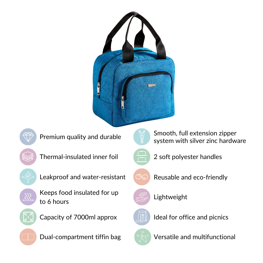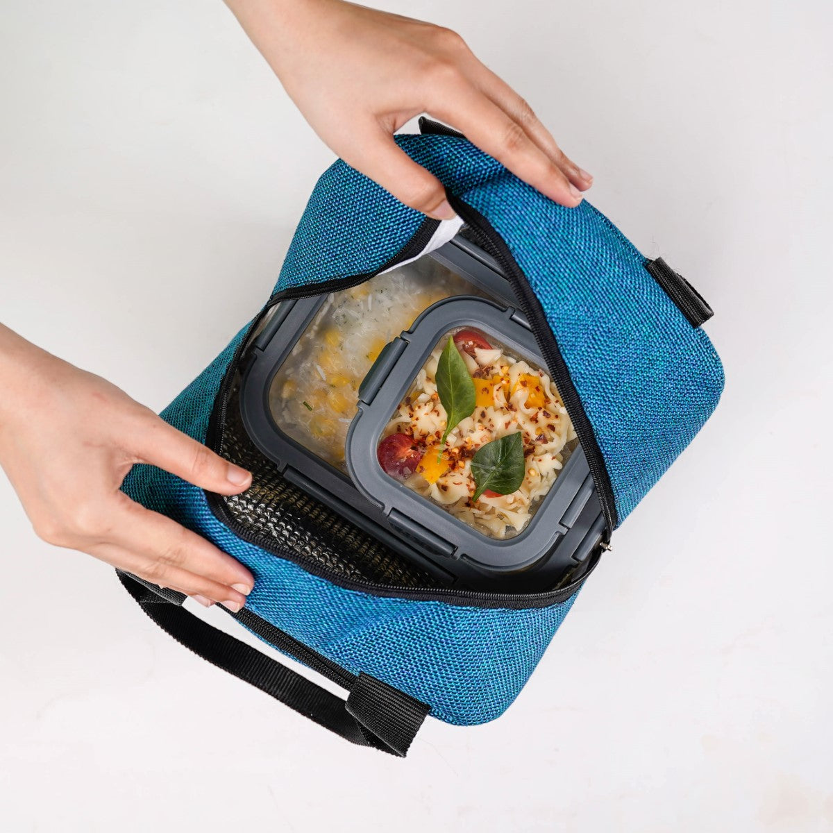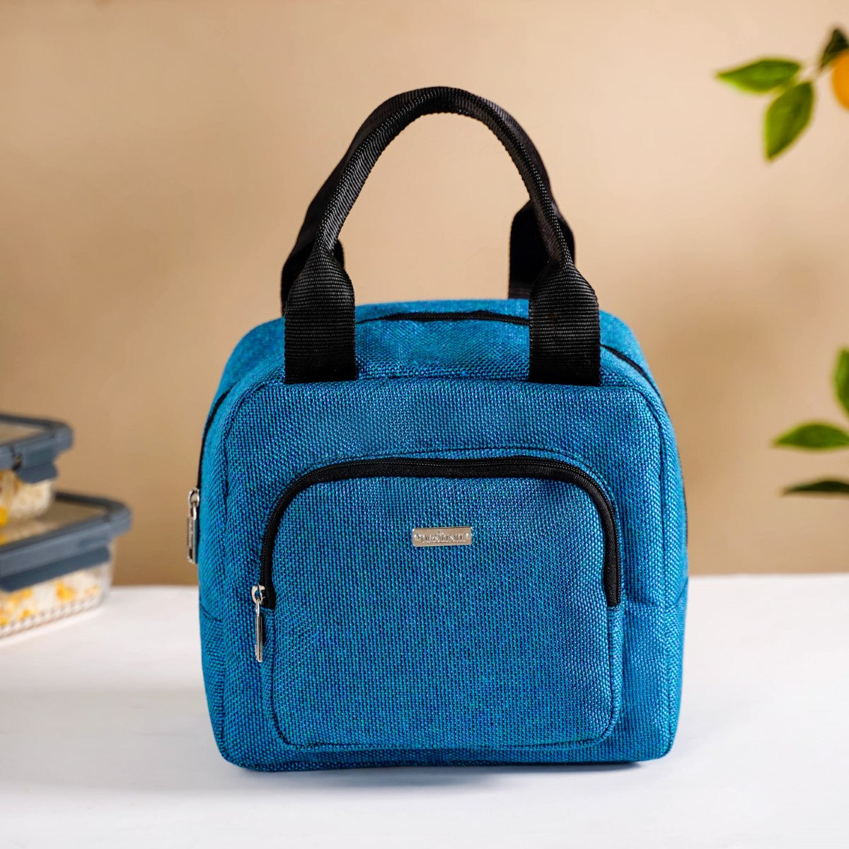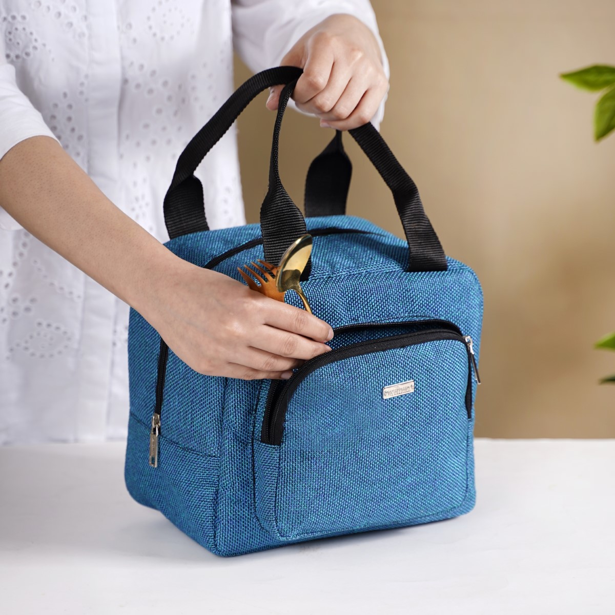 The lunch bag has two compartments- one main, spacious compartment where you can organize all your tiffin boxes. The smaller front compartment can be used to store your cutlery, napkins, or even little sachets of condiments like ketchup.