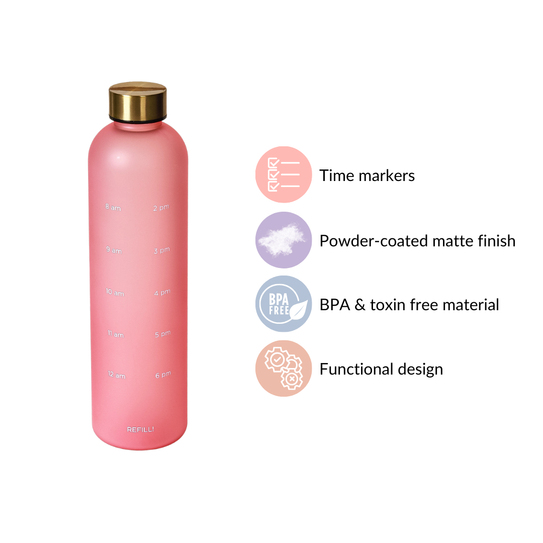 The printed time markers on our 1-litre water bottle play a crucial role in promoting mindful hydration. These markers are strategically placed at specific time intervals throughout the day, such as "8 AM," "11 AM," and "4 PM," to provide you with a visual guide for your hydration goals. By following these markers, you can establish a consistent drinking routine, ensuring you meet your daily water intake targets more easily. It's like having a friendly reminder by your side throughout the day to keep you on track with your health and wellness goals.