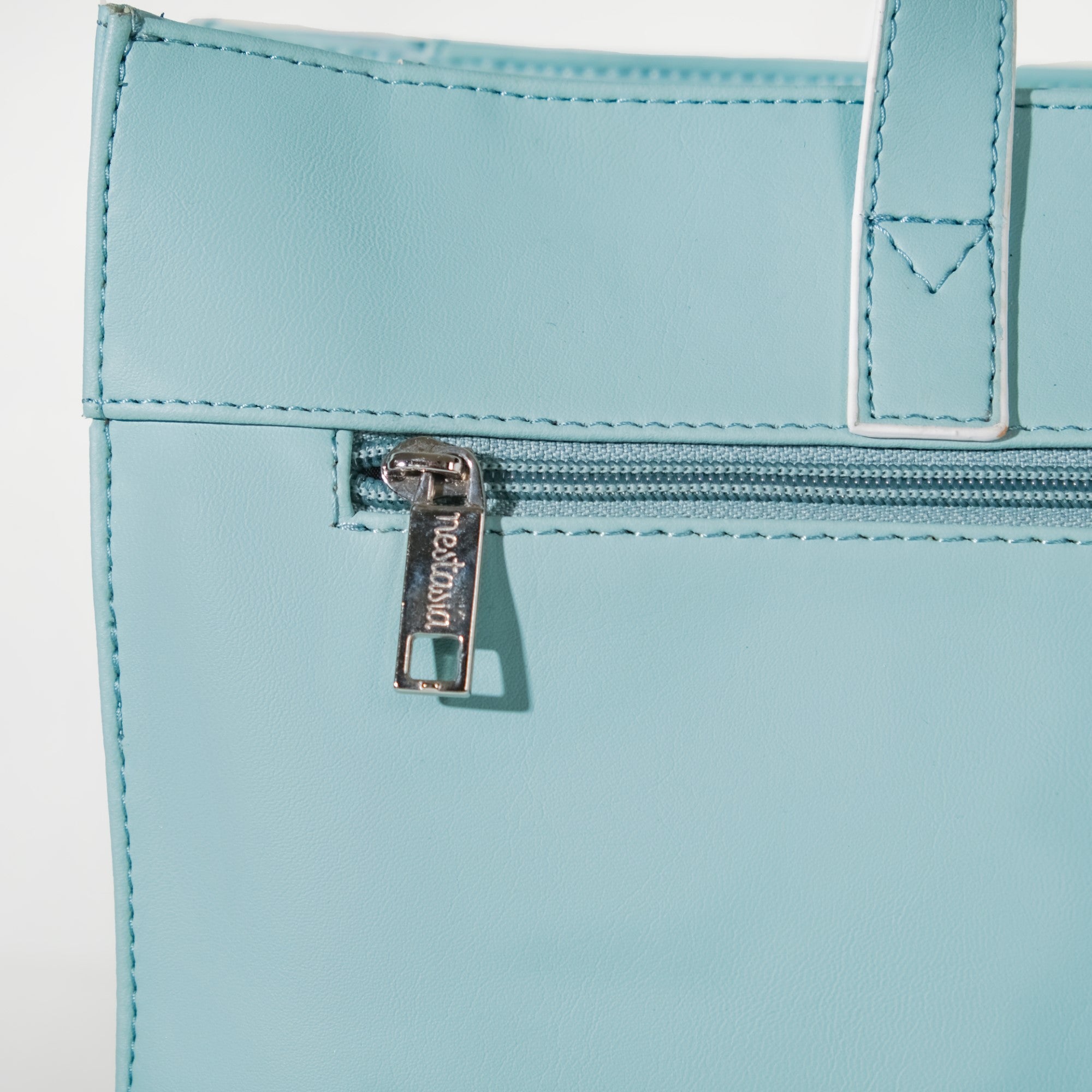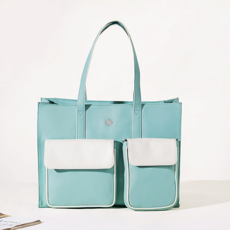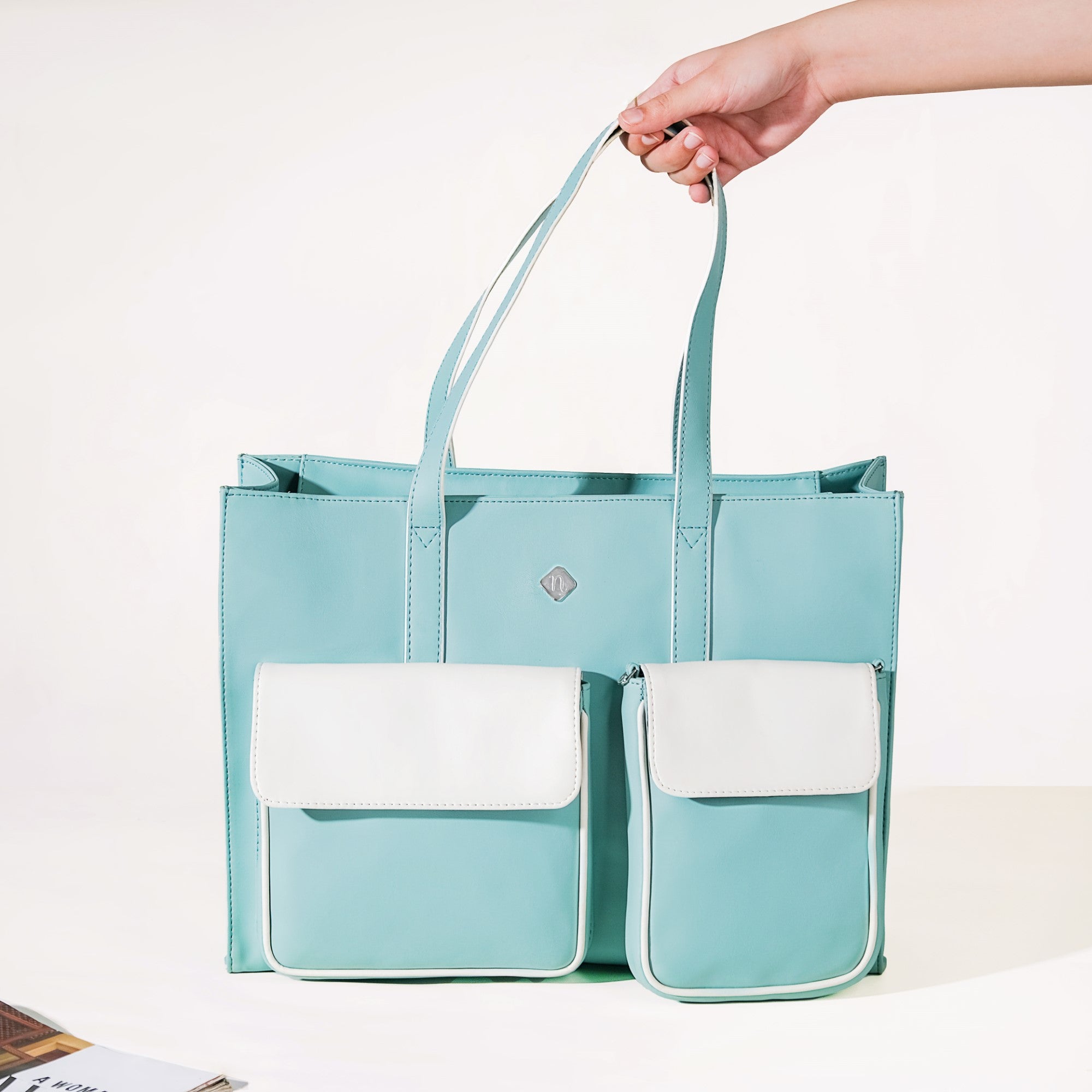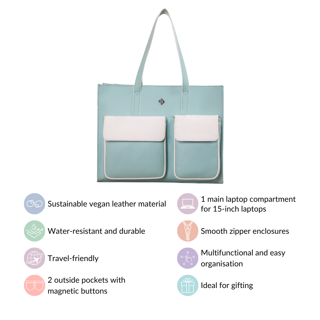 The stylish turquoise and white tote bag is a perfect blend of fashion and functionality. Made from sustainable vegan leather, this bag is not only chic but also eco-friendly. Its multifunctional design offers easy organization with a main laptop compartment suitable for 15-inch laptops, two outside pockets with magnetic buttons, and an inner zippered pocket for valuables. The bag is water-resistant and durable, ensuring your belongings stay safe in any weather. It comes with a removable external sling pouch and a detachable chain strap for versatile carrying options. The sling flap features a keychain holder, and smooth zipper enclosures make accessing your essentials effortless. This travel-friendly tote is a thoughtful gift choice, combining style, practicality, and sustainability.