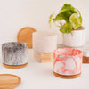 Succulent plant pots in marble patterns are ceramic plant pots that come in a matte finish. The colourful planters are available with a wooden base which helps in avoiding spillage when the succulents are watered. While the wooden bases can be used as trinket dishes, the planter can be used as a pen stand as well. Plants do not come along with the table planters.