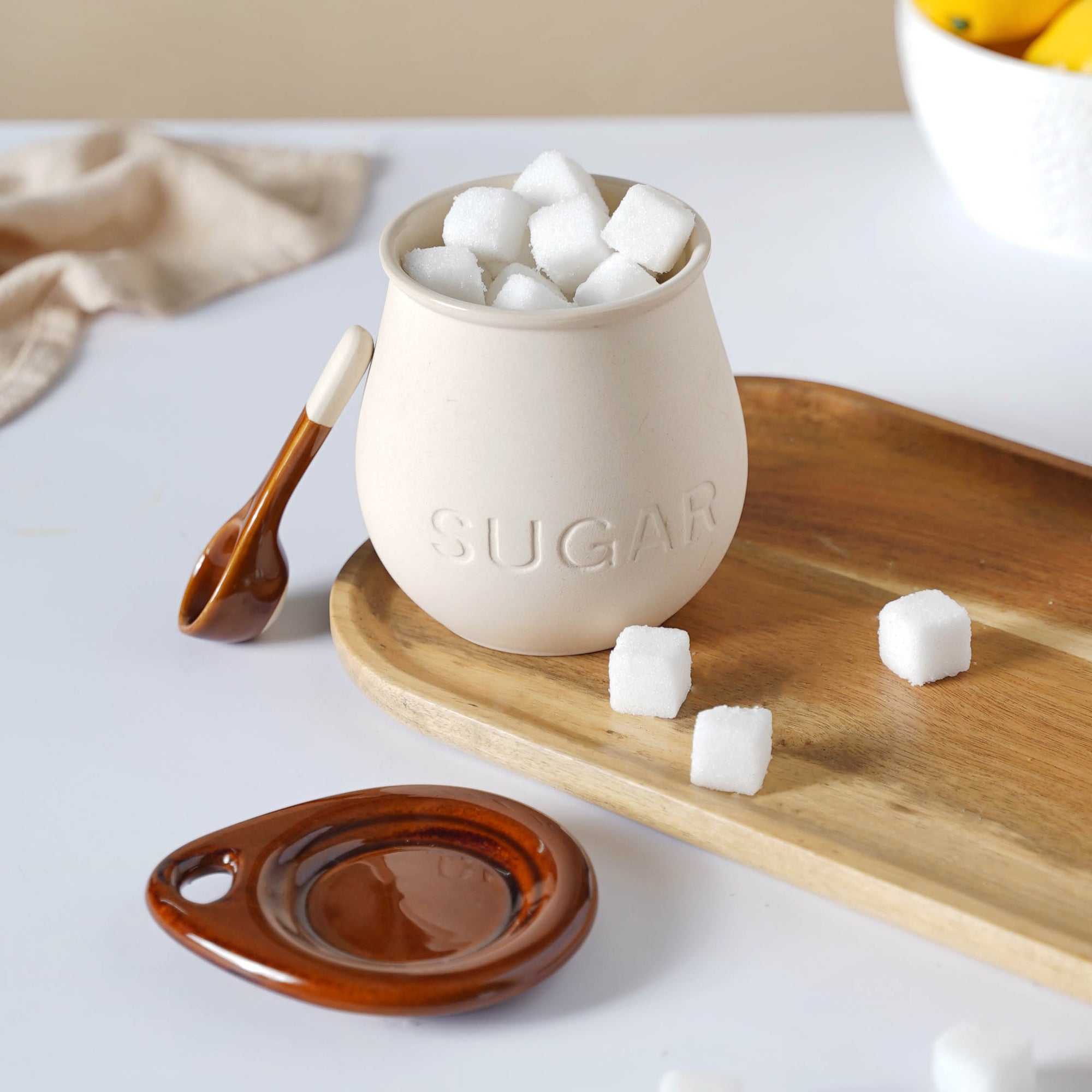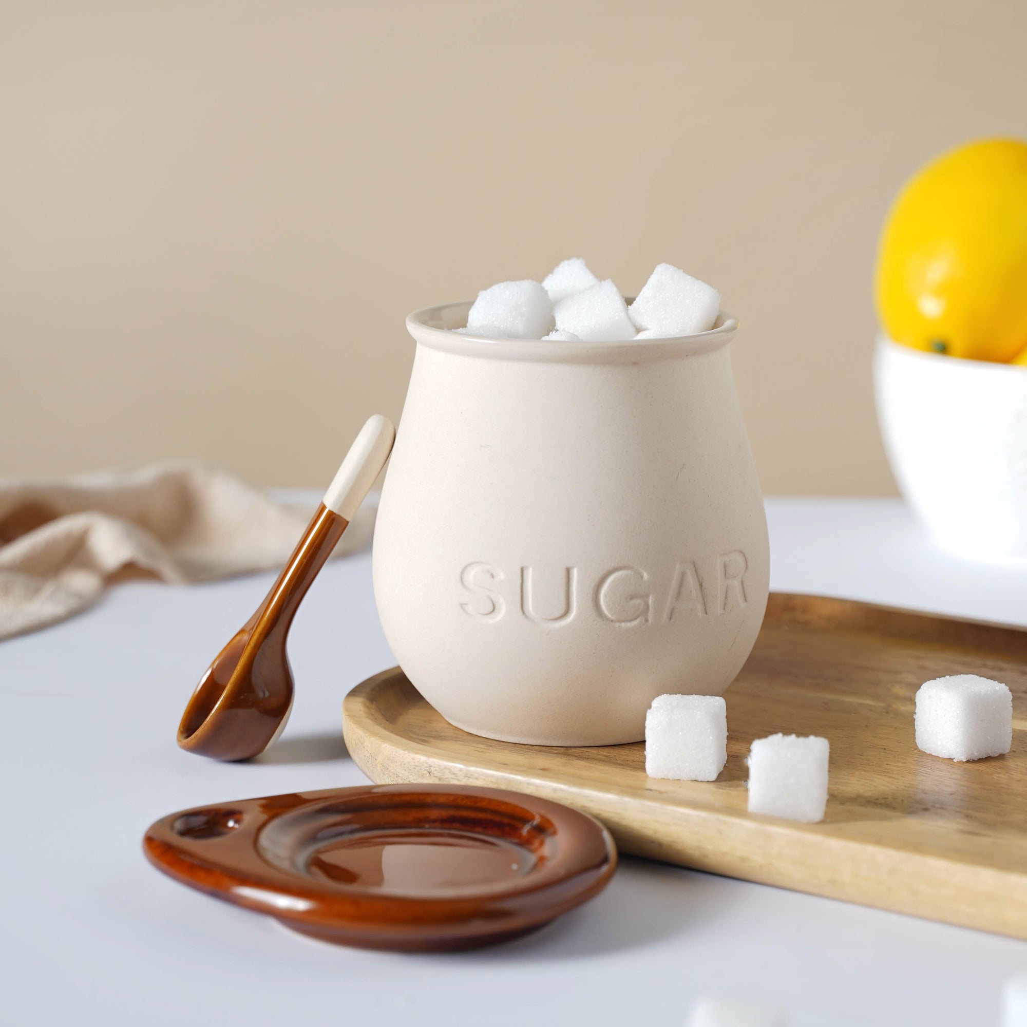 The ceramic sugar pot with a lid and spoon from the ceramicware collection is sure to add charm and appeal to the kitchen rack and the breakfast table. Adorning a dotted textured pattern on the pot and in the combination of cream with beige-brown, the sugar pot can innovatively be used to keep cereals on the breakfast table. The neat lid design features a small cavity so that a spoon can be placed in it. Make a set of the sugar pot with a milk pot and adorable cups to gift on a housewarming or get-together and it's always better to serve the sugar separately while offering tea or coffee keeping in mind one's guests' preferences.
