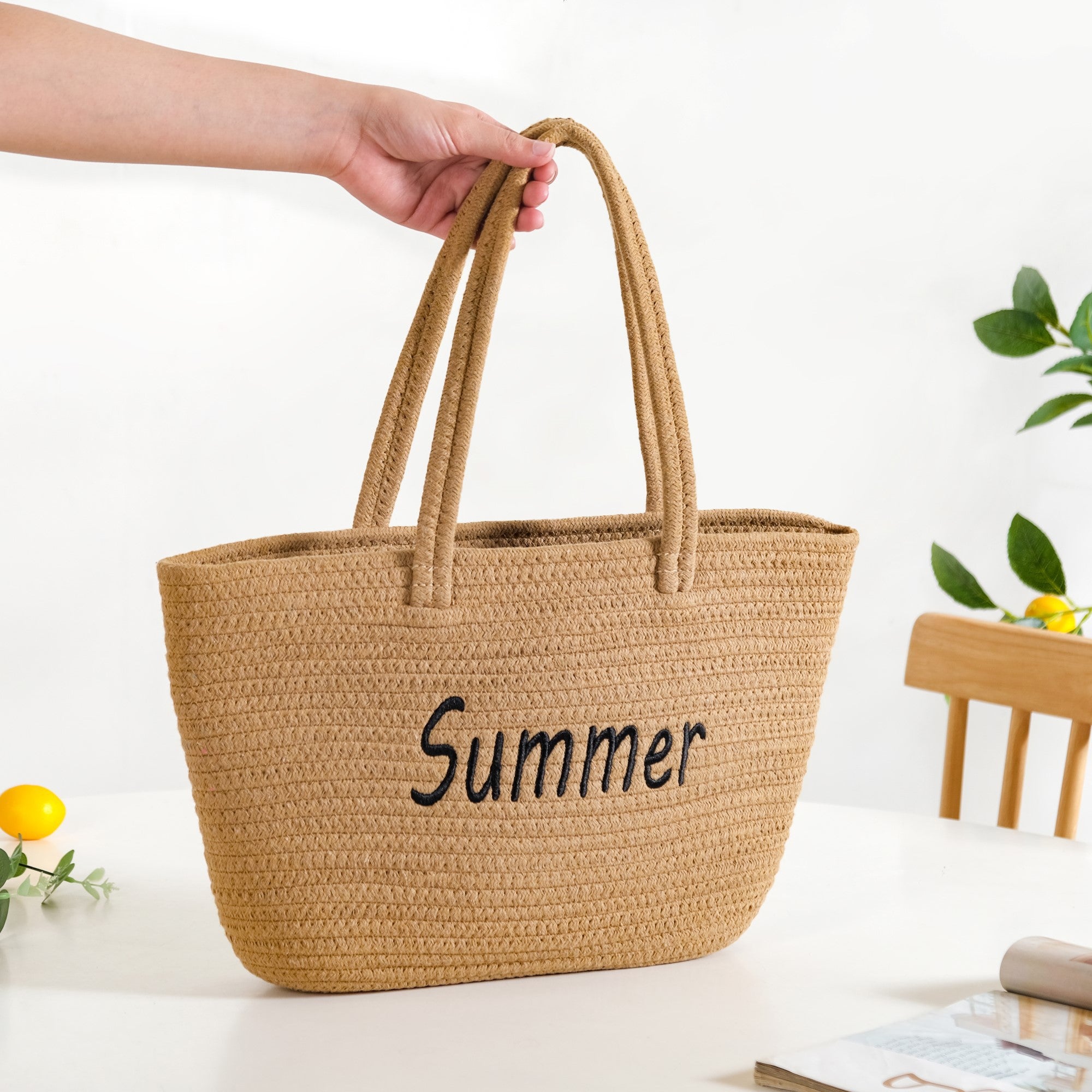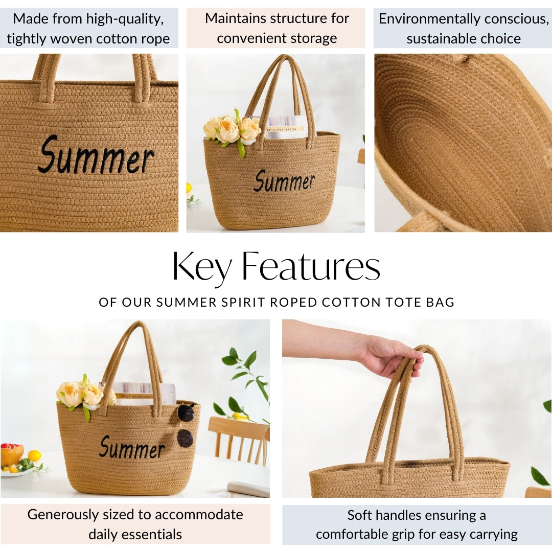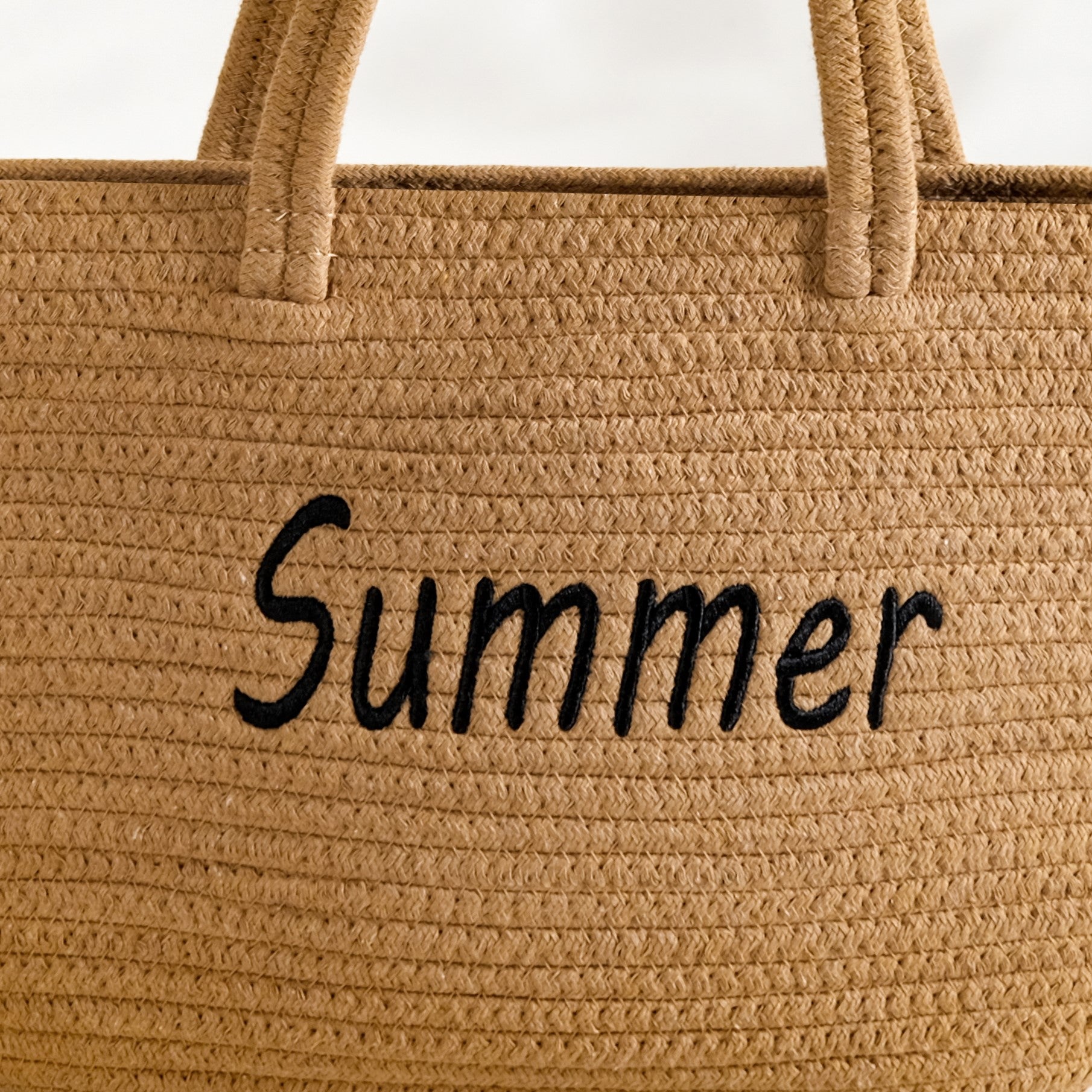 Design: Drenched in warm beige, this tote embodies the essence of sun-kissed adventures. The bold "Summer" embroidery adds a playful charm, making it the ideal statement piece for your seasonal wardrobe. Crafted with a tightly woven, roped cotton texture, the bag exudes a natural, rustic appeal while ensuring durability. The intricate rope pattern enhances its artisanal beauty, while the sturdy twin handles provide both function and fashion.