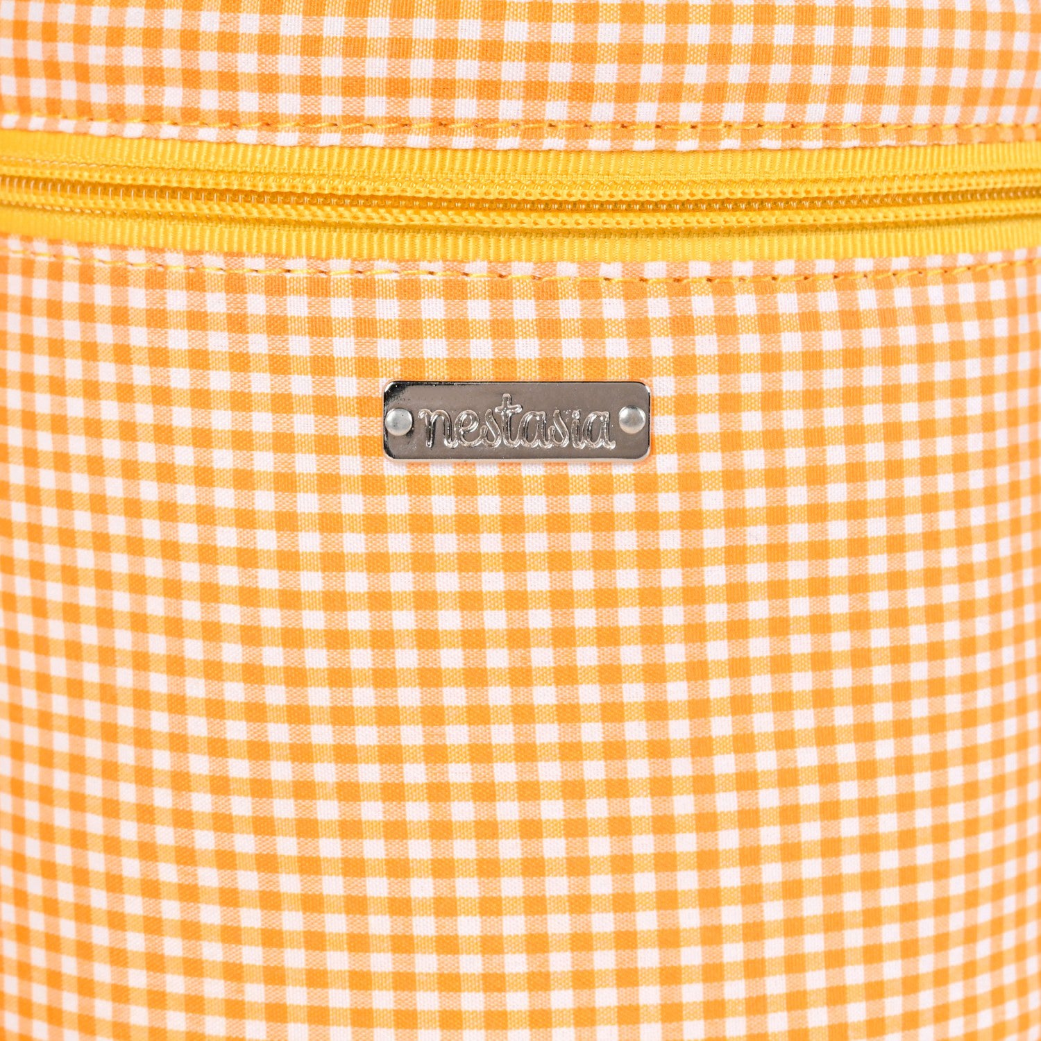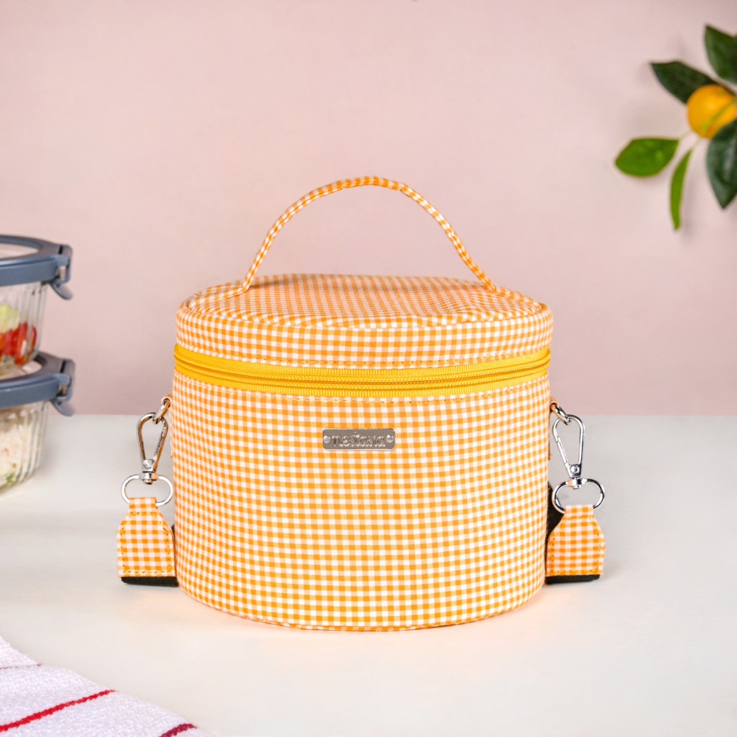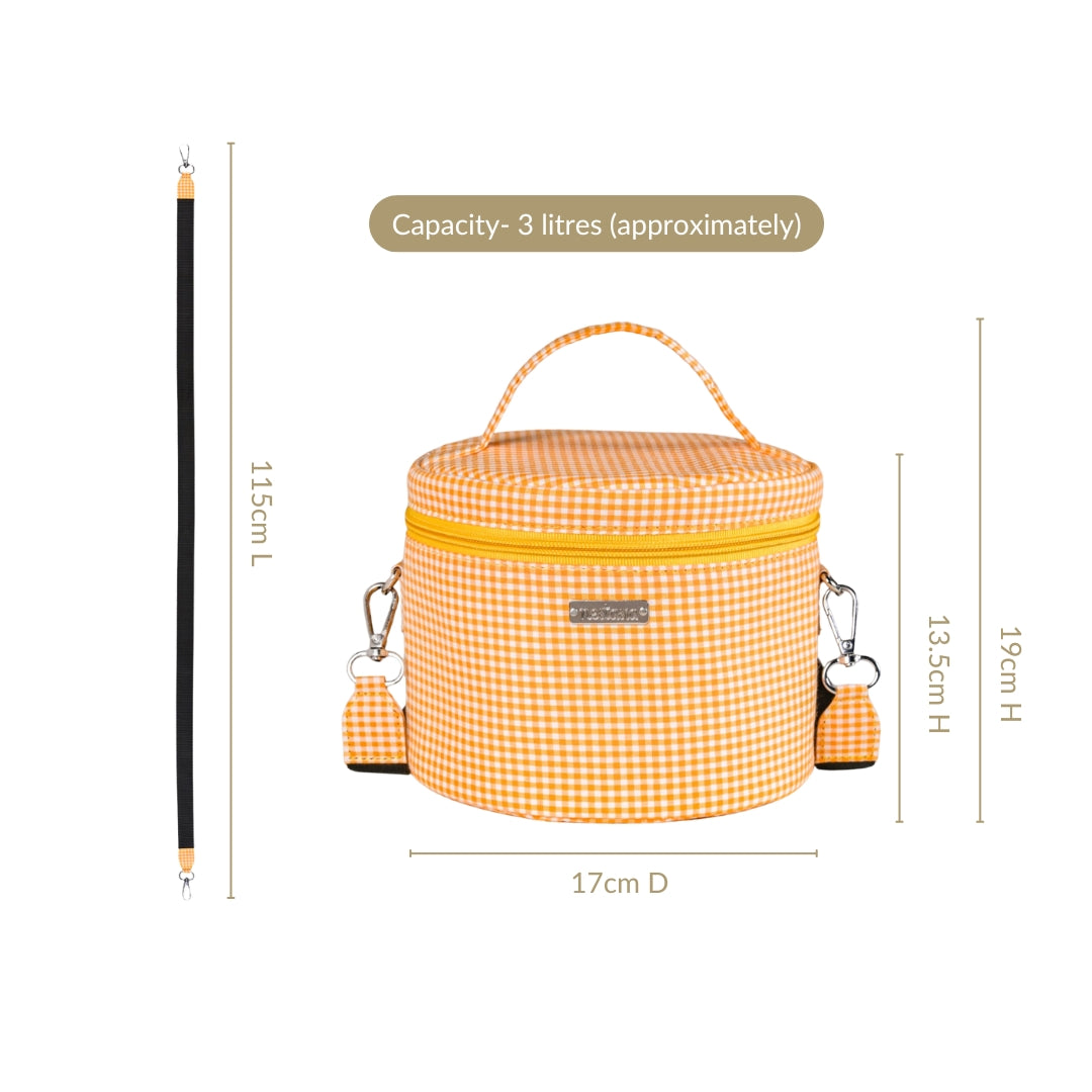 Design: This circular lunch bag has a sunny yellow and white checkered pattern. It features a strong handle and a detachable shoulder strap for easy carrying. The smooth zipper is easy to open and close, revealing a spacious and insulated interior that is ready for your meal.