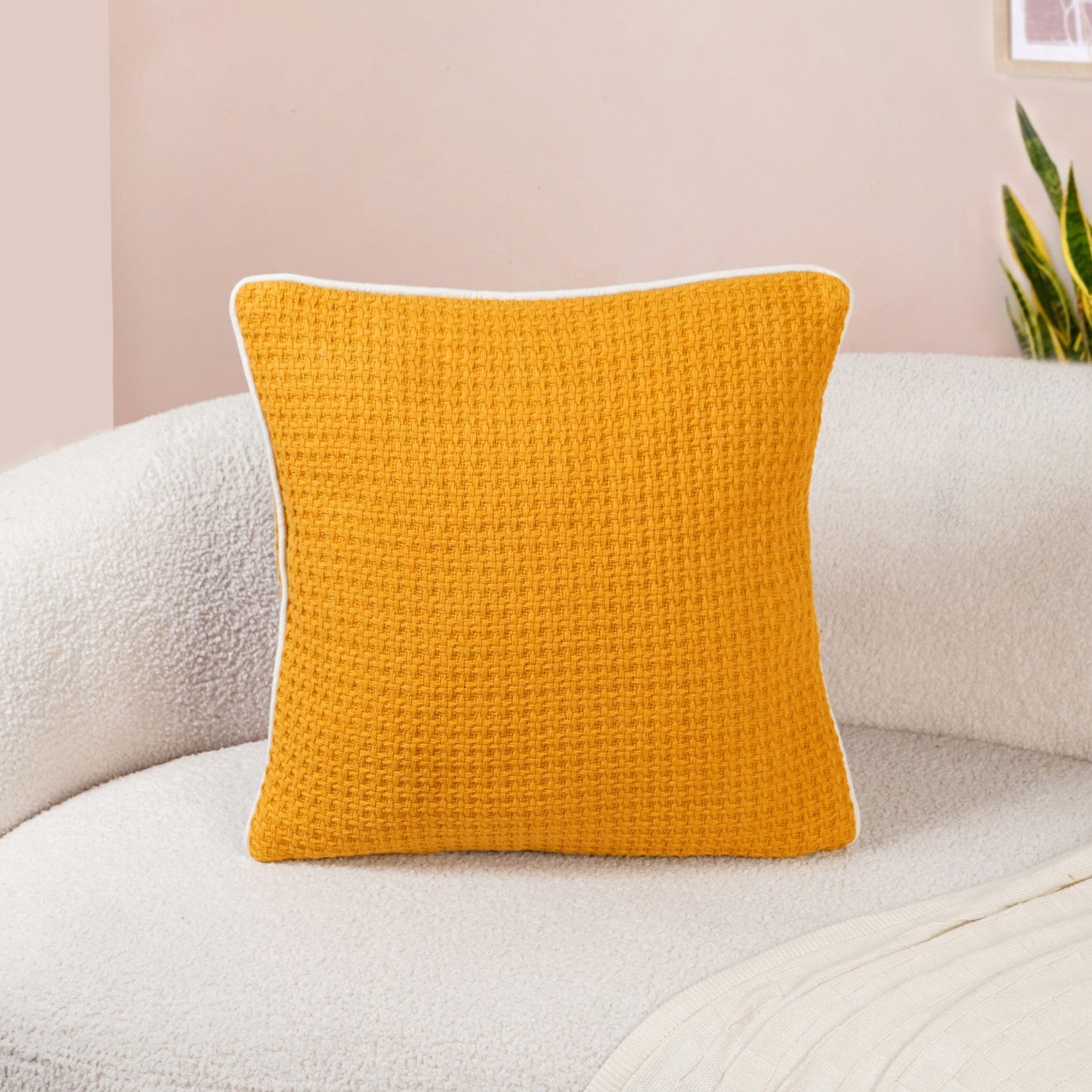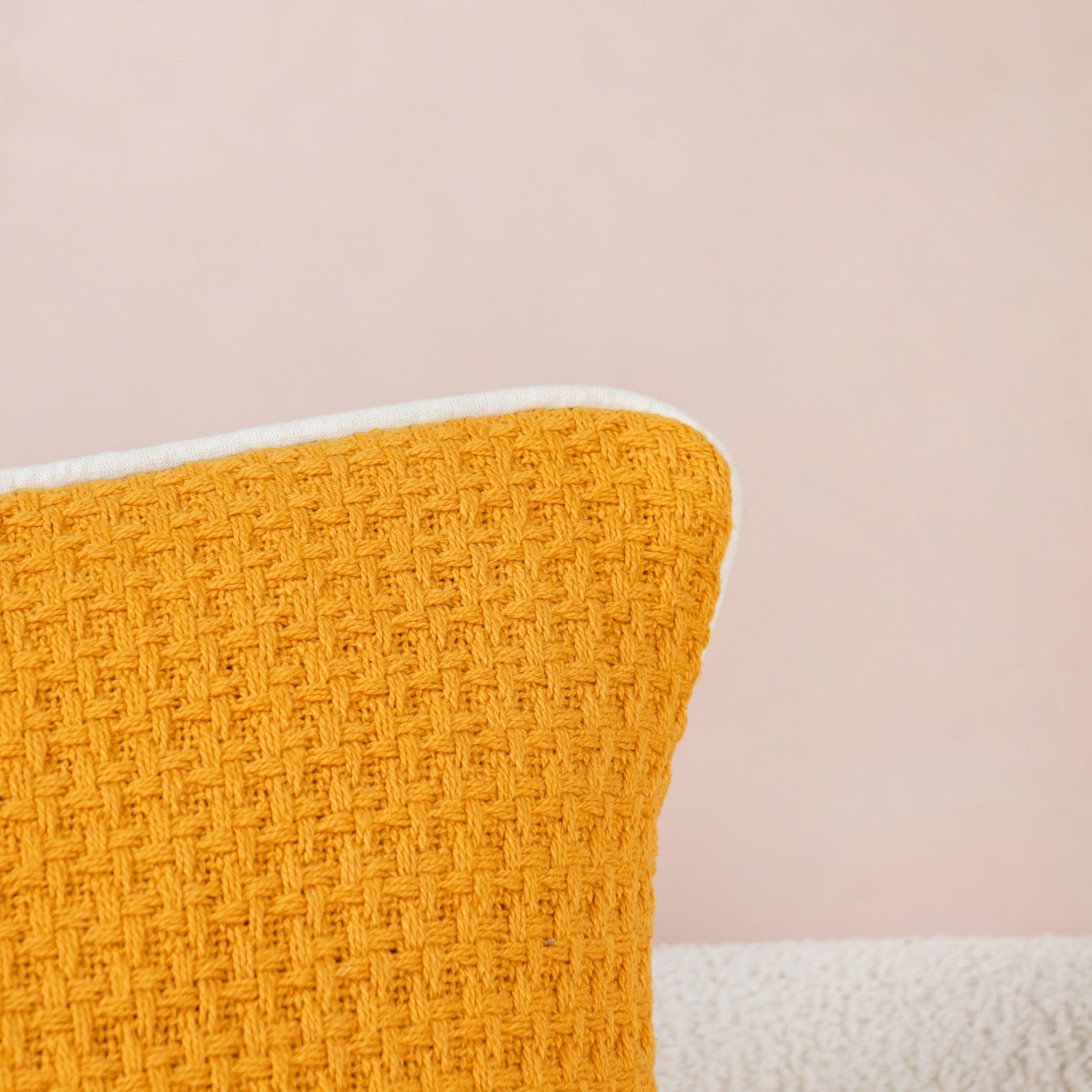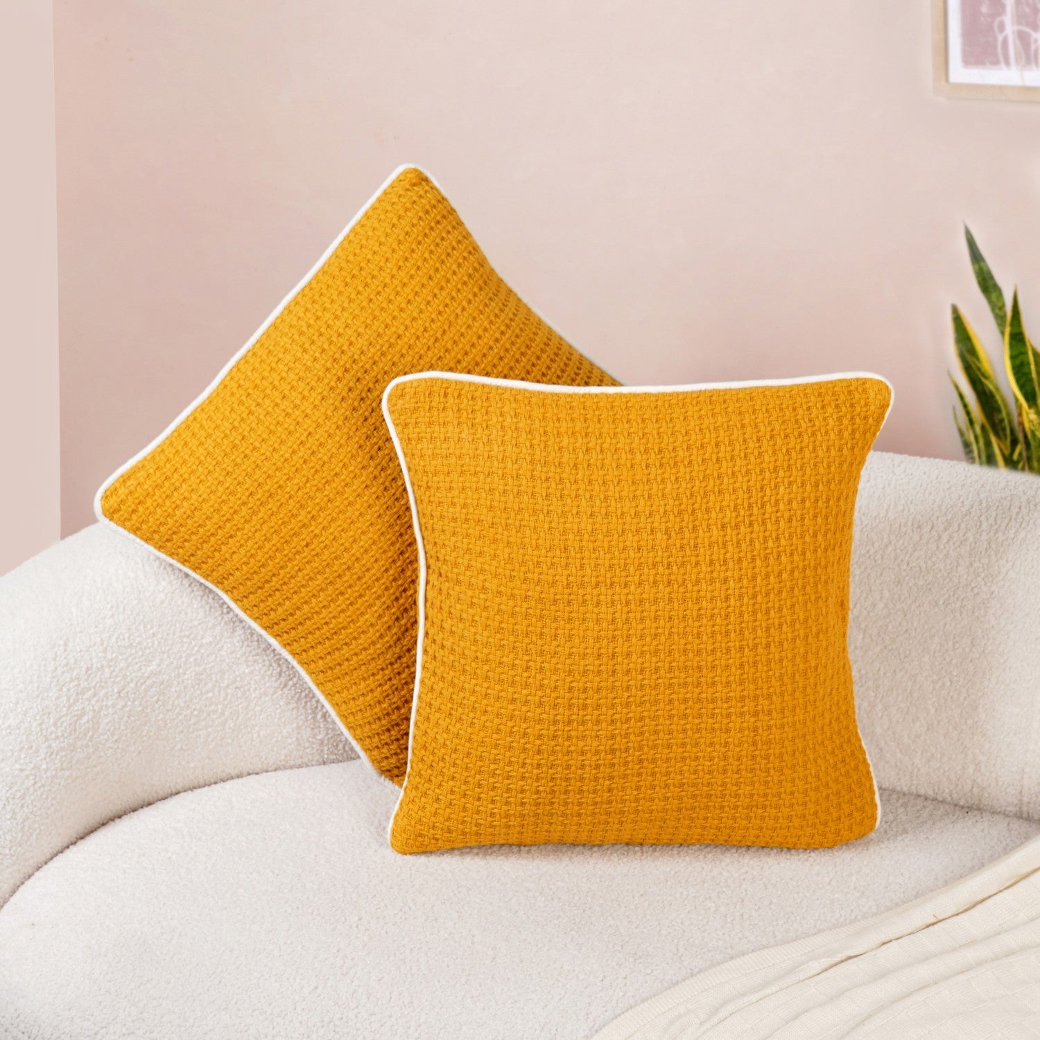 Design: Crafted from thick, high-quality cotton, this cushion cover set is all about strong form and bold contrast. The mustard yellow base features a heavy woven texture that feels rich and weighty without compromising on softness. Each cushion cover is neatly framed with a wide white border that gives it a clean, defined edge and adds a structured look to any arrangement. The surface has a subtle texture thanks to the woven pattern, which also helps it stand out visually while still pairing well with other fabrics. A concealed zipper in a matching shade of yellow tucks away discreetly for a seamless look. Sized to fit standard couch cushion covers, the square shape sits perfectly on accent chairs, beds, and sofa cushions alike.