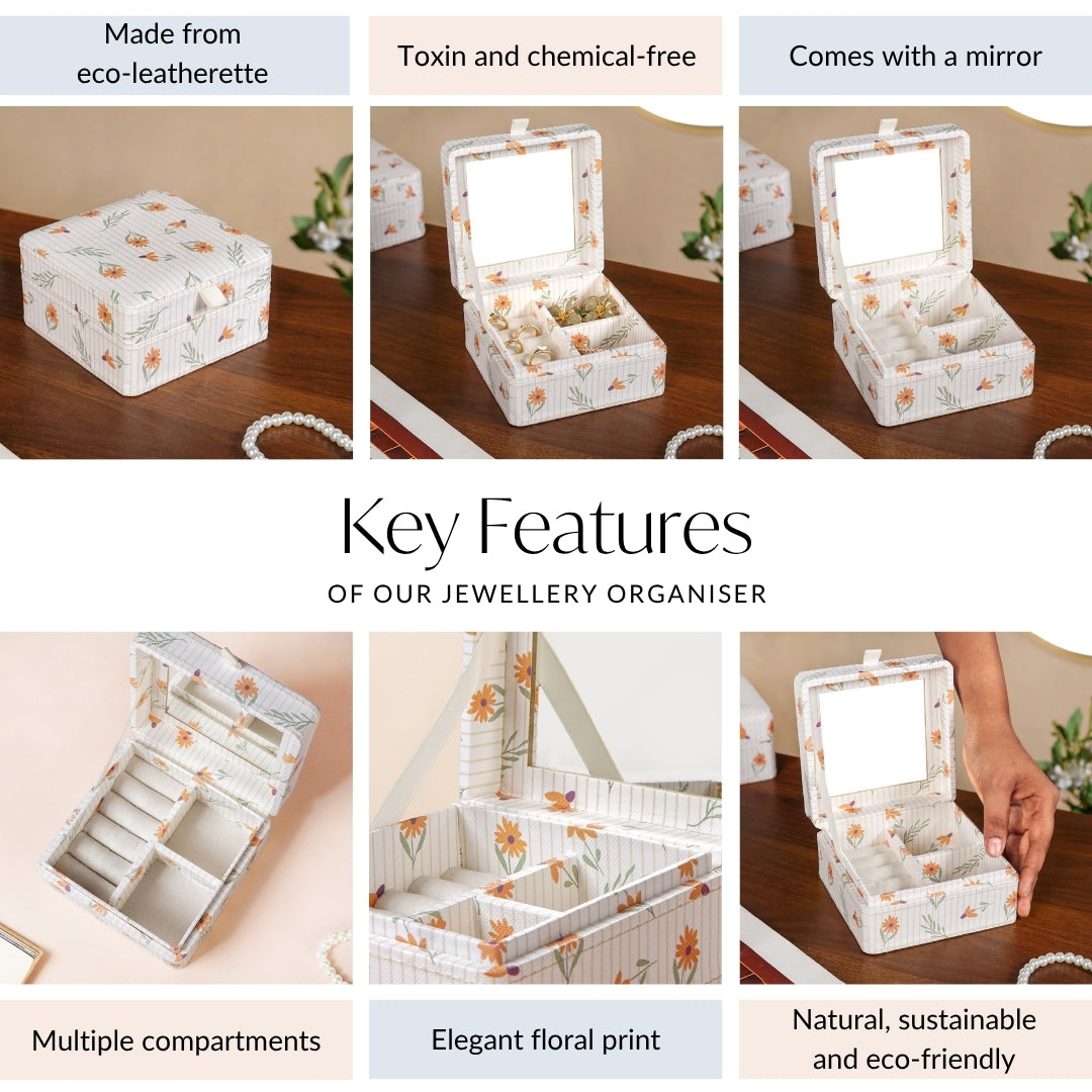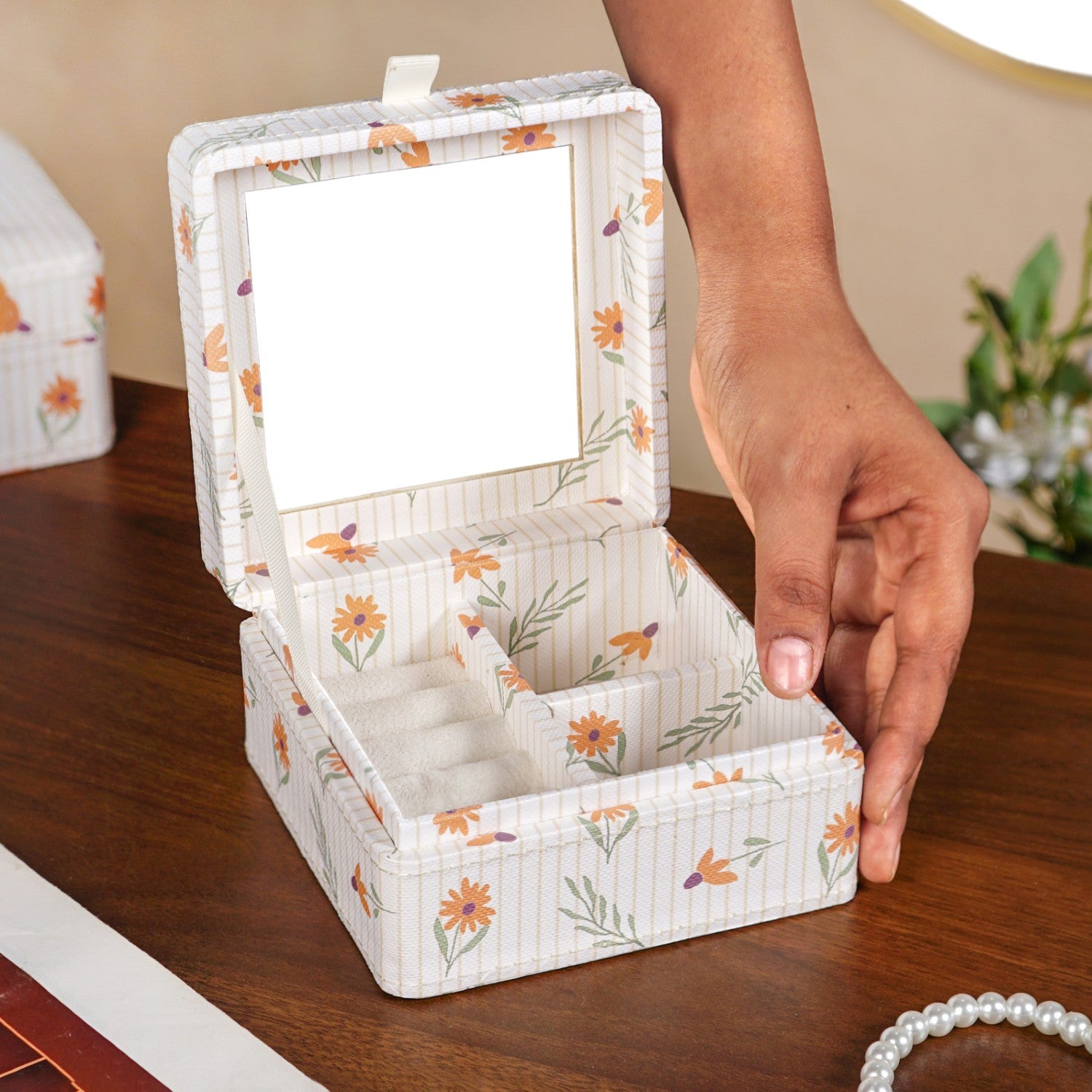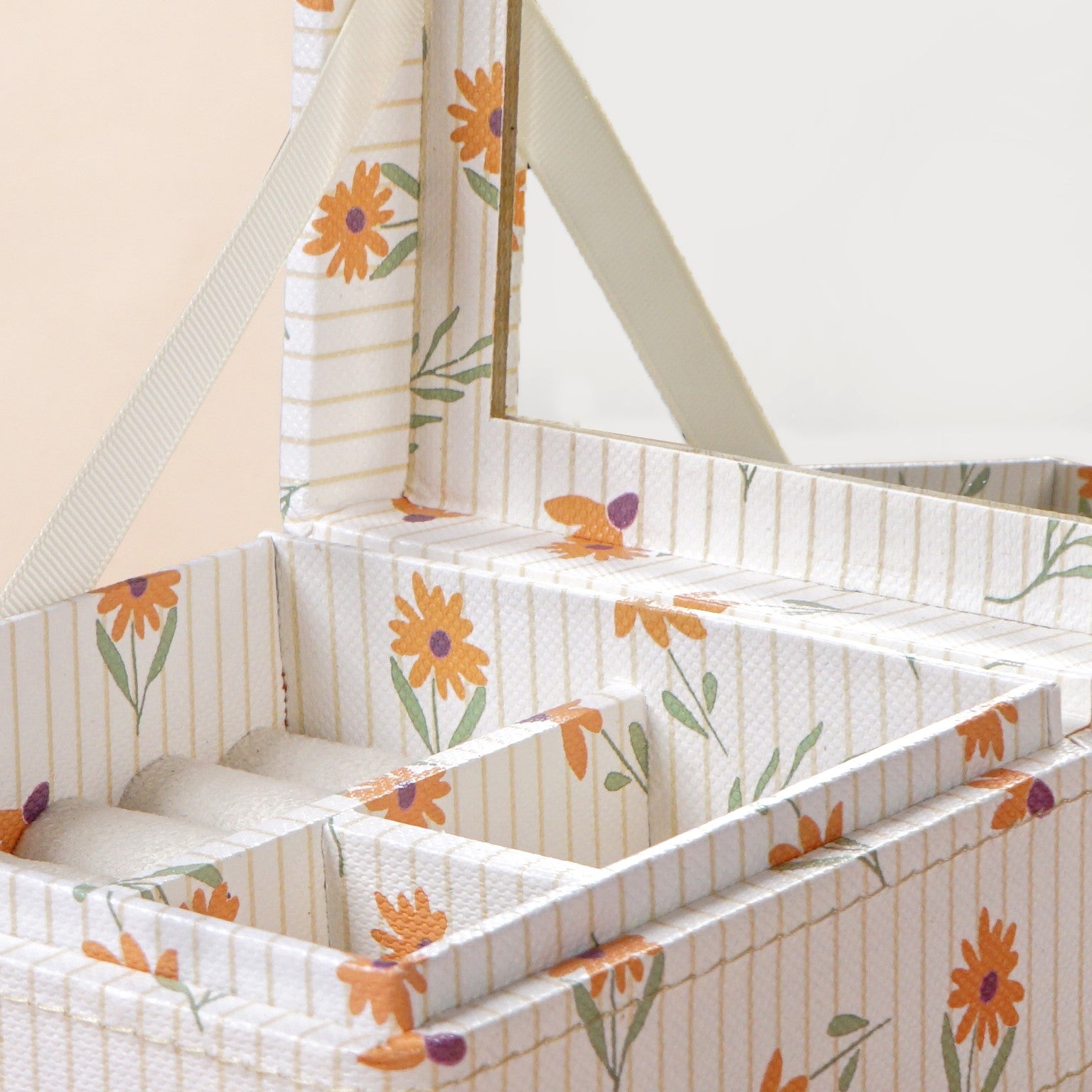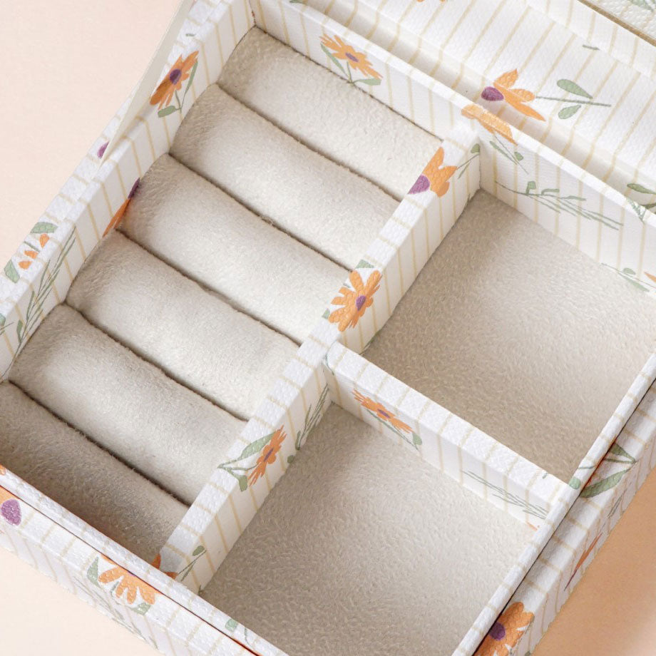 Design: The box is wrapped in a light cream base with vertical golden stripes, adorned with hand-drawn floral motifs in orange, green, and hints of plum. The playful daisy-like flowers add a warm, vintage charm. Inside, five cushioned ring slots, two square compartments, and one larger space allow for well-planned storage of rings, earrings, chains, and trinkets. This jewellery box also consists of a mirror and a ribbon piece to help open the box.