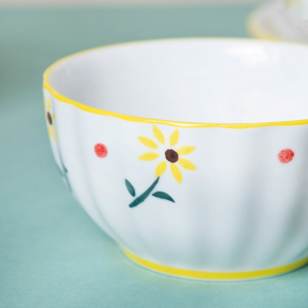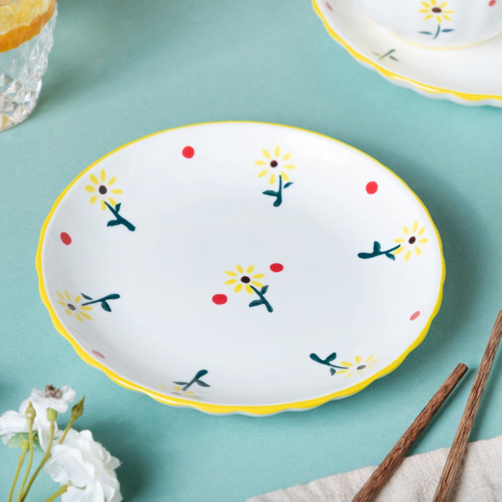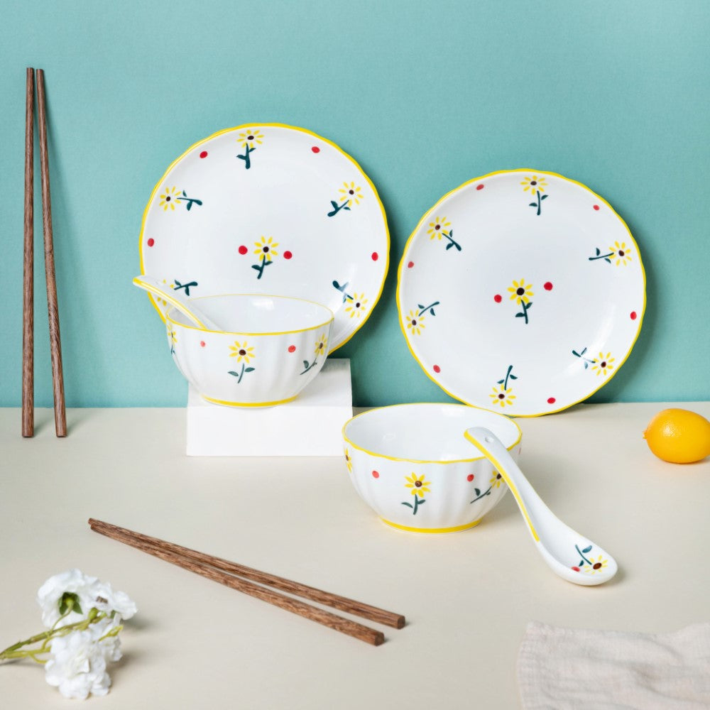 Sunflower dinner set of 8 pieces that have bright yellow flower prints and tiny red dots printed on them against a polished white surface makes for a great pasta/snack/dinner set. The dinner set comprises of 2 dinner plates, 2 soup bowls with 2 soup spoons, and 2 sets of chopsticks. Perfect for a family of two, the crockery set is bound to brighten up any table setting with its dazzling flower design.