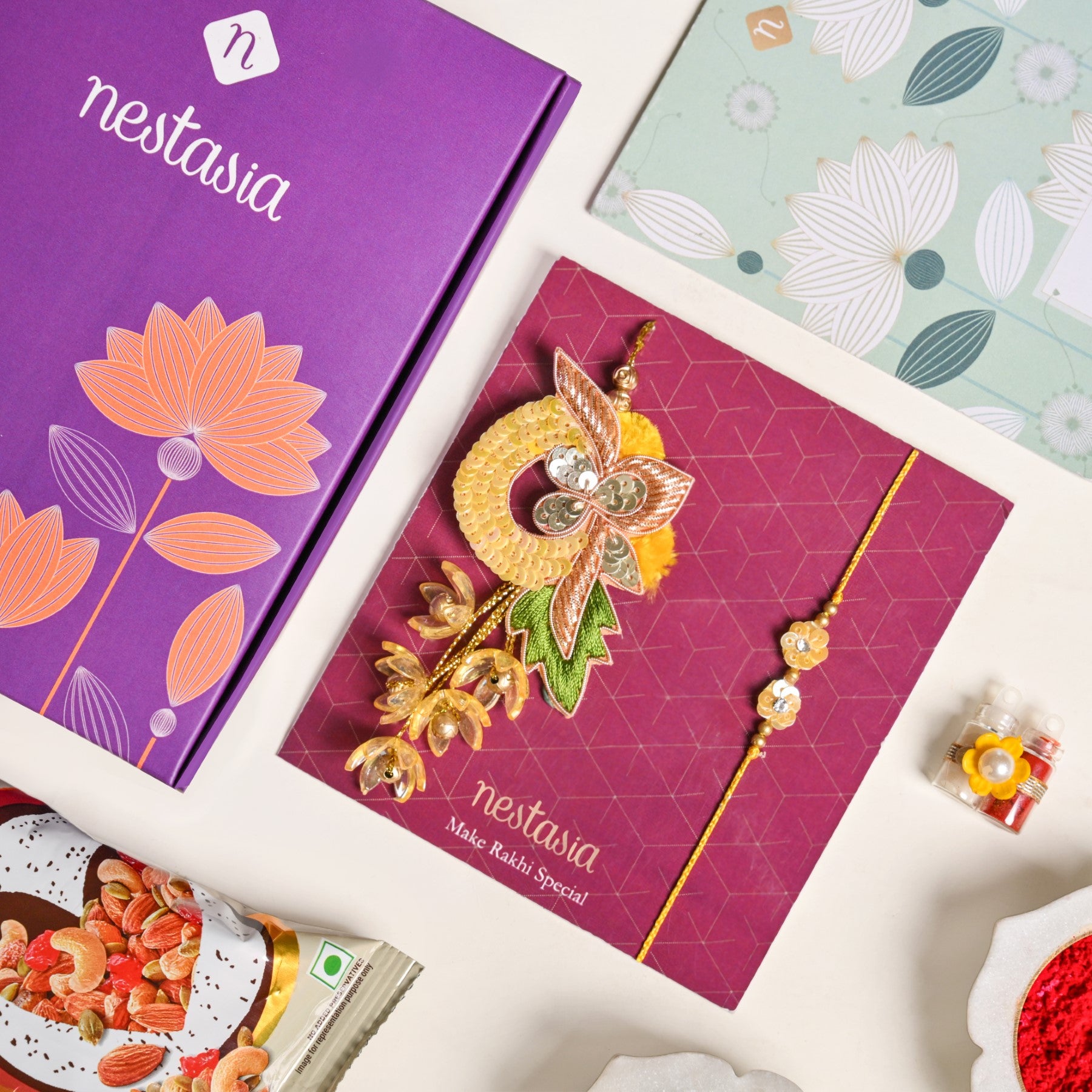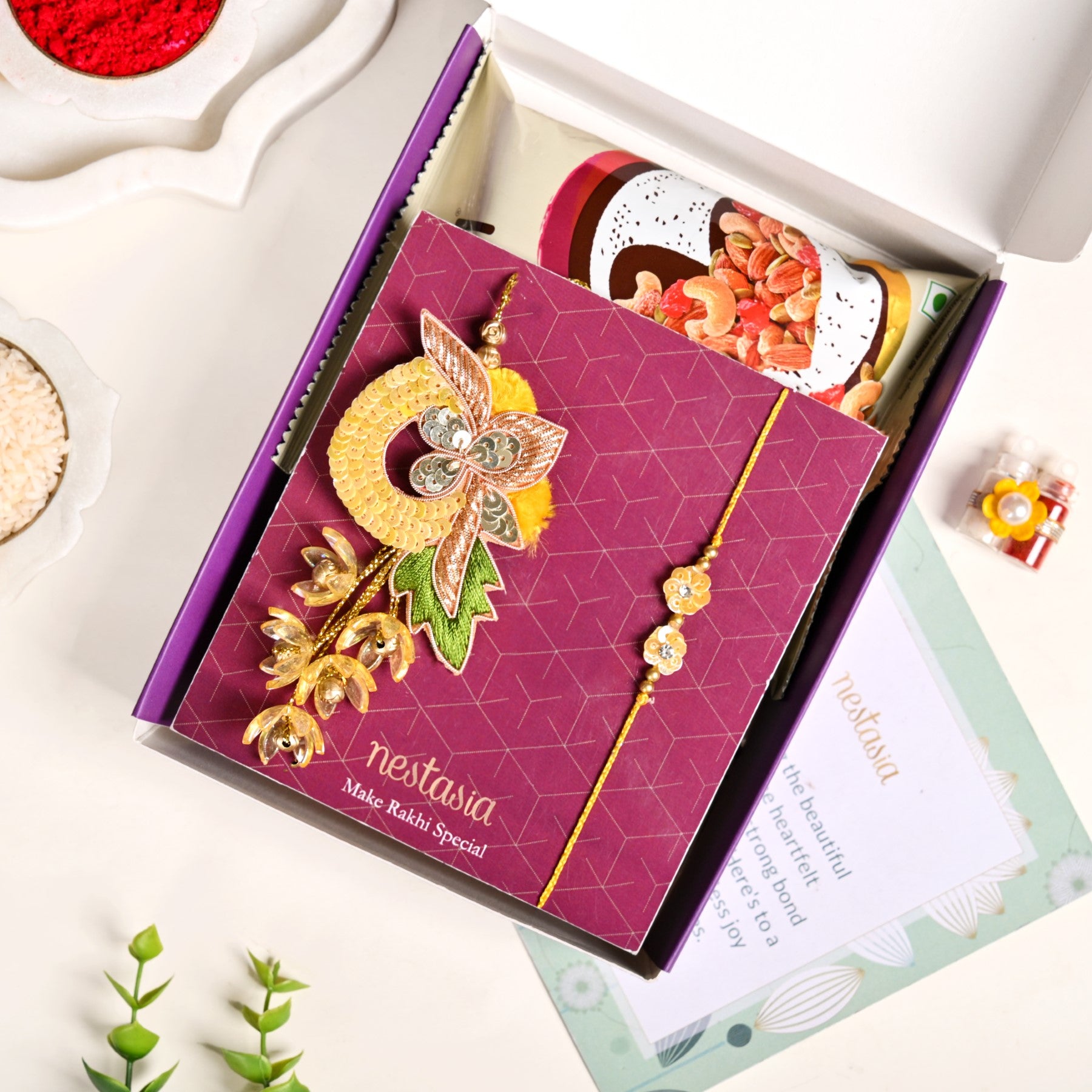 A radiant blend of yellow, gold, and olive green, this Rakhi features sequin flowers on a bright yellow thread. The lumba is a statement piece with layered fabric florals, sequin embroidery, and glossy golden bells cascading like petals in bloom. The set includes 1 rakhi band & 1 lumba, 1 roli chawal bottle set, 1 pack of mixed dry fruits (free gift), 1 gift box, and 1 wish card.