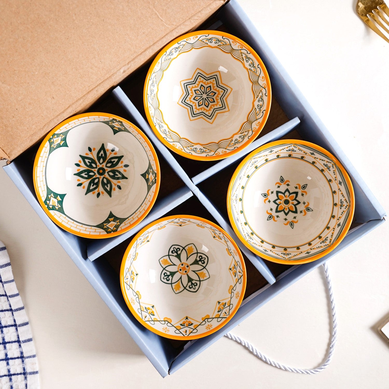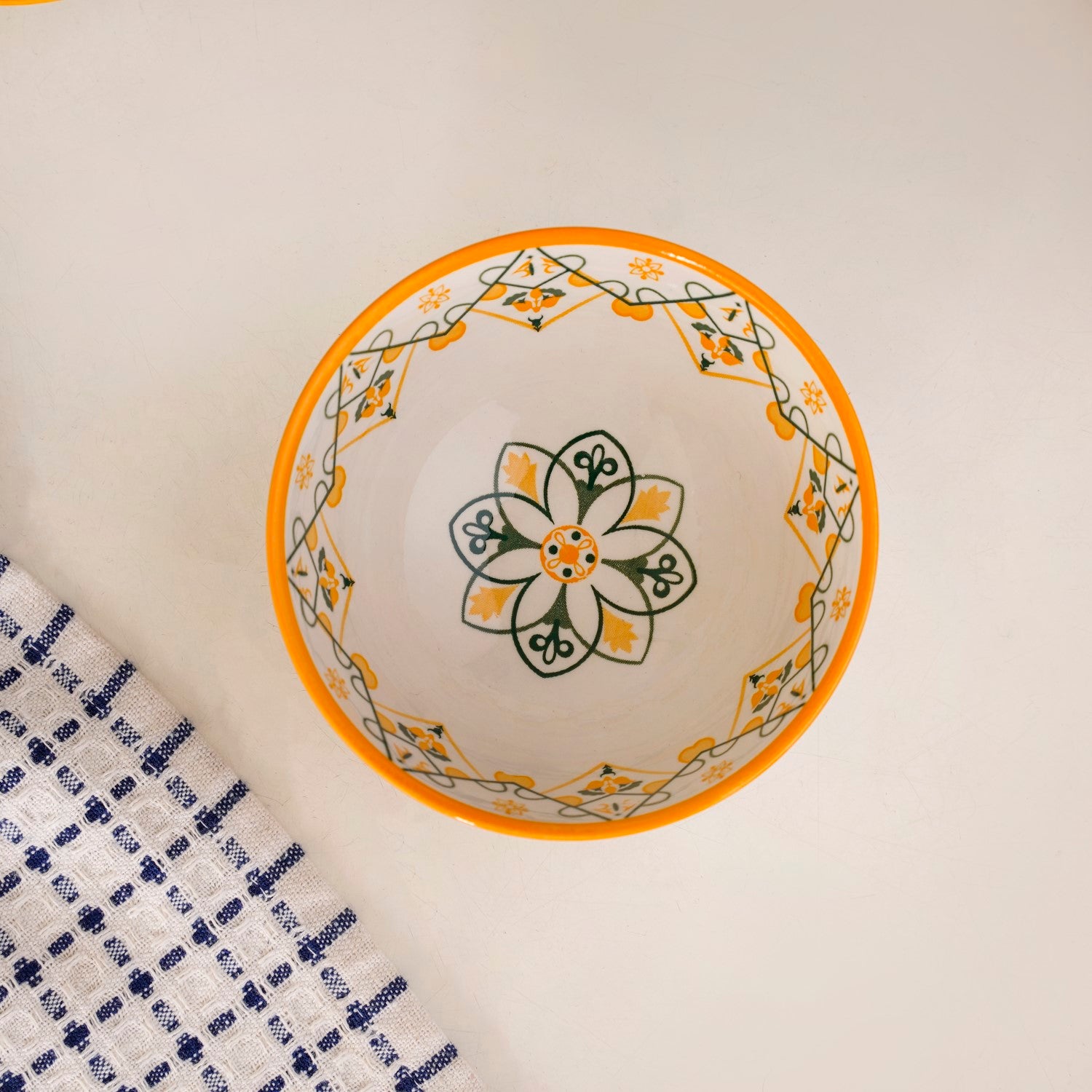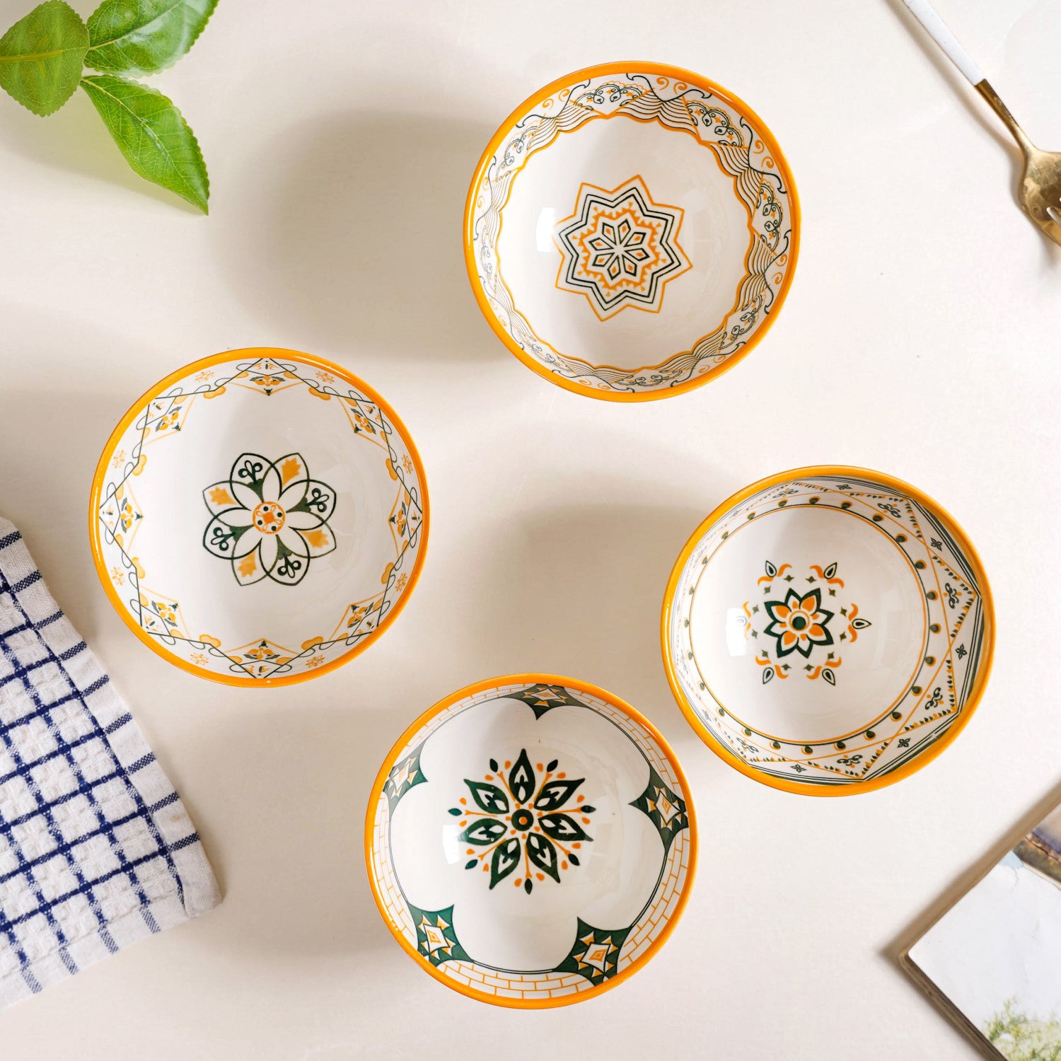 Design: This ceramic snack bowl set blends cohesive design with individual charm, featuring a mix of geometric and floral motifs in a warm palette. Each off-white bowl has a textured exterior and is adorned with intricate mustard yellow, deep green, and light green patterns. A bold yellow rim adds vibrancy, while the symmetrical designs draw inspiration from traditional Mediterranean aesthetics, balancing cultural richness with modern elegance.