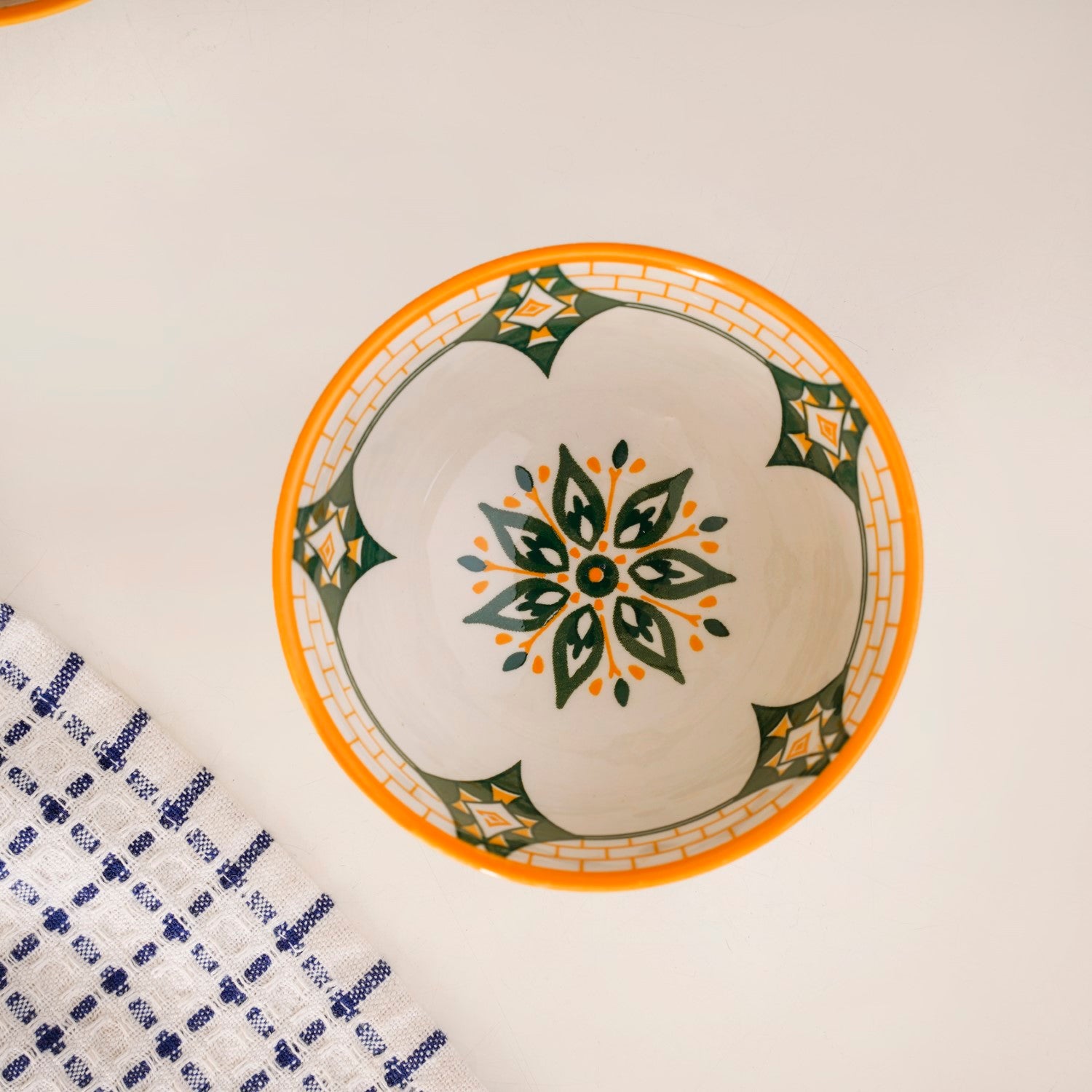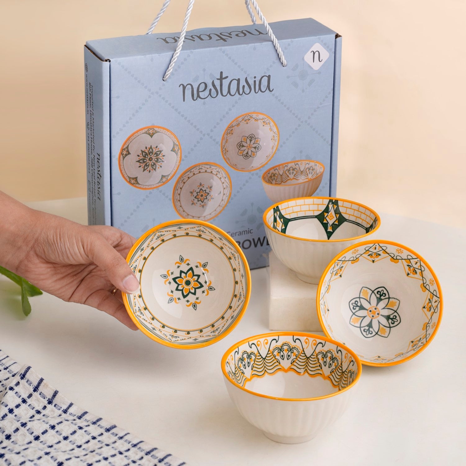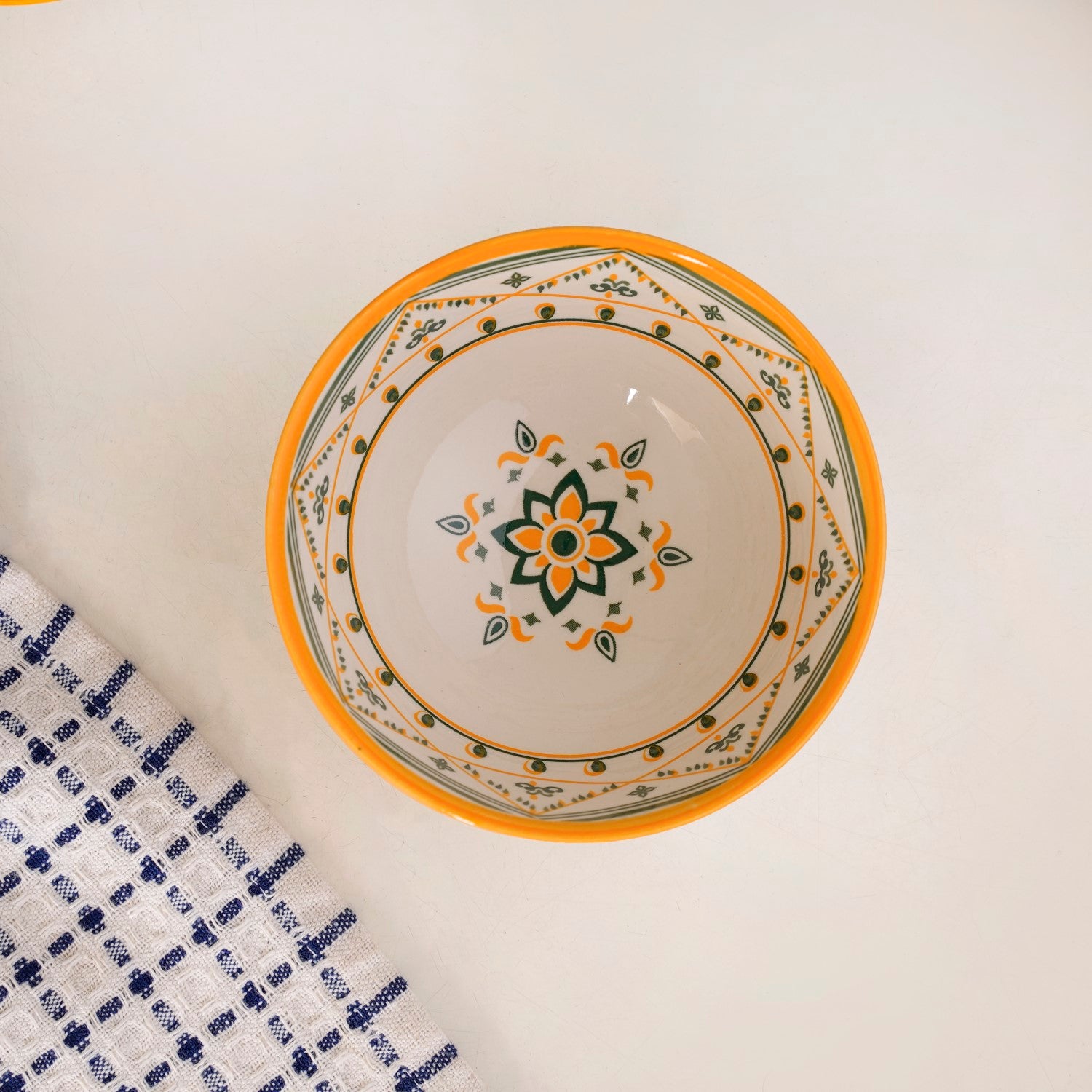Design: This ceramic snack bowl set blends cohesive design with individual charm, featuring a mix of geometric and floral motifs in a warm palette. Each off-white bowl has a textured exterior and is adorned with intricate mustard yellow, deep green, and light green patterns. A bold yellow rim adds vibrancy, while the symmetrical designs draw inspiration from traditional Mediterranean aesthetics, balancing cultural richness with modern elegance.