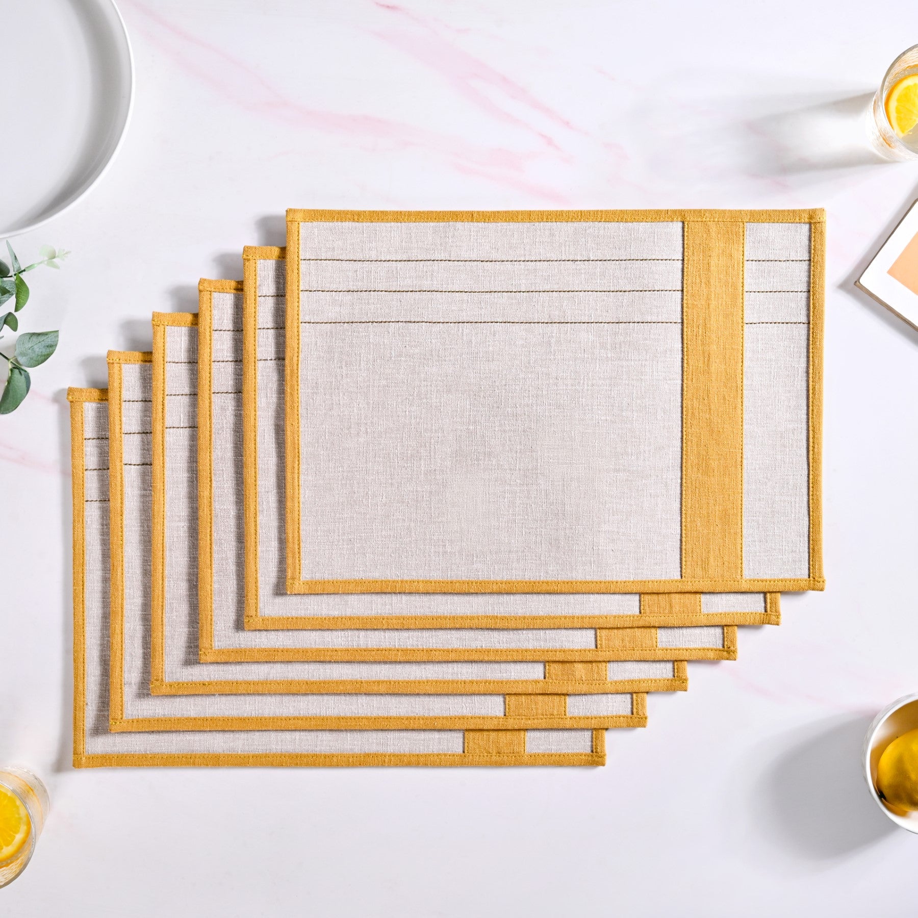 Design: This cotton-slub table mat showcases a natural beige base with subtle horizontal stitch detailing for a clean, structured look. A contrasting mustard-yellow side panel and matching piping frame the design, giving it a modern, dual-tone aesthetic that blends everyday elegance with a rustic touch, perfect for enhancing any dining setup.