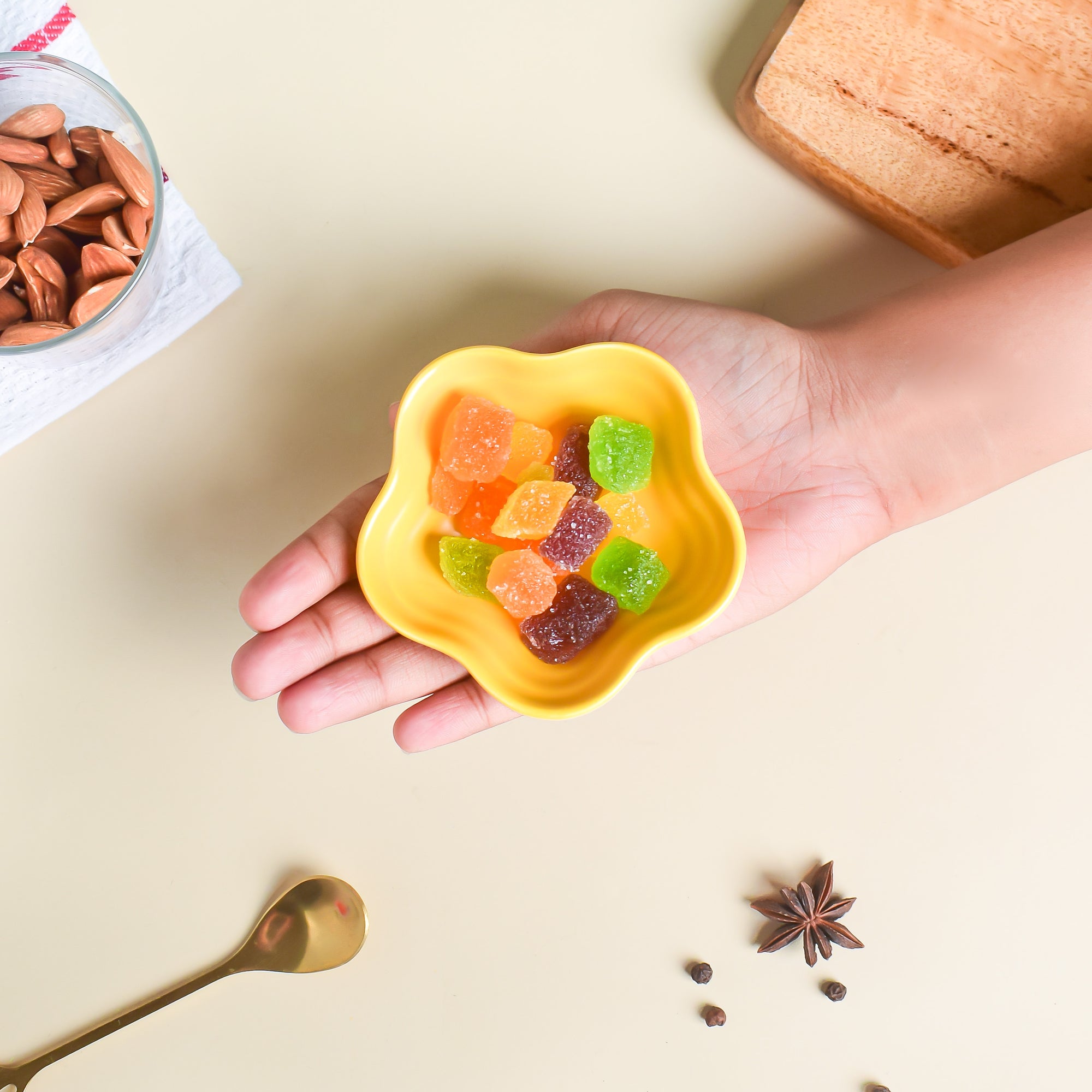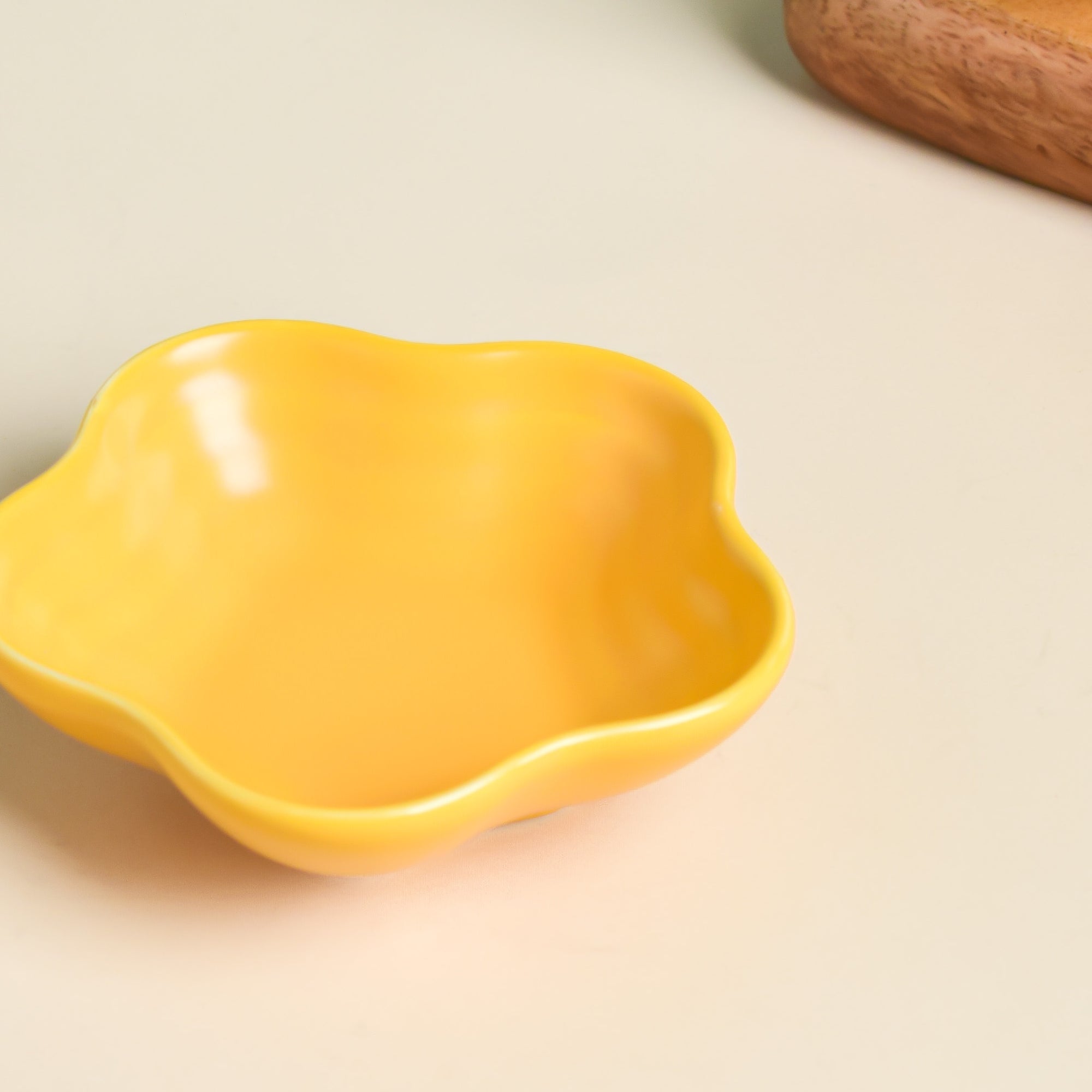 On any table, whether it's a dining table or a coffee table, the one-of-a-kind ceramic dip bowl will stand out. Since it is microwave safe, as well as dishwasher and oven safe, the sunny side up yellow ceramic dip bowl can be used to serve chutney and dip as well as a warm dipping sauce. The dip bowl can be used to serve sauces with fast snacks while having an evening tea or coffee. The scalloped interior of the yellow dip bowl was meticulously made, showcasing the attention to detail that went into it.