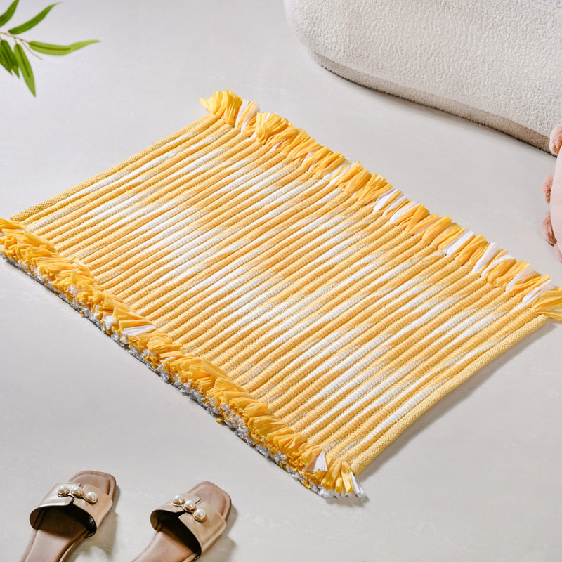 Design: Radiating joyful energy, this handcrafted floor mat is an eye-catcher with its distinctive ribbed weave. The structured pattern features alternating rows of bright yellow and crisp white bands expertly handwoven to create a rhythm of raised textures that feel as good as they look. Each stripe forms a plump channel that offers a visual break, adding depth to the surface. Long, soft tassels at both ends finish the piece with a playful edge, perfect for homes that love cosy, thoughtful details.