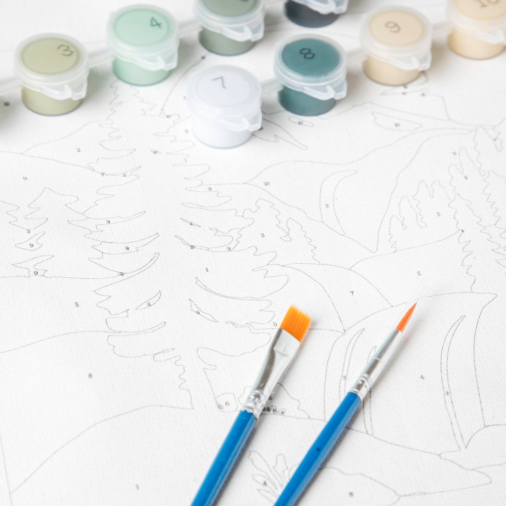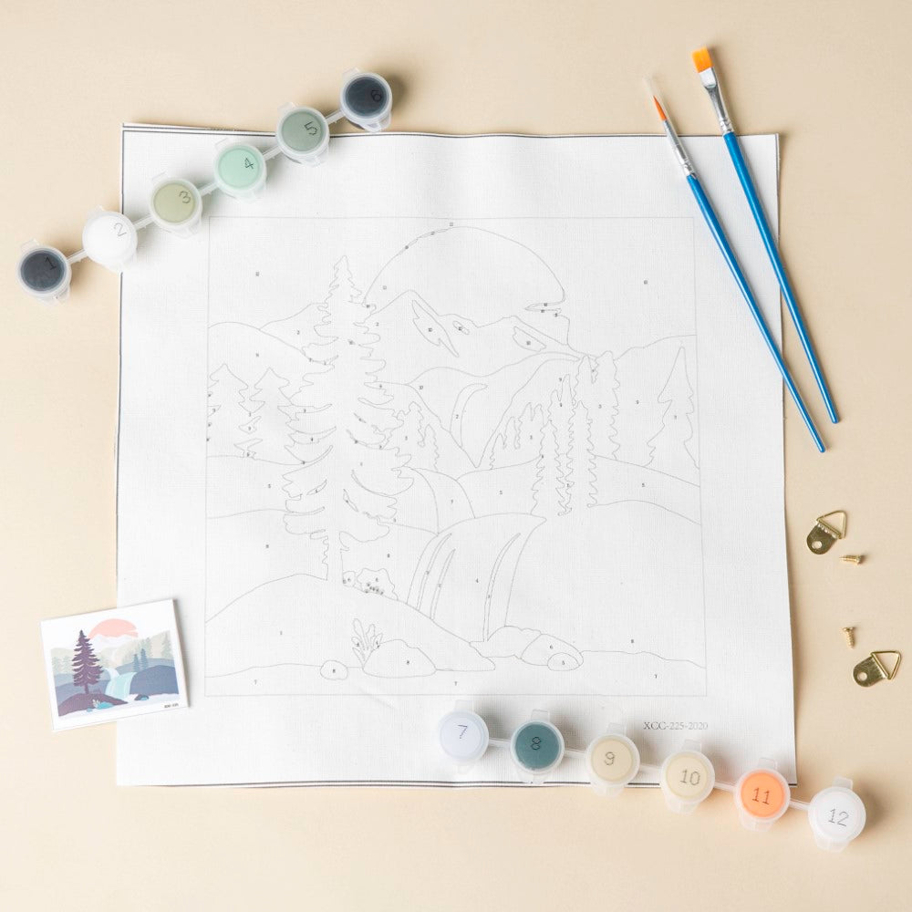 Recreate the painting and showcase the minimalist painted landscape in a contemporarily designed household to enhance the modern decor. The DIY painting's outline on the canvas has been divided into numbered sections that need to be painted with the corresponding colours that each feature a number label. The end result is a magnificent art piece that makes a brilliant gifting option as well as a decor accent.