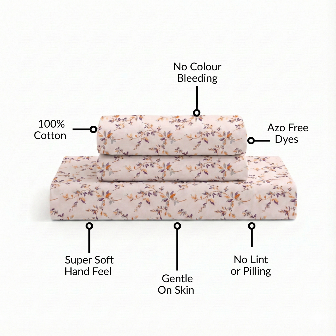 Design: The bed linen set includes a beautiful queen-sized sheet and two perfectly matching pillowcases, featuring delicate, winding floral vines. The sophisticated colour palette blends rich purple, vibrant rustic orange, mellow blue-grey, and cheerful yellow against a bright white backdrop, creating a truly charming and elegant garden aesthetic.