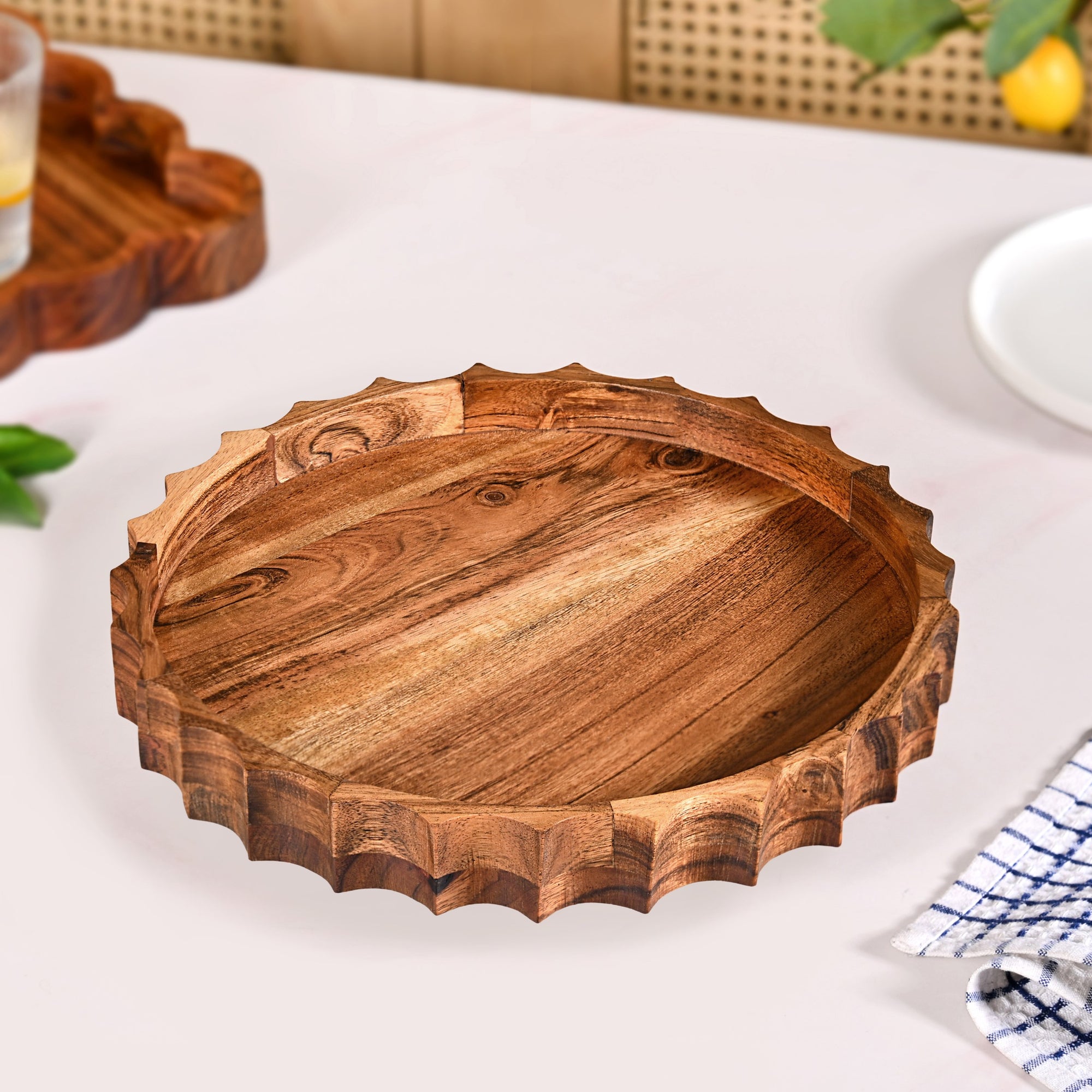 Design: Crafted from durable acacia wood, this wooden platter highlights natural grains and warm brown tones that give it a rich, earthy appeal. The round shape makes it ideal as a serving tray, while the smooth finish adds to its elegance. What sets it apart is the scalloped, sun-inspired border, creating a radiant look that doubles as a functional detail. The raised edges prevent items from slipping, giving this wooden decorative tray both artistic charm and everyday practicality. Made from 100% natural acacia wood, use a damp cloth to wipe and let it air dry for long-lasting use