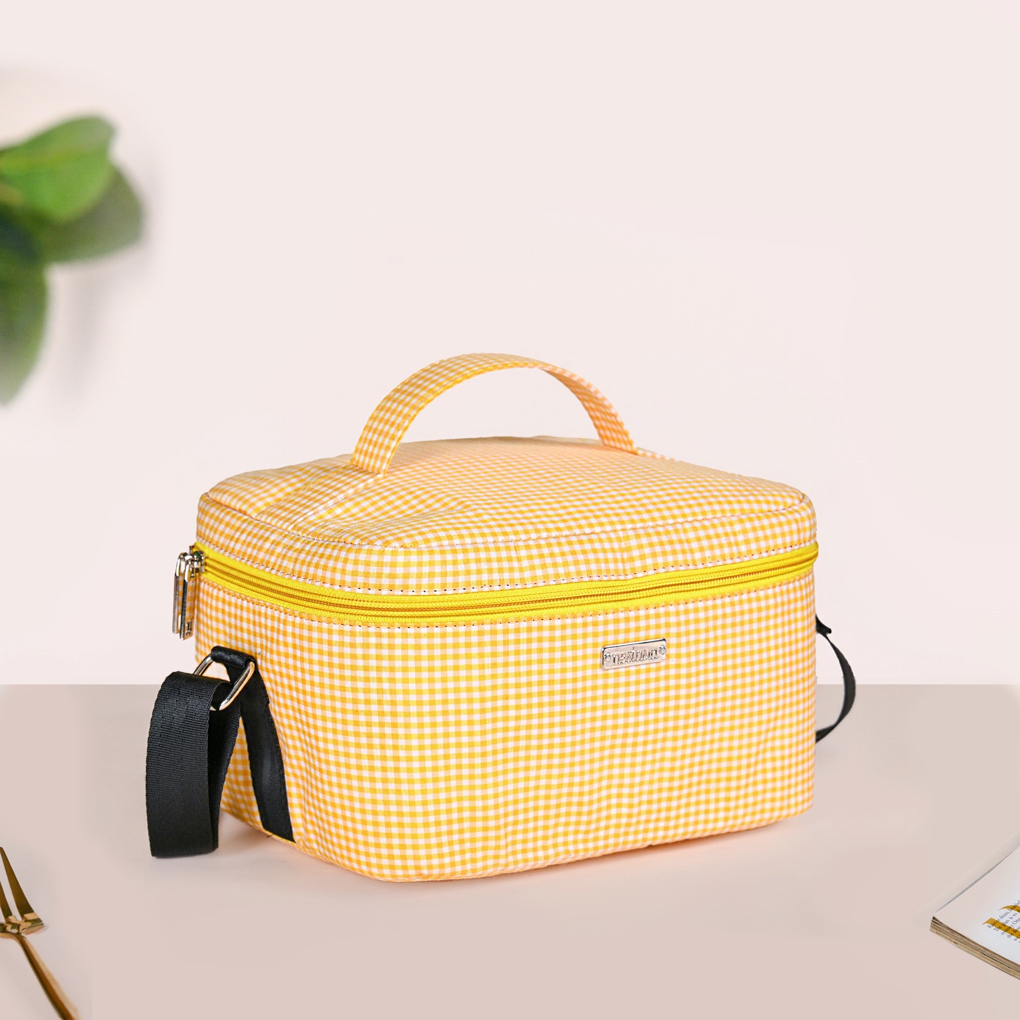 Design: Bringing a refreshing touch to your daily routine, this lunch bag features a bright yellow and white checkered exterior that adds a pop of cheer wherever you go. Made from durable, high-quality fabric, it withstands daily use while keeping your meals secure. Inside, a premium thermal foil lining provides superior insulation, locking in freshness while preventing leaks. The bag is designed for effortless portability, with a sturdy top handle for a firm grip and an adjustable shoulder strap for hands-free convenience. A smooth, easy-glide zipper allows quick access to your food, while two inner mesh pockets offer dedicated space for cutlery, napkins, or a water bottle, ensuring everything stays neatly organised.