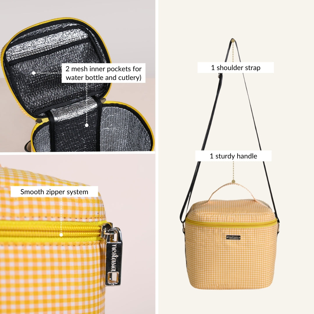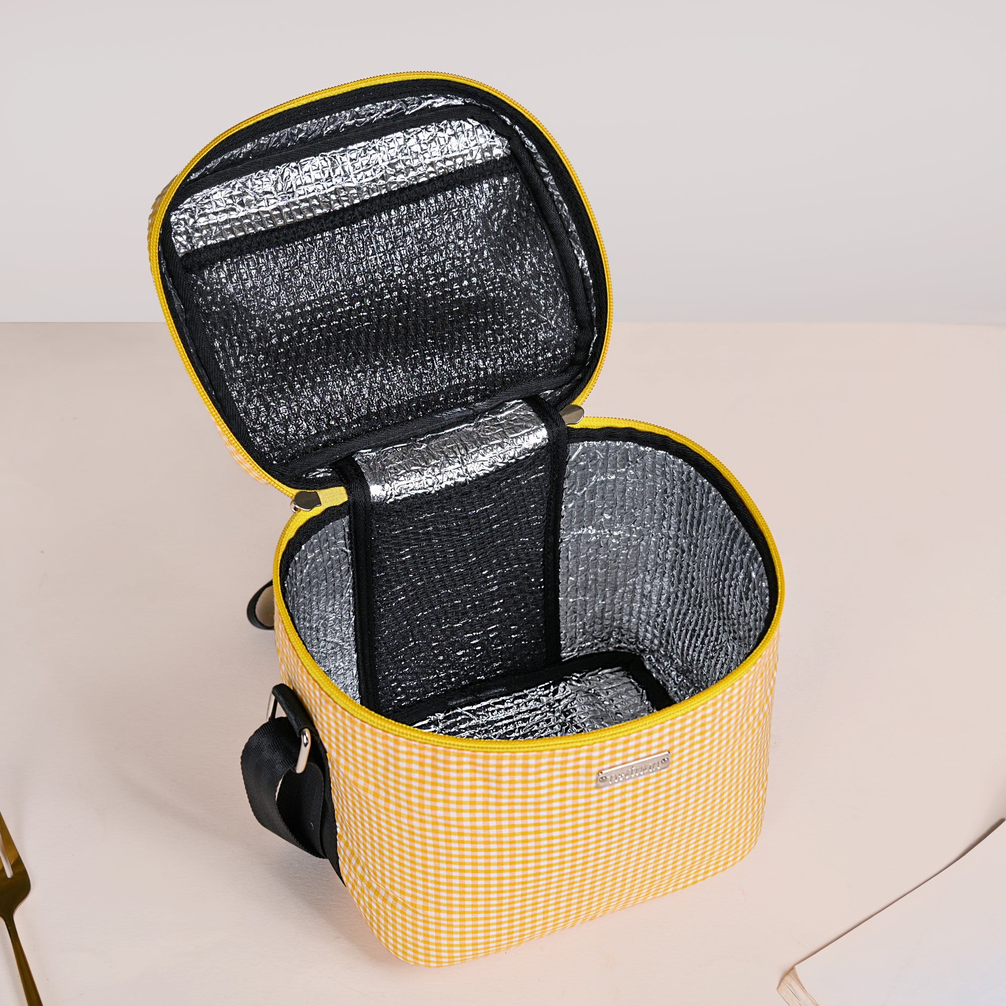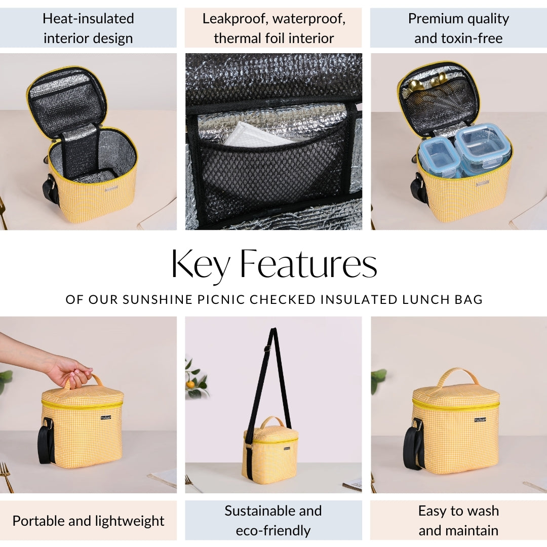 Design: Brighten up your lunchtime with this cute lunch bag featuring a charming sunshine-checkered pattern. Designed for both style and convenience, it has a soft, cushiony exterior with a sturdy top handle and an adjustable shoulder strap for easy carrying. With smooth double zippers, this lunch bag ensures quick access while keeping everything securely packed. Inside, the insulated lunch bag is lined with a premium thermal layer that helps maintain the temperature of your food, keeping meals warm or cool for hours. Two net pockets provide extra space to store cutlery, napkins, or small snacks, making it a must-have for daily use.