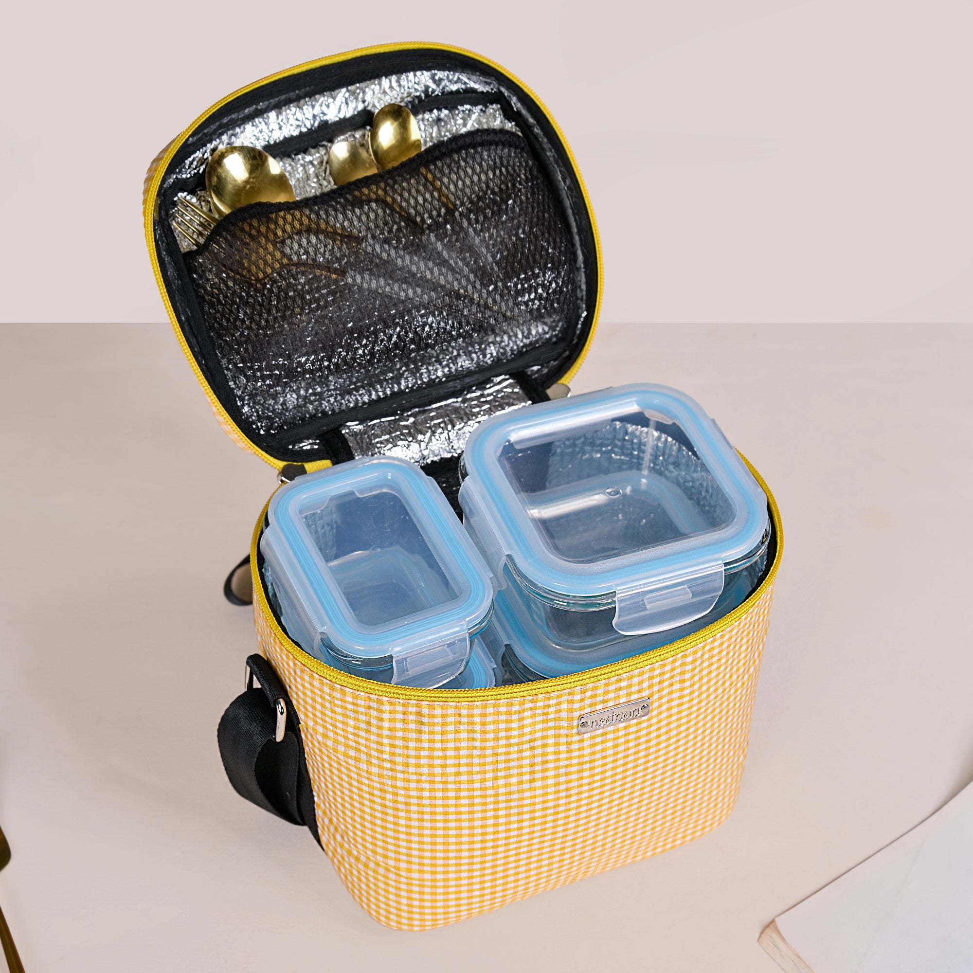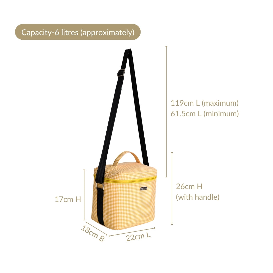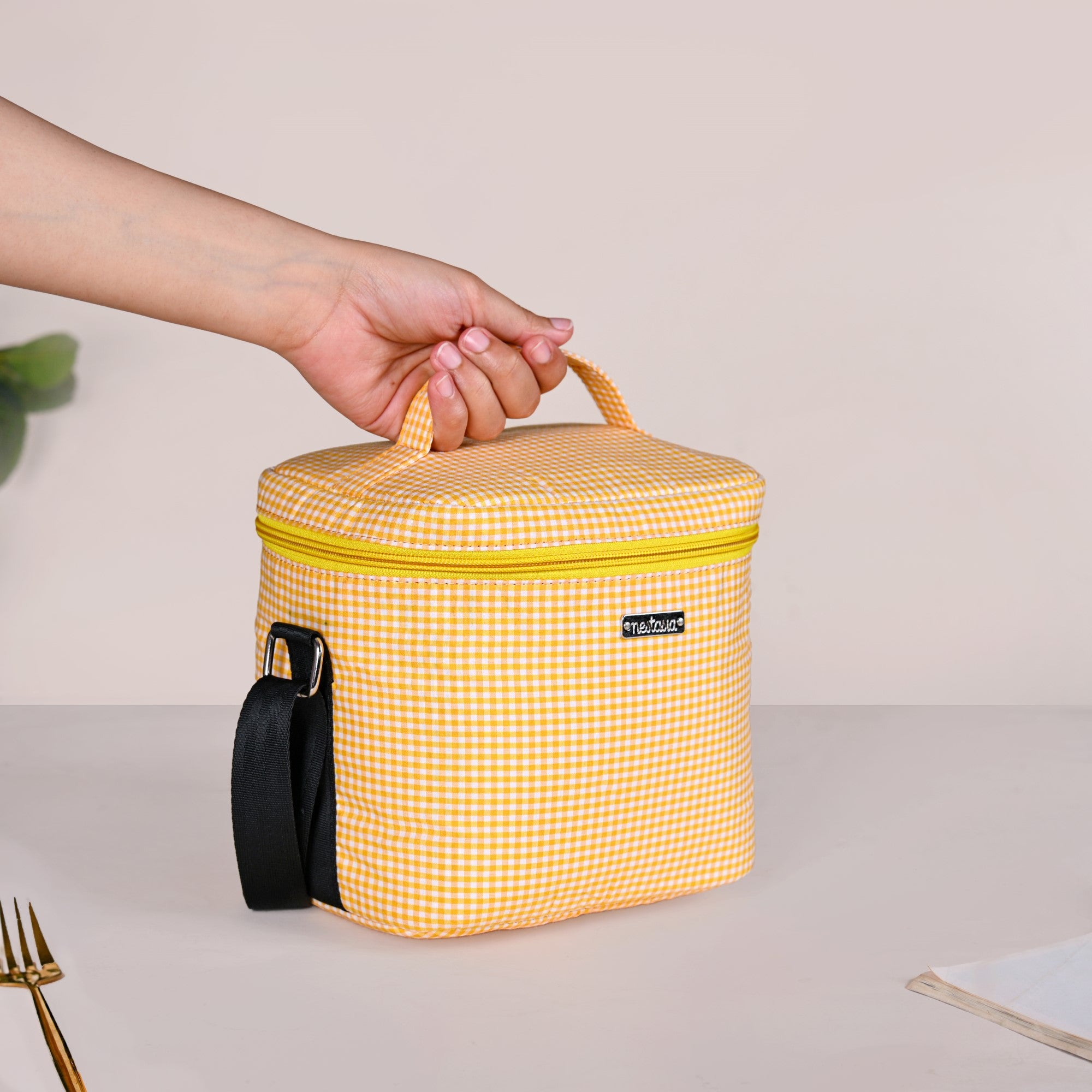 Design: Brighten up your lunchtime with this cute lunch bag featuring a charming sunshine-checkered pattern. Designed for both style and convenience, it has a soft, cushiony exterior with a sturdy top handle and an adjustable shoulder strap for easy carrying. With smooth double zippers, this lunch bag ensures quick access while keeping everything securely packed. Inside, the insulated lunch bag is lined with a premium thermal layer that helps maintain the temperature of your food, keeping meals warm or cool for hours. Two net pockets provide extra space to store cutlery, napkins, or small snacks, making it a must-have for daily use.