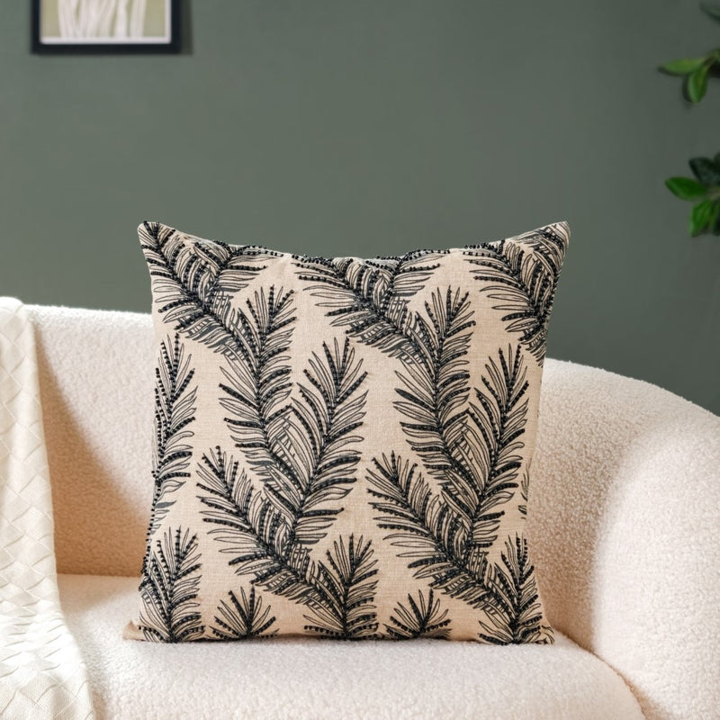 Elevate the look of your living area a notch higher with our stunning cushion cover, a testament to excellent craftsmanship. Meticulously crafted from premium-quality cotton, the pillow cover showcases intricate leaf prints adorned with fine beadwork, adding a touch of luxury to any setting. Designed in adherence to the QUB (Quality, Utility, and Beauty) principles, this hand-embroidered masterpiece seamlessly blends functionality and style. The concealed smooth zipper ensures easy application and removal, providing both convenience and aesthetic appeal. To preserve the allure of the pillow cover, we recommend a gentle handwash or dry cleaning.