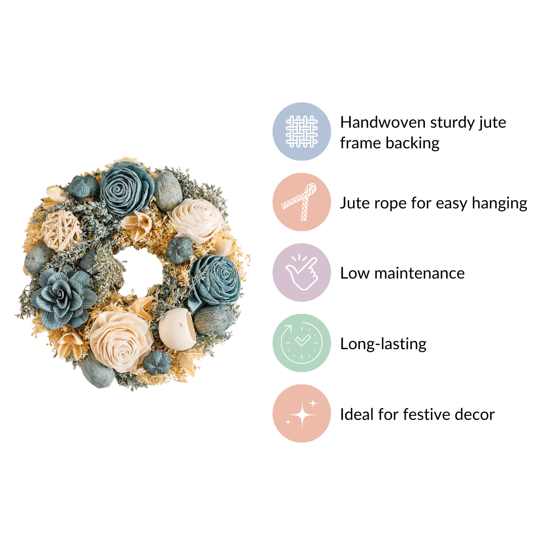 Behold our blue and white dried flower wreath – a masterpiece of eco-luxury and excellent craftsmanship. Impeccably handcrafted by skilled artisans, the wreath for wall decor features sustainable dried shola pith flowers, organic rattan balls, and naturally dried grasses. Its sturdy jute frame backing ensures durability, while the included jute rope allows effortless hanging. Elevate your space with this low-maintenance, long-lasting wreath garland, perfect for adding a touch of organic elegance to any occasion. Experience the epitome of sustainable and eco-friendly festive decor with our floral wreath.