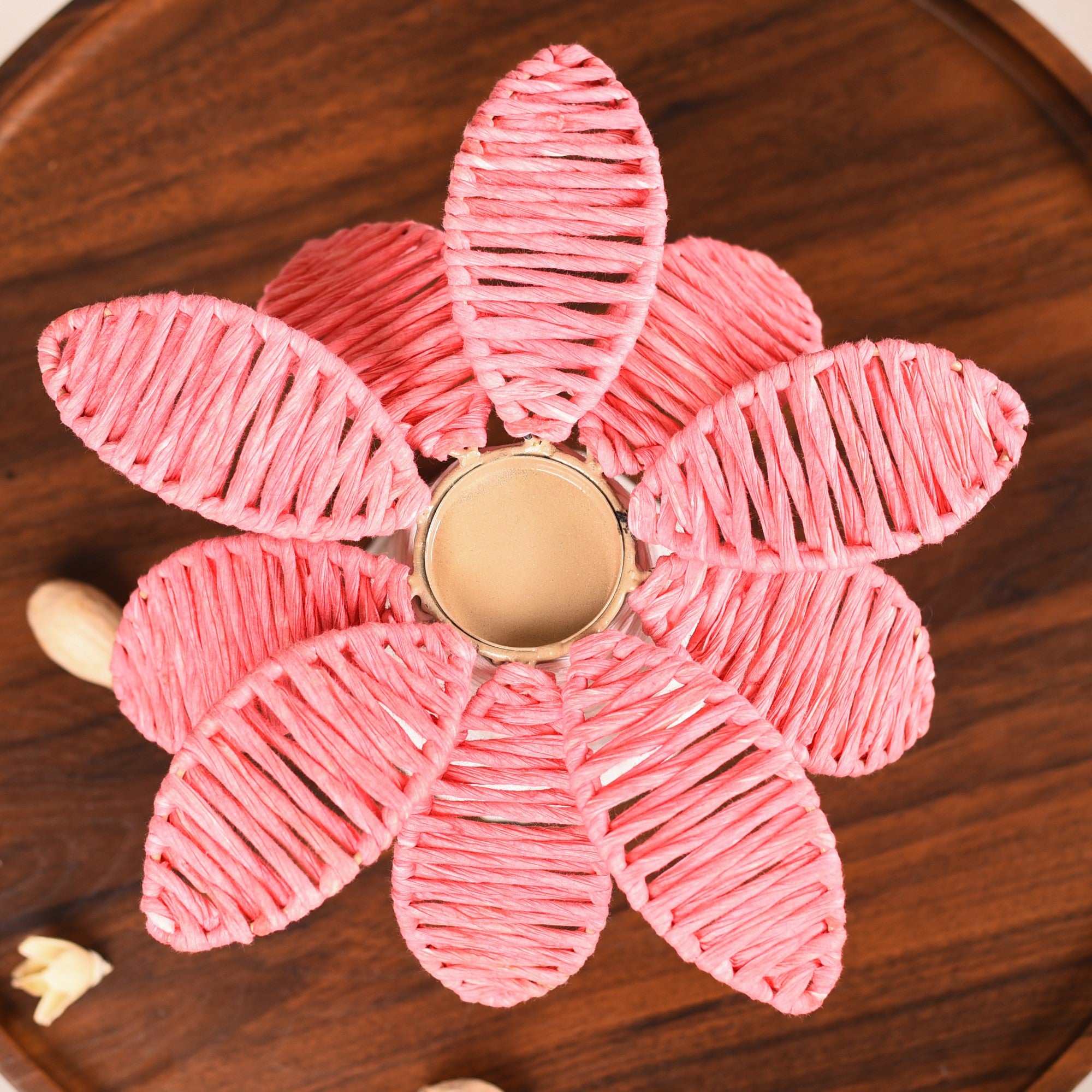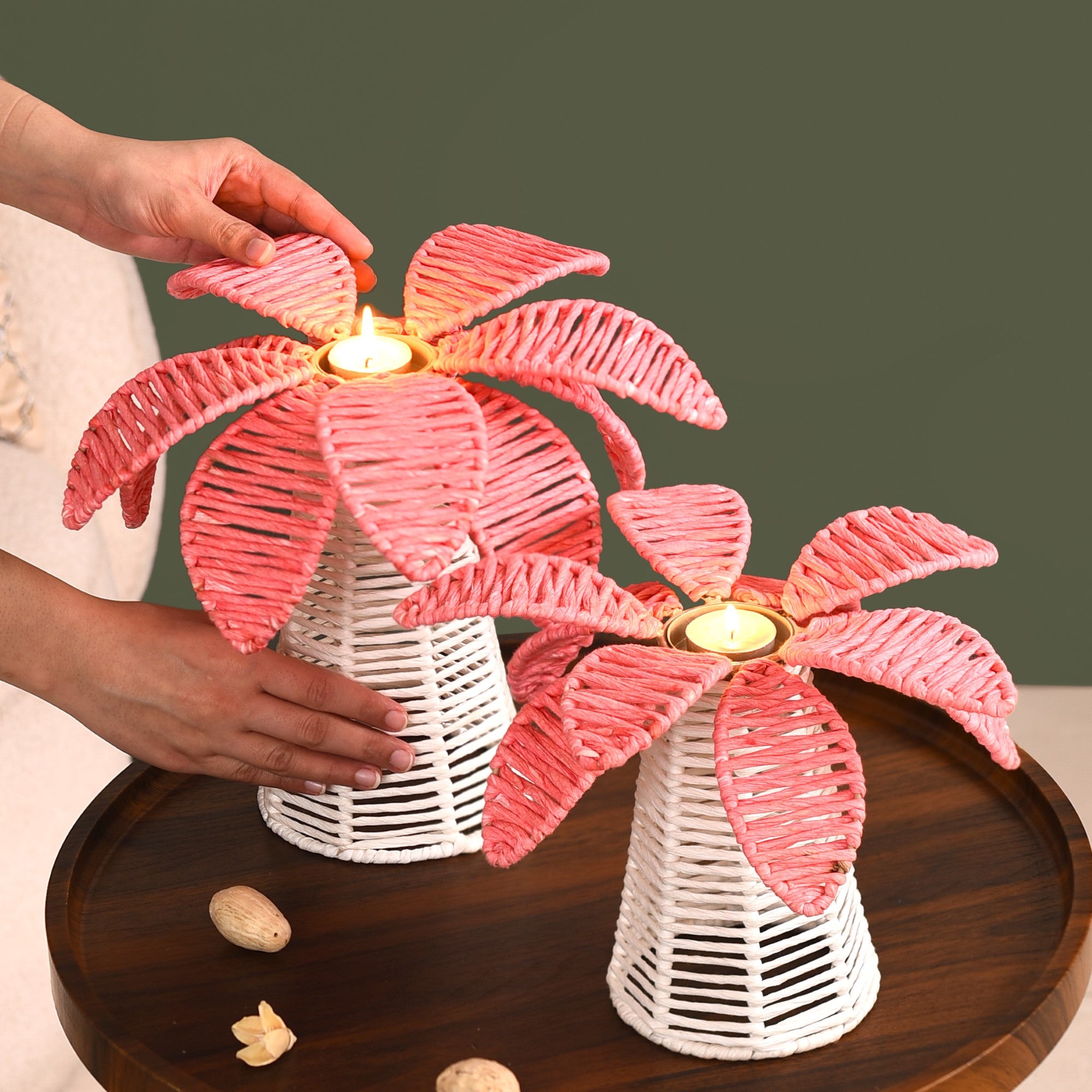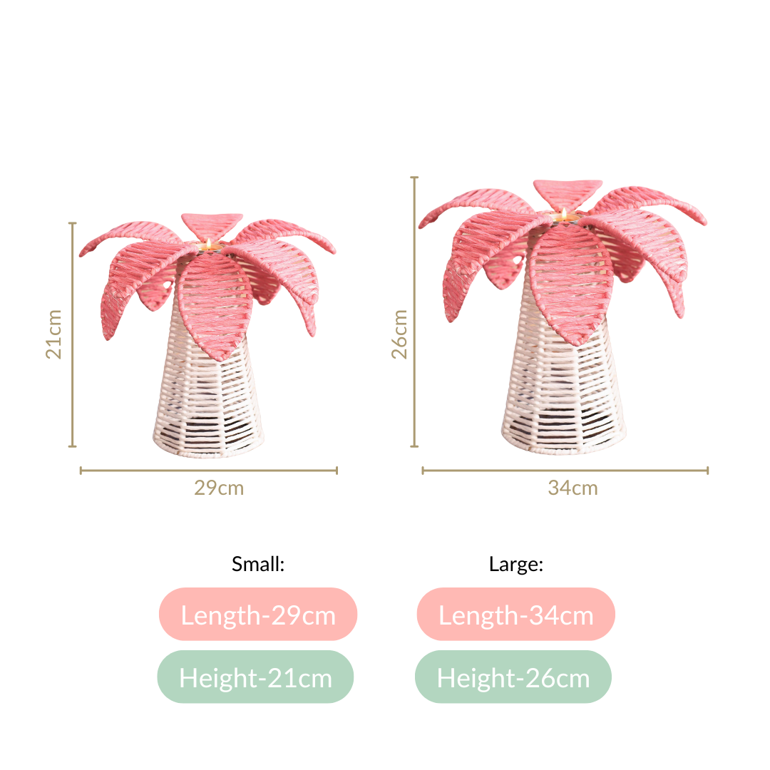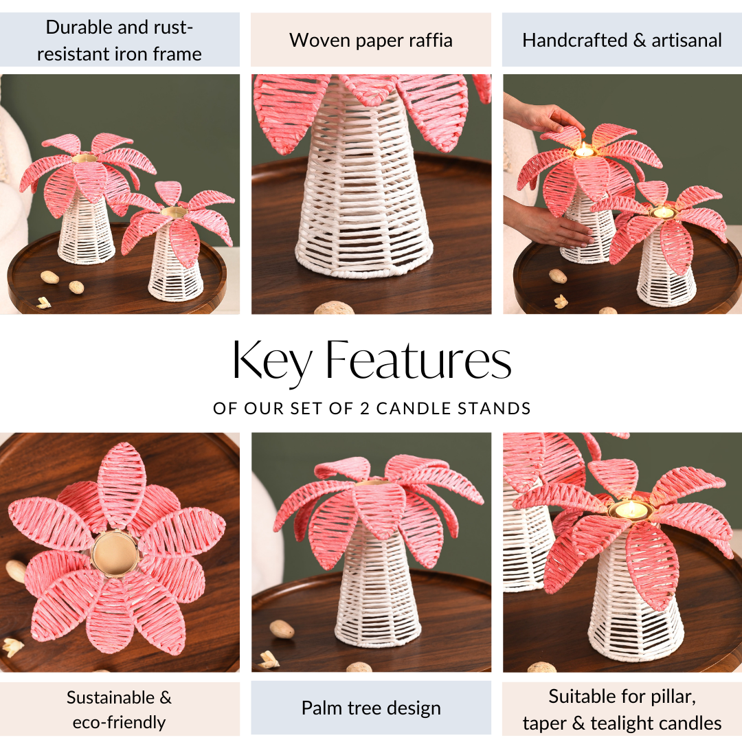 Design: Exemplifying modern design with a tropical twist, the candle stands feature a sturdy iron frame with handwoven paper raffia. Crafted precisely to sway you off to the tropics, the candle holders resemble a palm tree with white trunks and swirling pink leaves. Topped with a broad receptacle to accommodate your candles, these handcrafted pieces are a wonderful addition to your home decor.