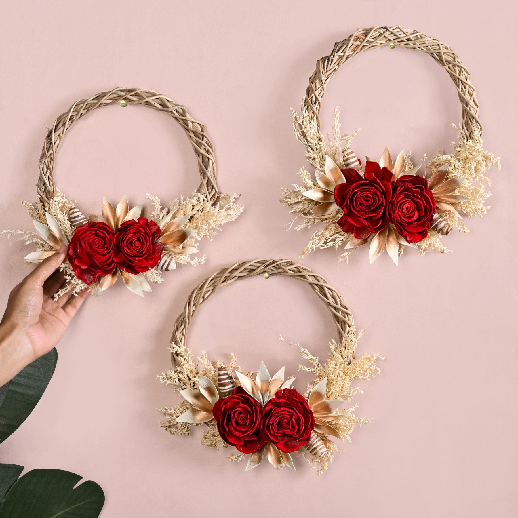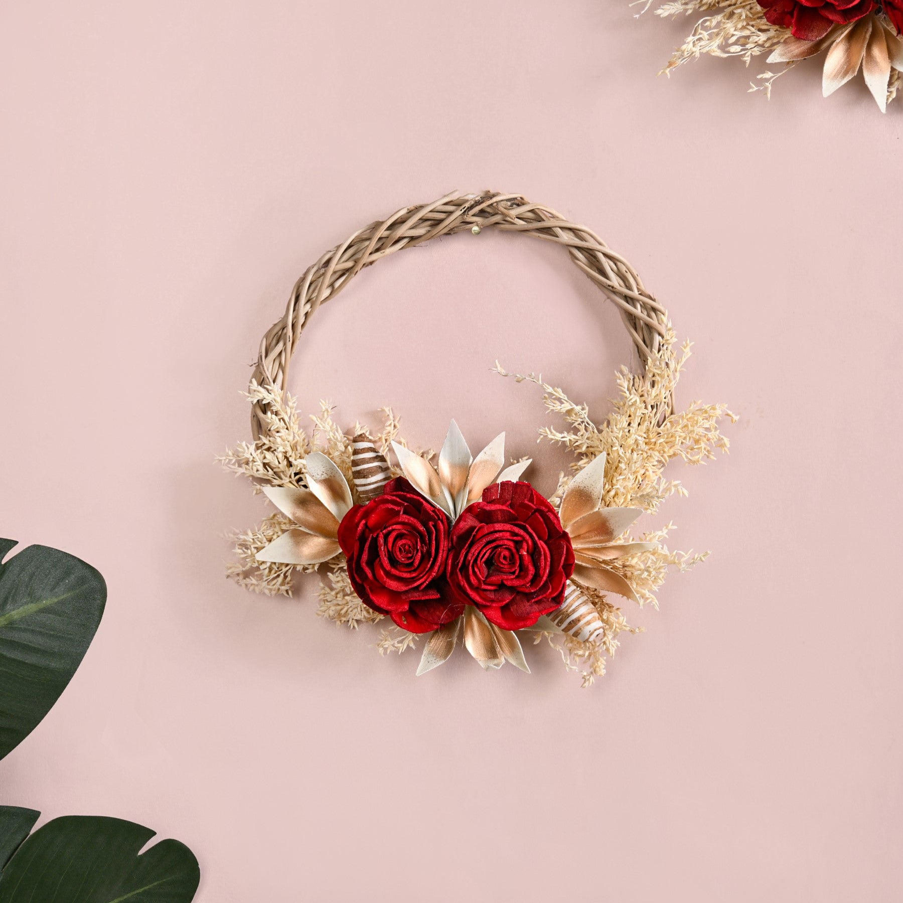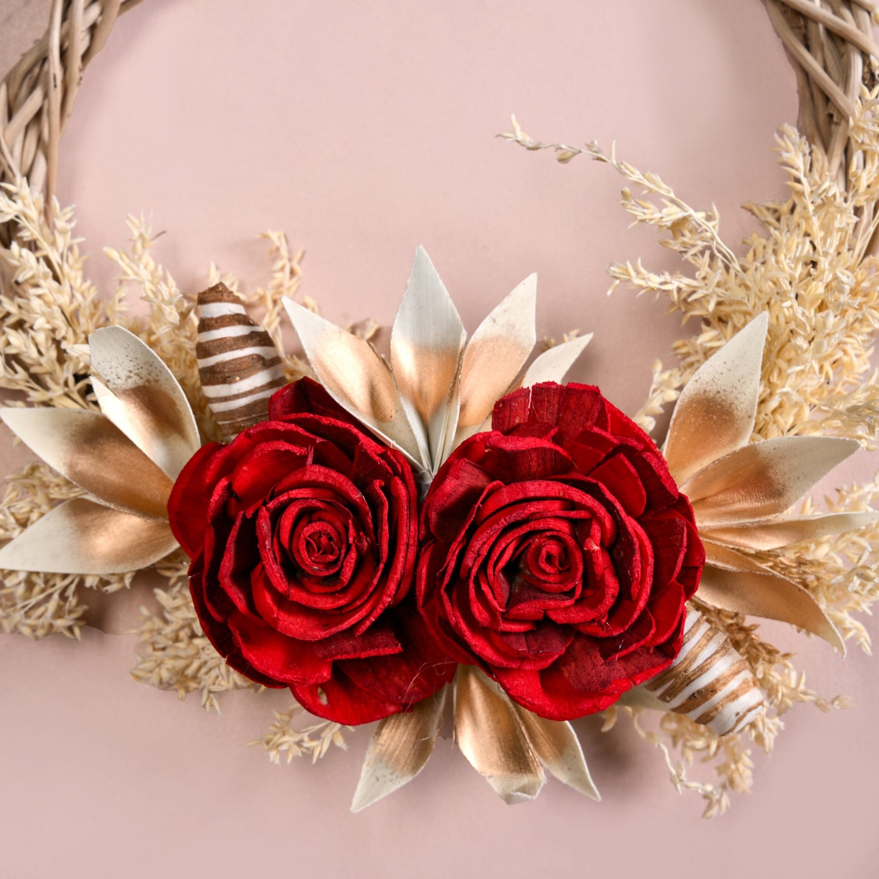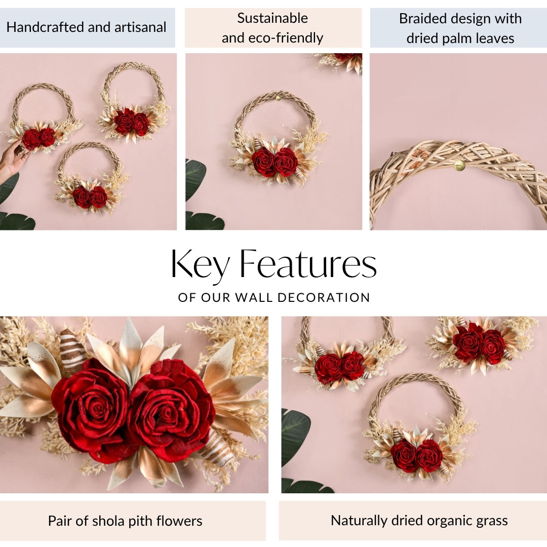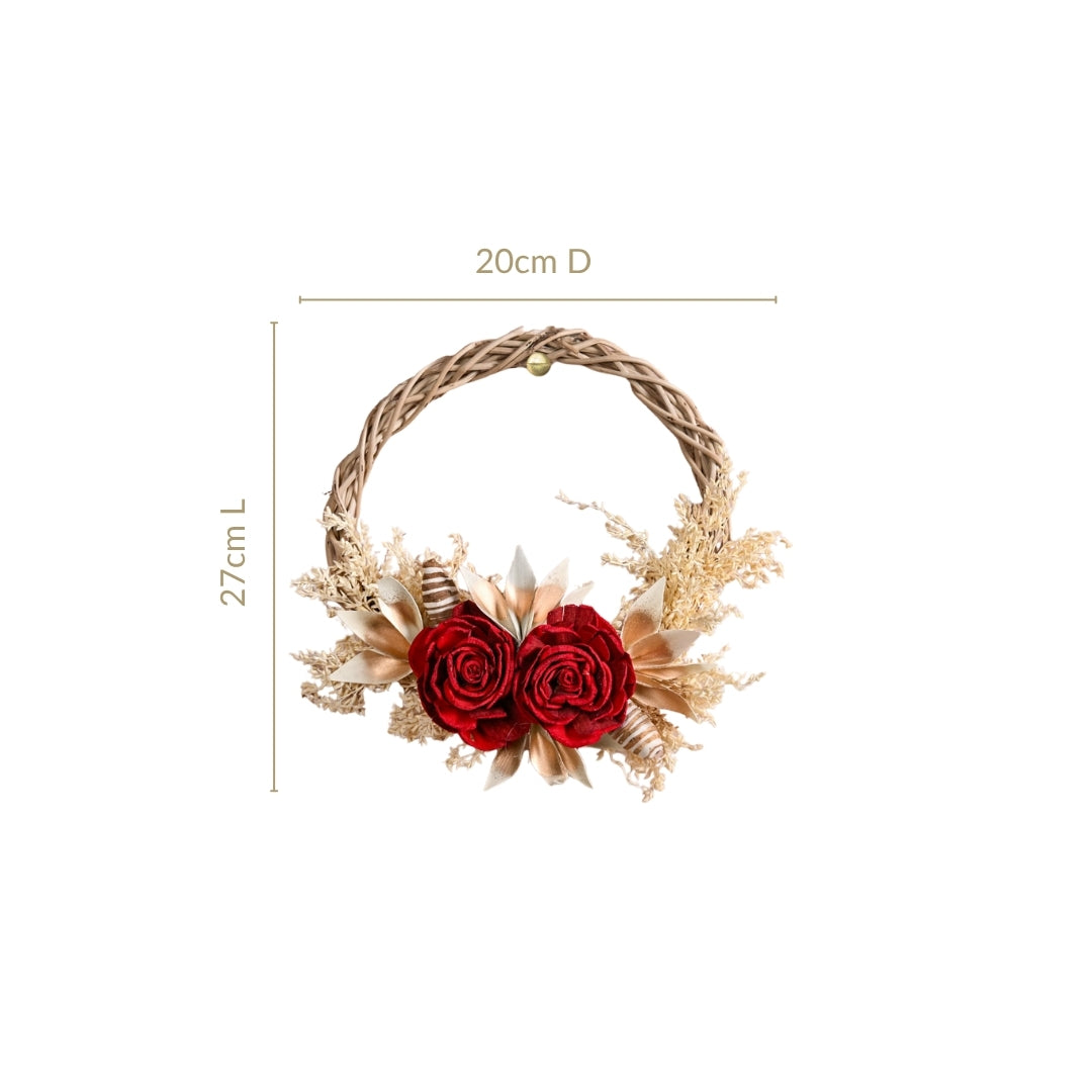 Design: Lovingly handcrafted by skilled artisans, each wreath is composed of eco-conscious materials like sola pith flowers, dried grasses, and corn husk leaves. Designed to captivate, the wreath features bold crimson roses flanked by gold-tipped foliage and delicate botanical accents, arranged over a woven natural vine base. This striking contrast of rich reds and soft neutrals makes it a year-round statement piece, adding sophistication to doors, walls, or festive vignettes with minimal effort and maximum impact. The circular base features a hand-braided vine structure. Deep red roses form the vibrant focal point, nestled among golden-tinted leaves and soft white botanical sprigs.