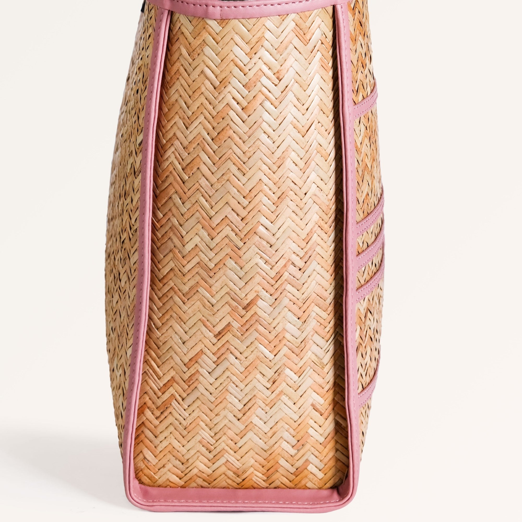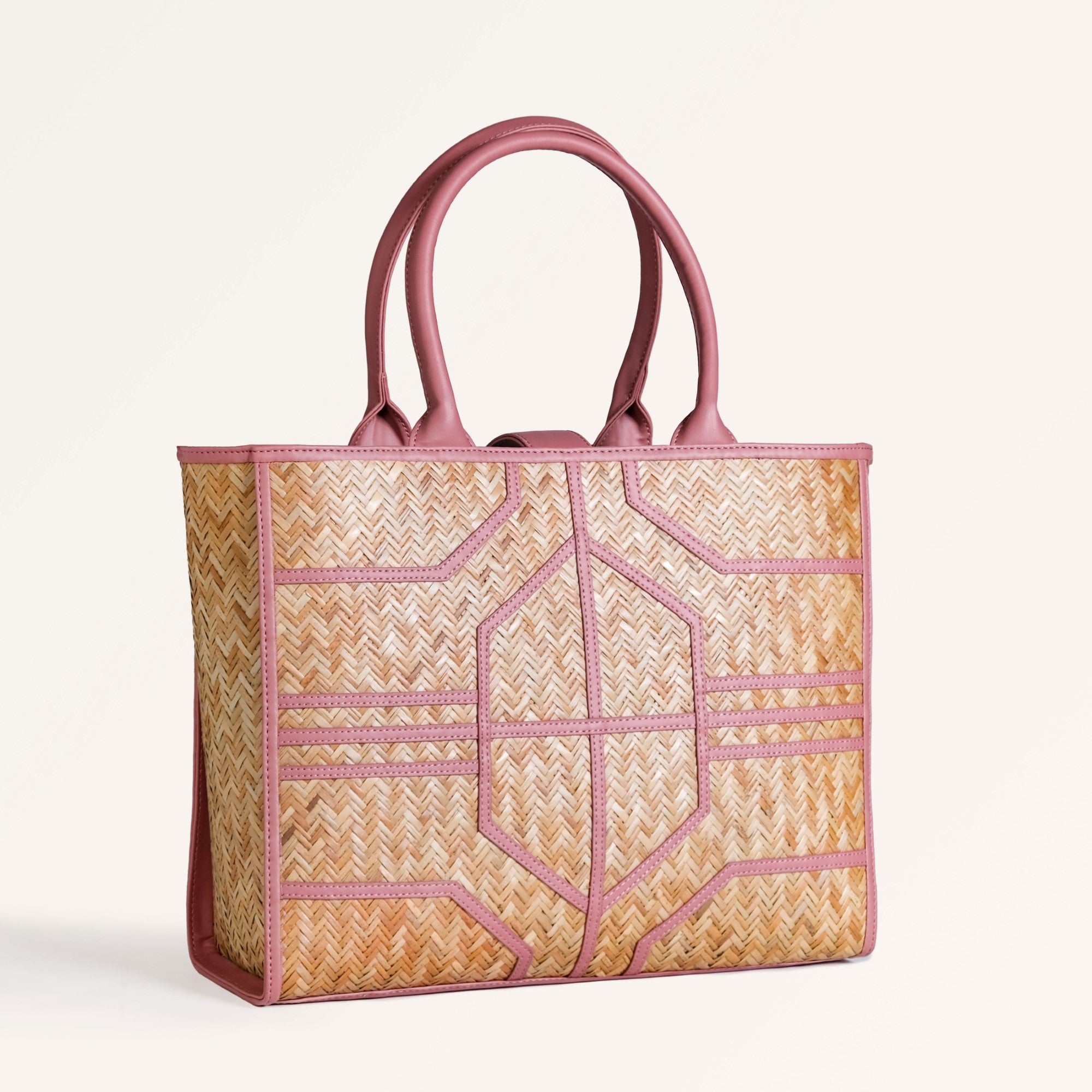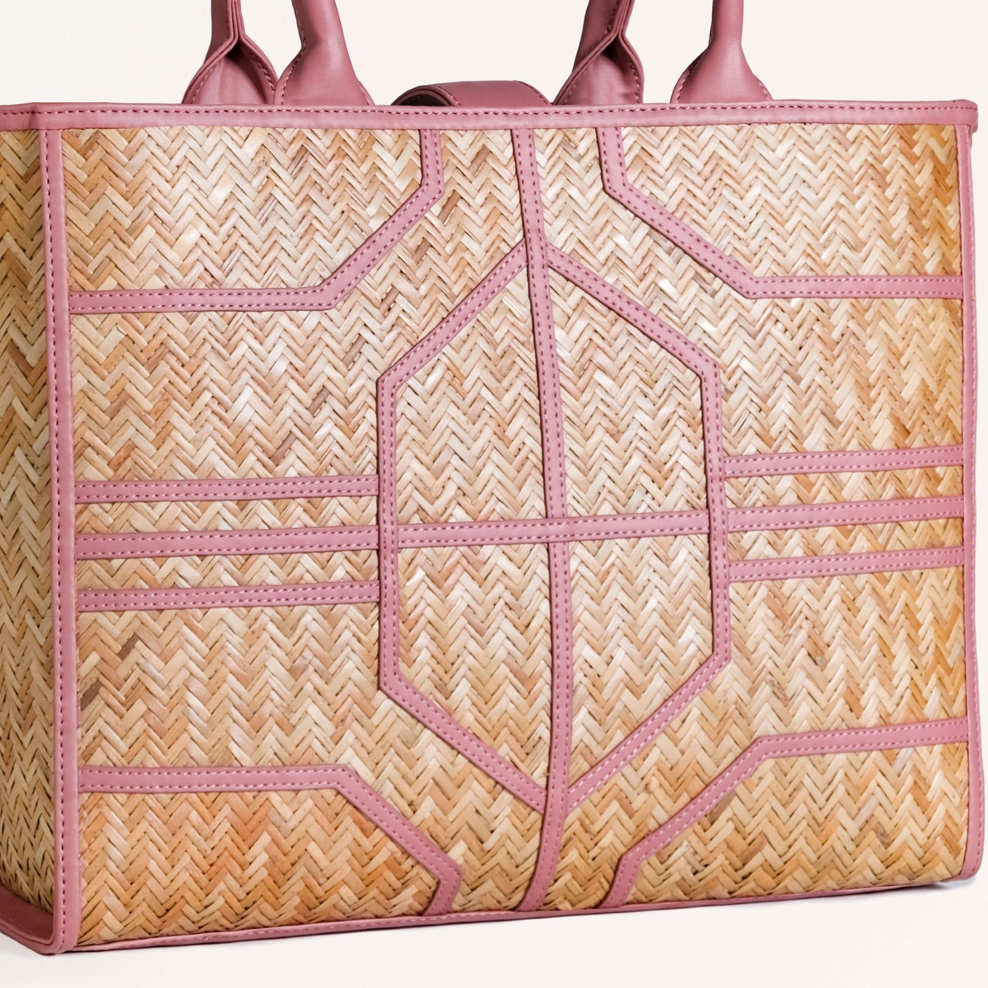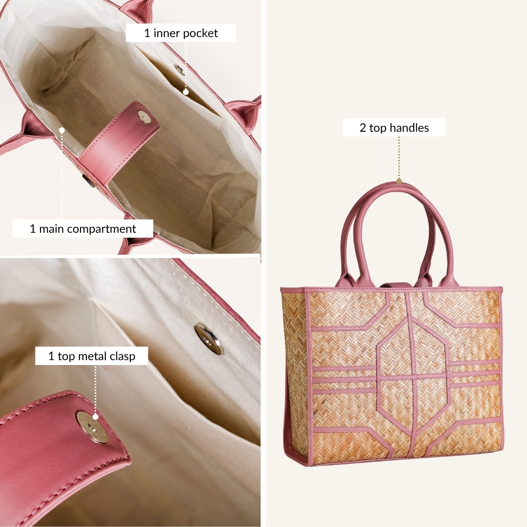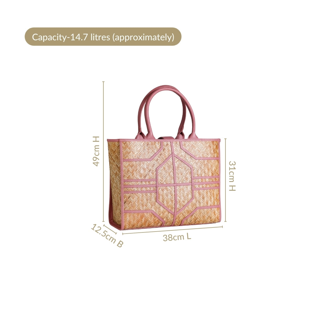Design: The bag is handwoven by skilled artisans from murta (patipata), a reed-like plant, into smooth, airy textures. Its foundation is meticulously handwoven Shitalpati in sun-kissed natural brown, offering an authentic, organic backdrop. The blush-toned vegan leather trims elegantly sculpt an intricate geometric pattern, creating a delightful dance of lines across the bag's surface. This charming fusion of earthy textures and gentle pink hues defines its unique allure. Completing the aesthetic, the twin top handles are crafted from harmonious pink PU leather, ensuring a cohesive and utterly feminine appeal that stands out among Indian handbags.