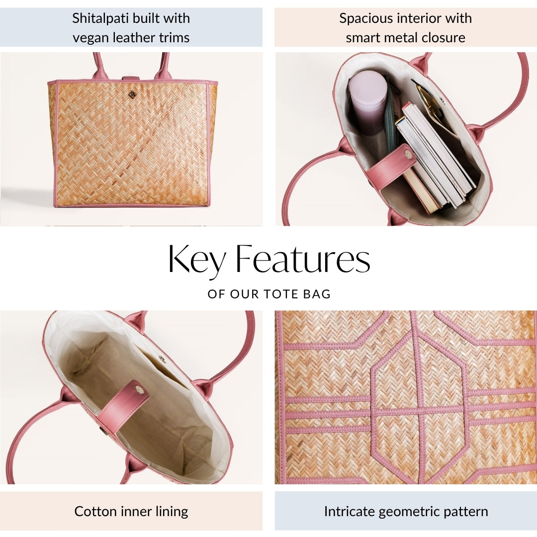 A blush-toned tote born from cool tradition. Crafted from Shitalpati ("Shital" meaning cool, "Pati" meaning mat), it’s where heritage meets everyday elegance.