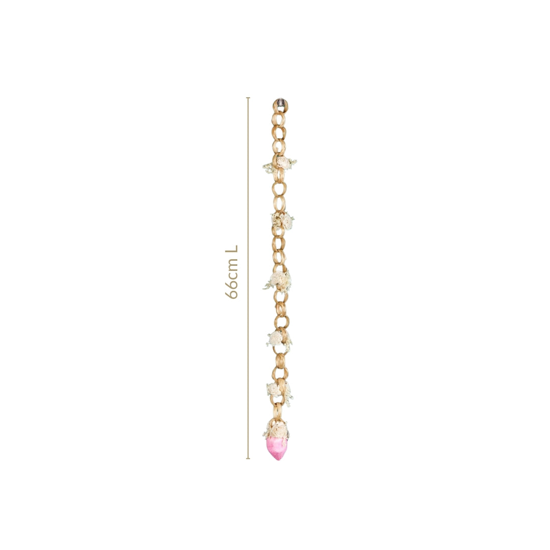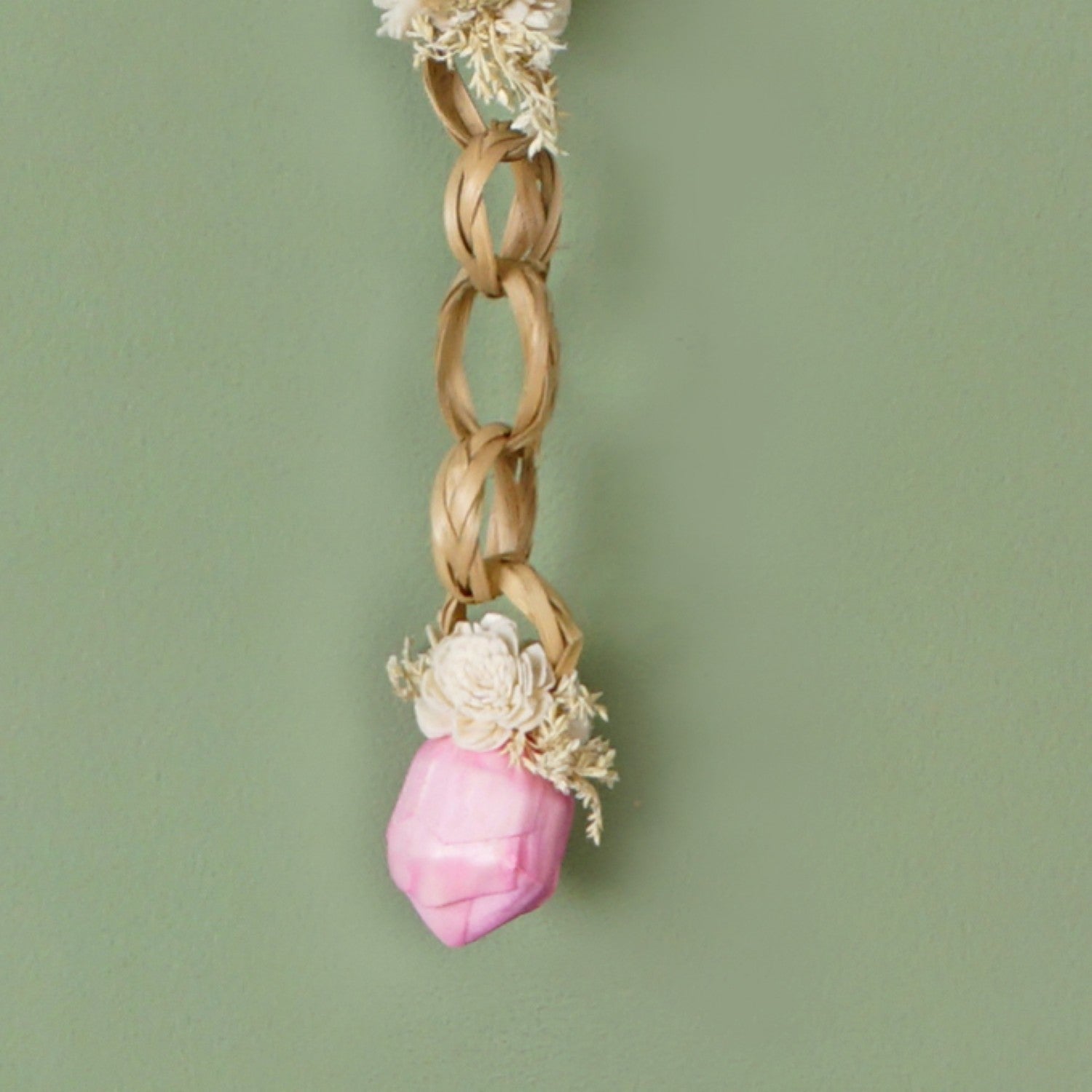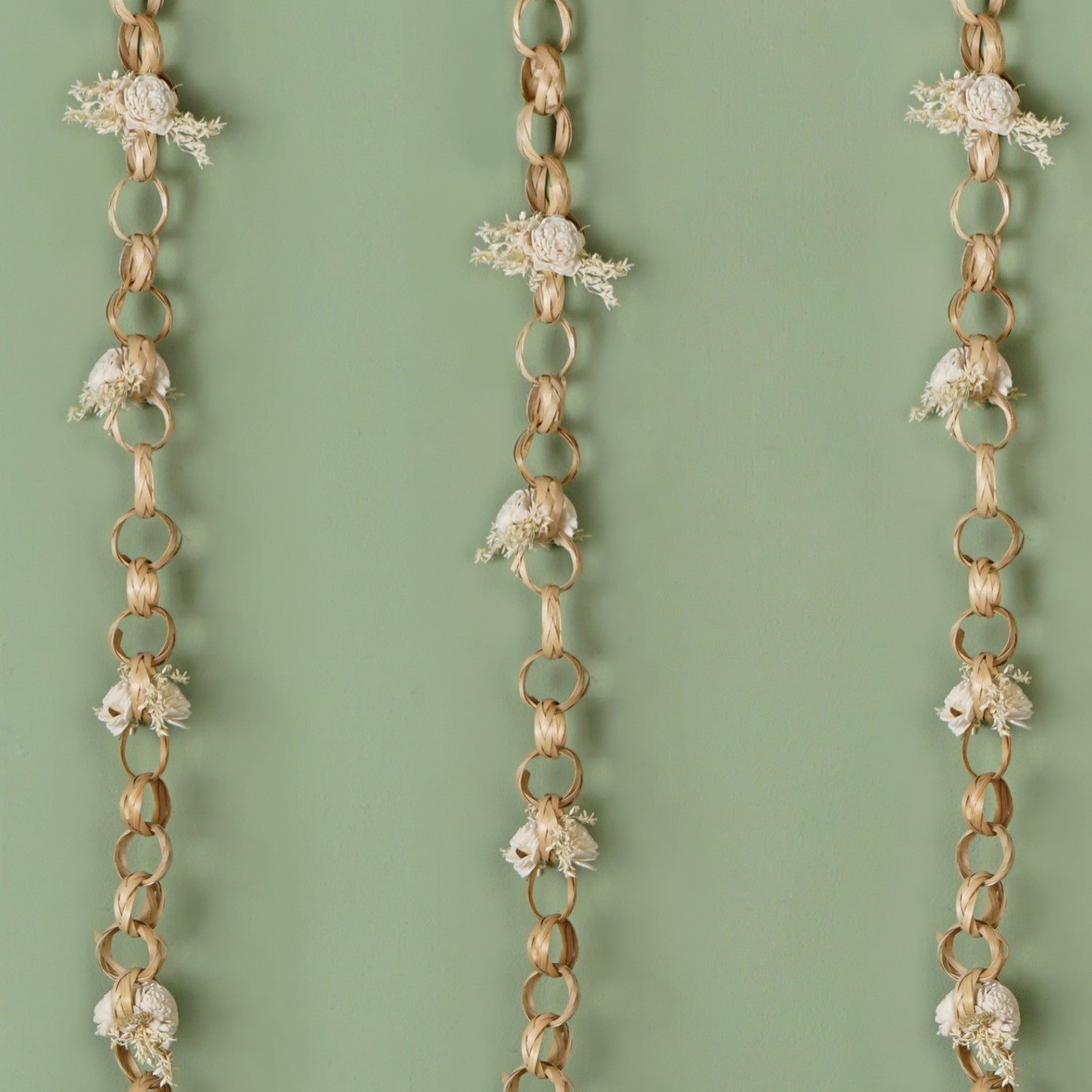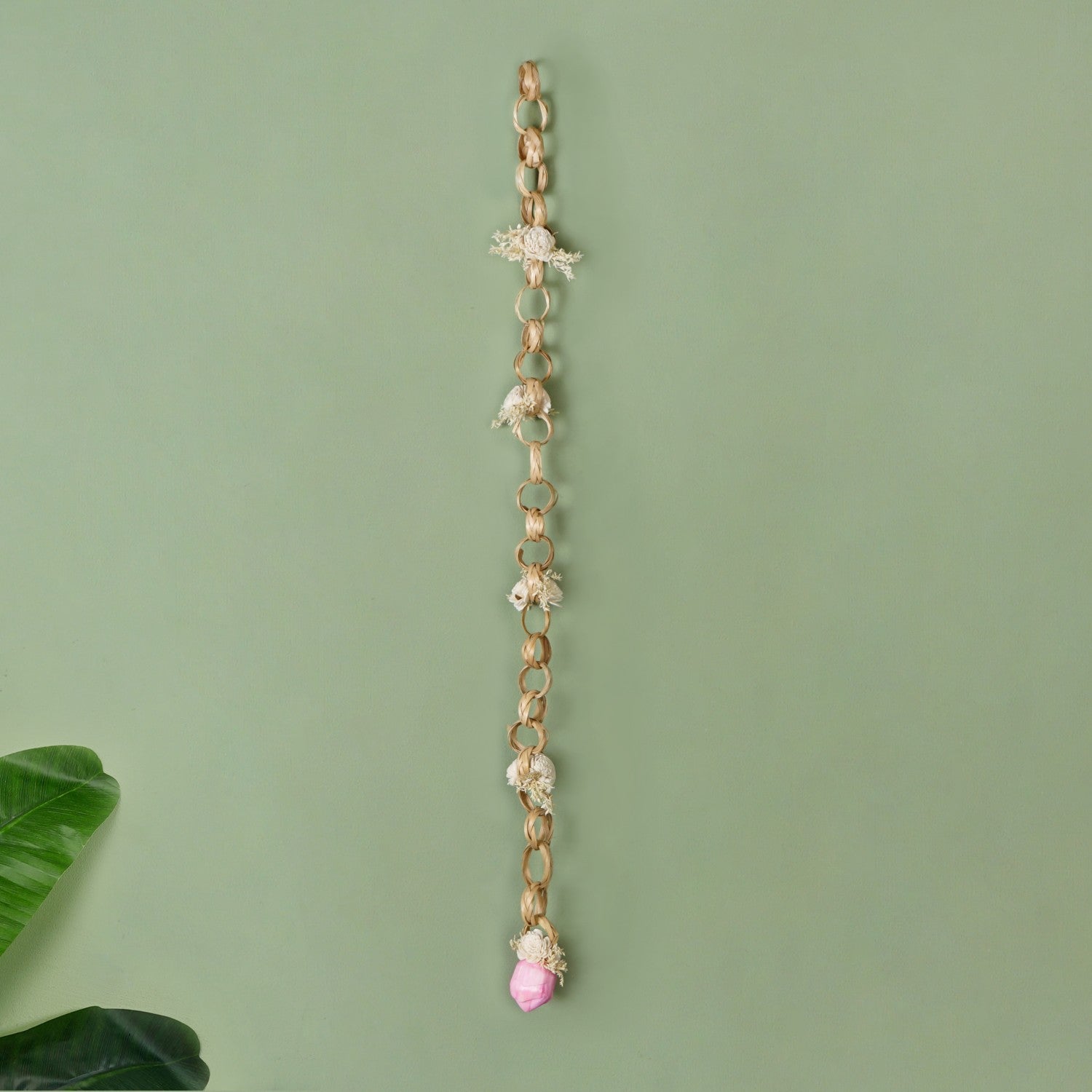 Design: Handwoven from sustainable palm leaves and trimmed with natural sola pith flowers and dried grass, this wall hanging exudes raw organic beauty. Each piece is handcrafted using natural palm fibres, dried sola pith flowers, and organic grass stems. The intricate braidwork forms a rustic chain, adorned with creamy white blooms and finished with a delicate pink lotus bud for a soft yet striking touch. These natural tones lend a calm, earthy vibe, perfect for elevating entryways, living corners, or prayer spaces with handcrafted elegance and thoughtful detail.