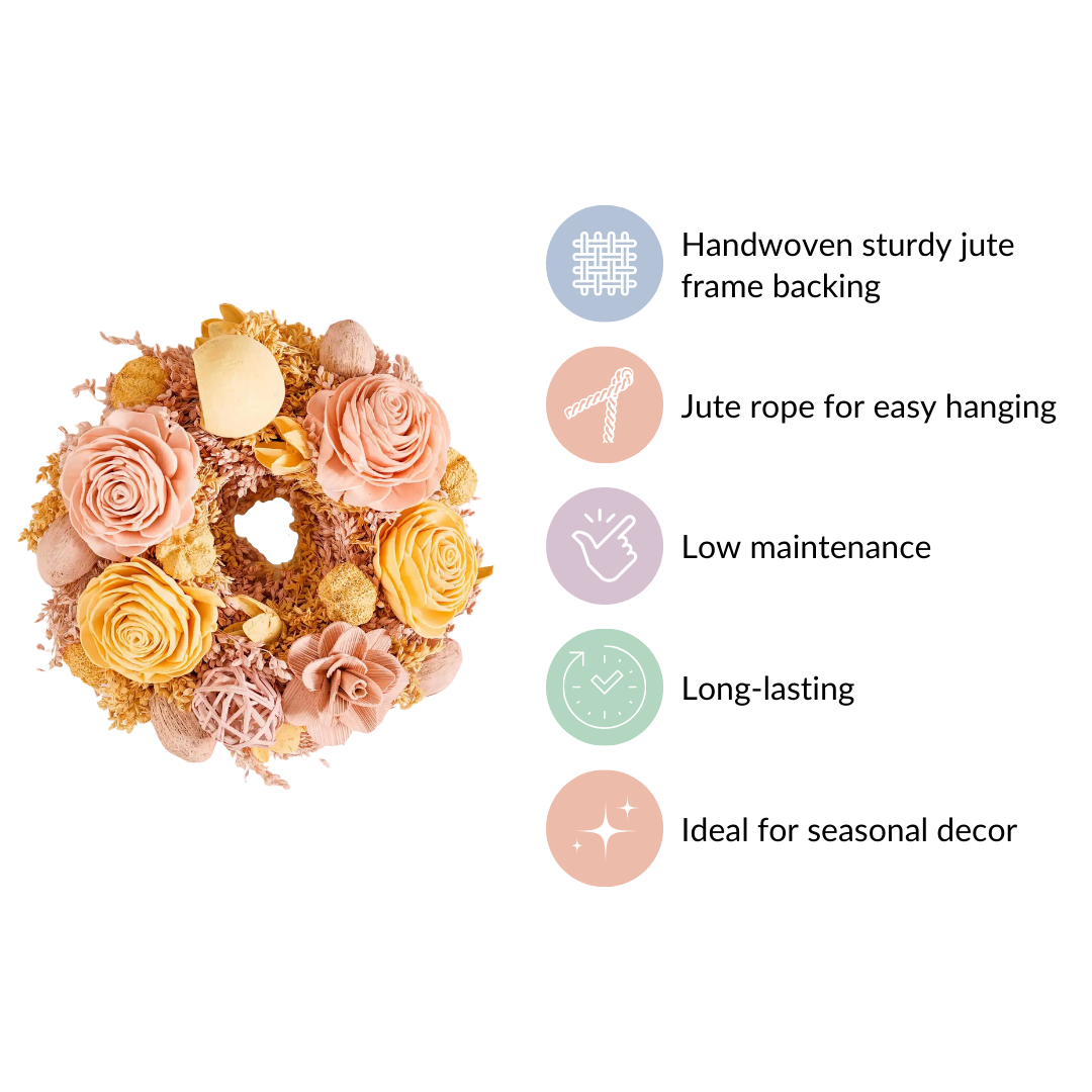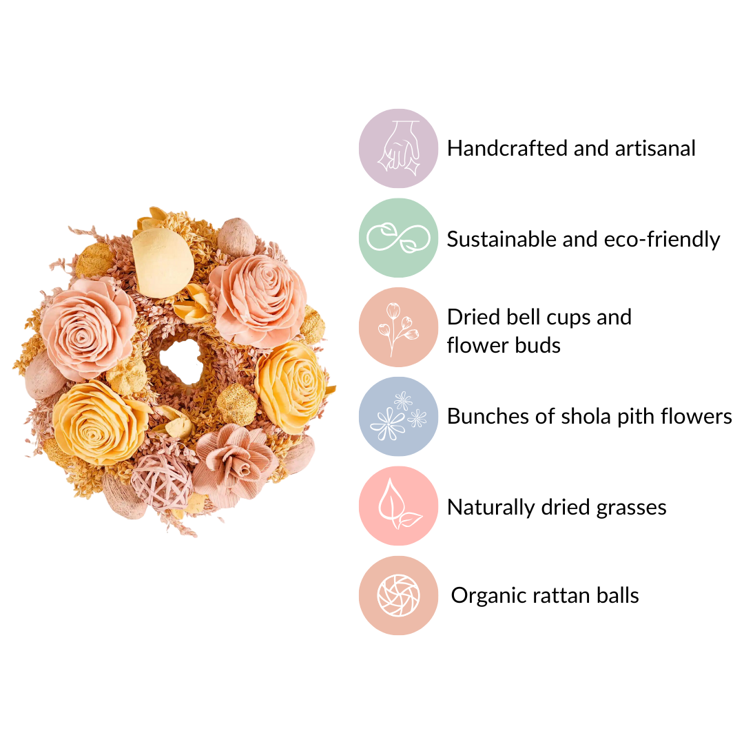 Our wreath boasts eco-conscious craftsmanship. It's handcrafted using sustainable materials like shola pith flowers and organic rattan balls. These natural elements ensure minimal environmental impact. Additionally, the wreath's durability and timeless design reduce the need for frequent replacements, promoting a sustainable approach to festive decor.