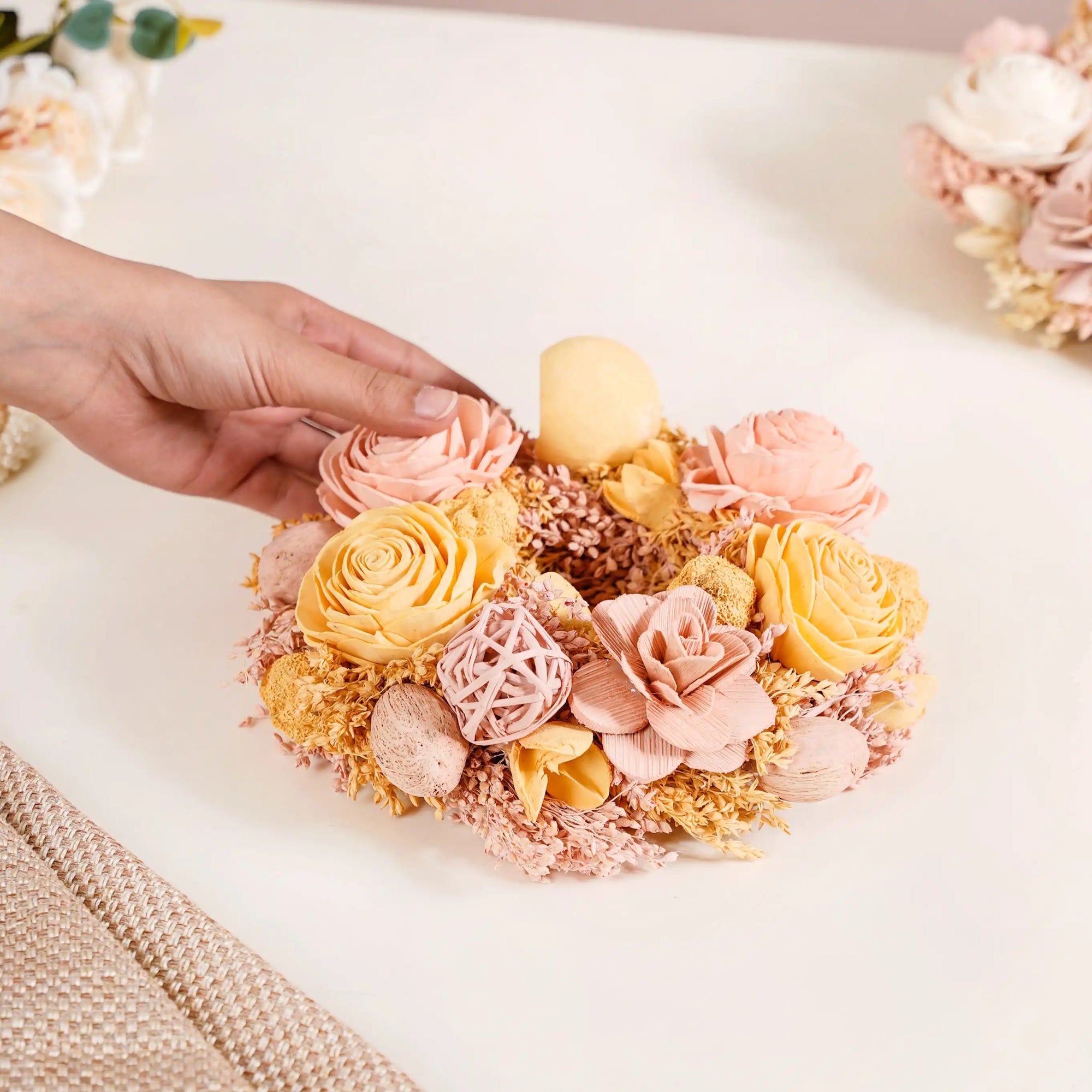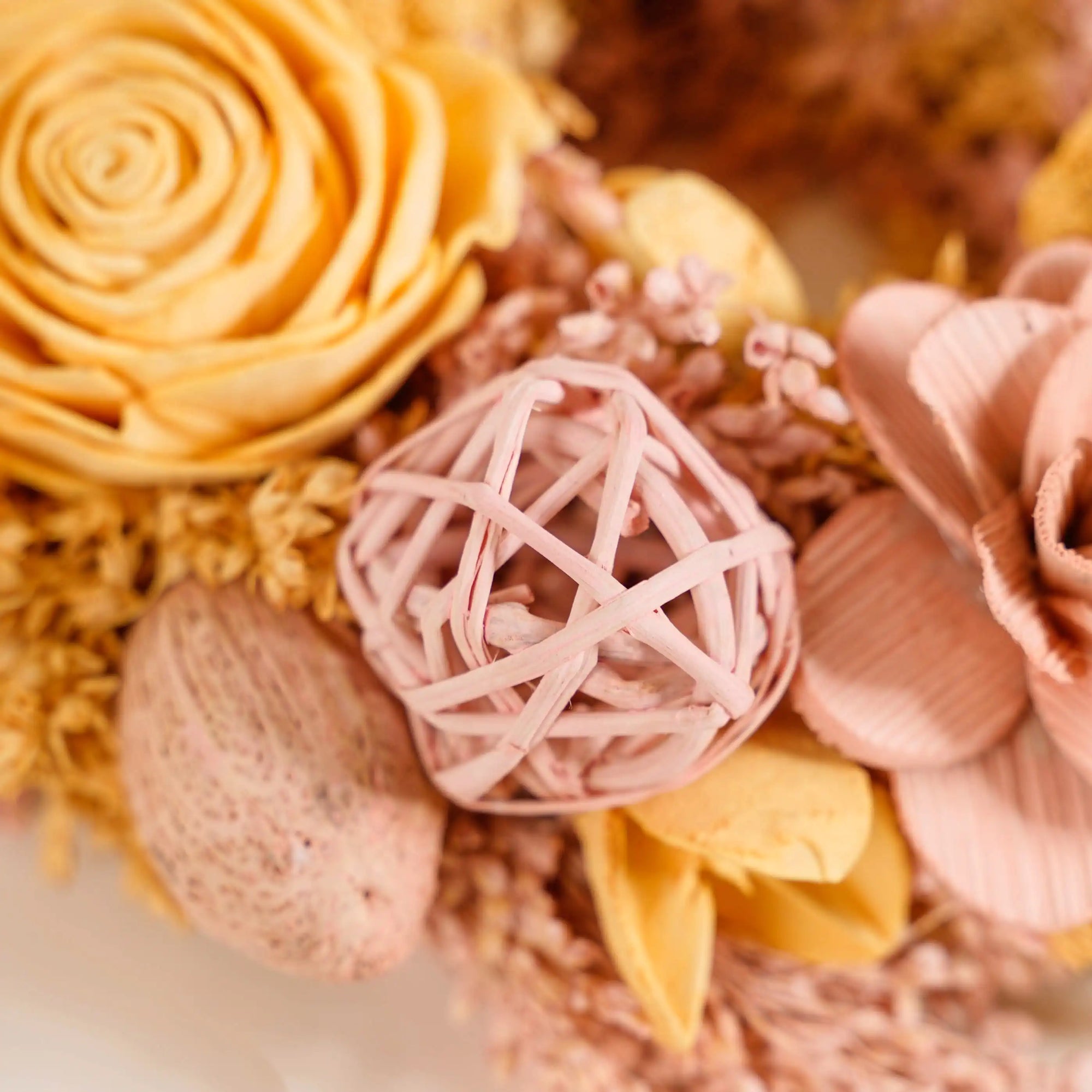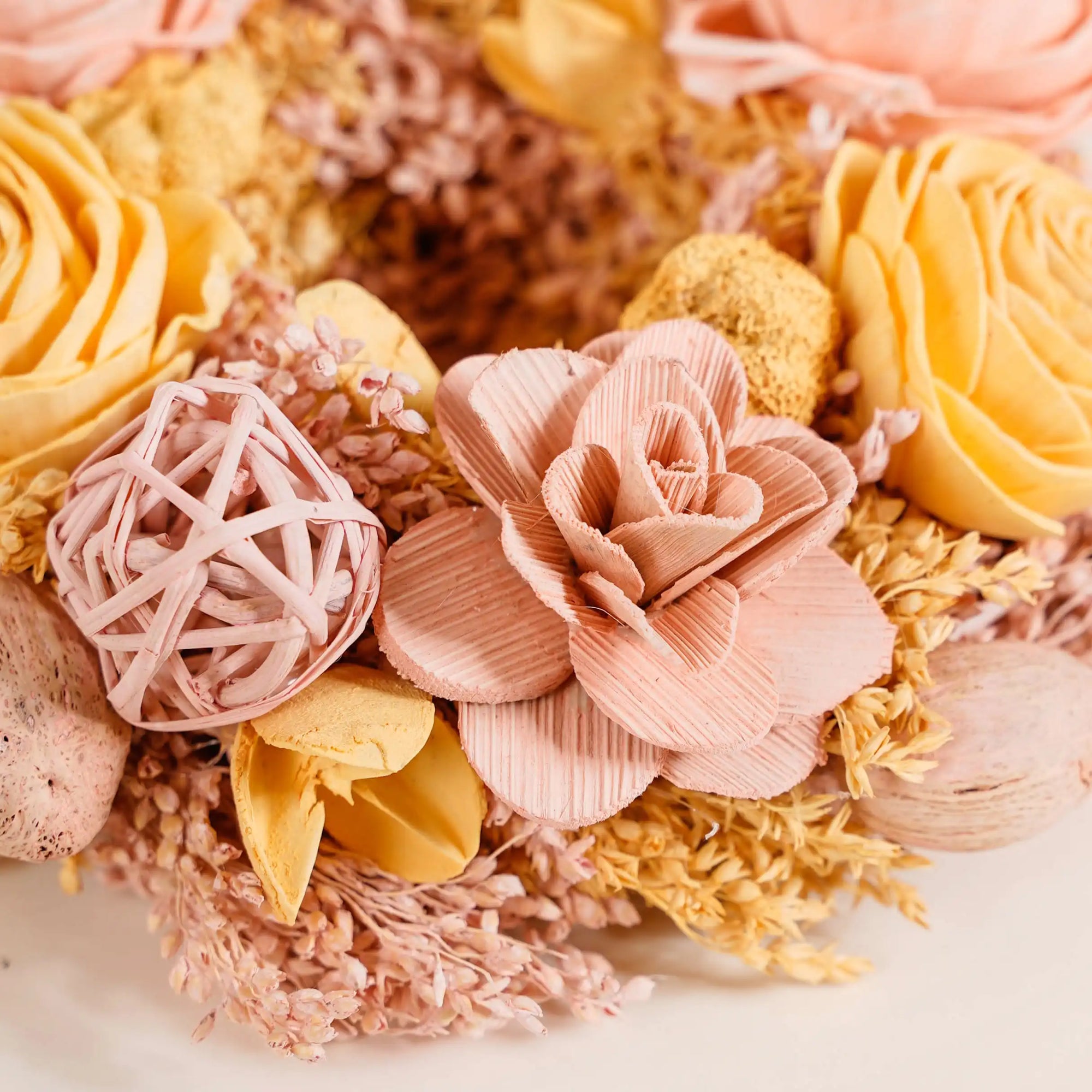 Our wreath serves as a perfect base for creativity. Feel free to add ribbons, LED lights, or small ornaments, with the wreath for charming festive decor. Its neutral yellow and peach tones act as a splendid canvas, allowing you to customize and create unique festive looks tailored to various occasions, from Christmas to spring celebrations.