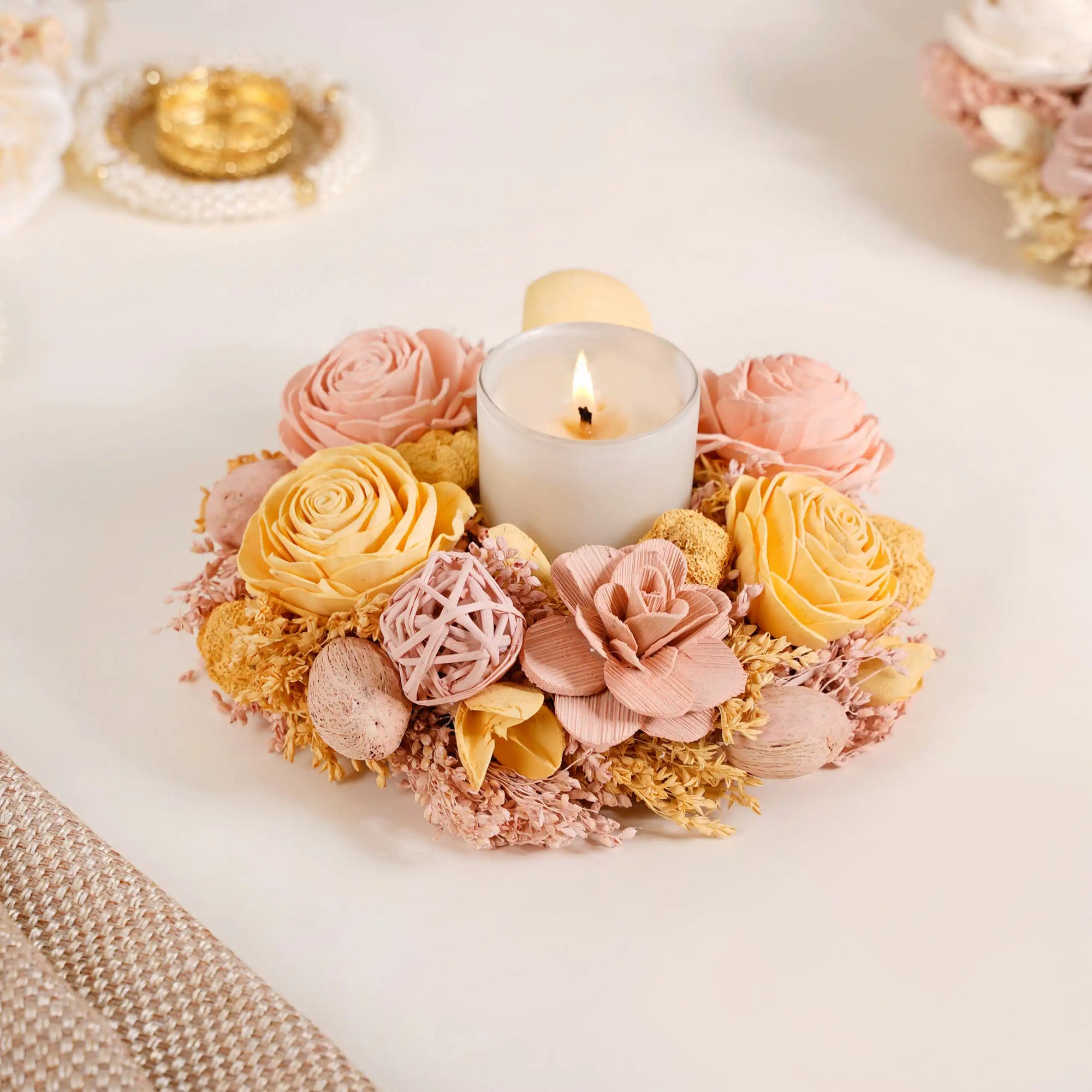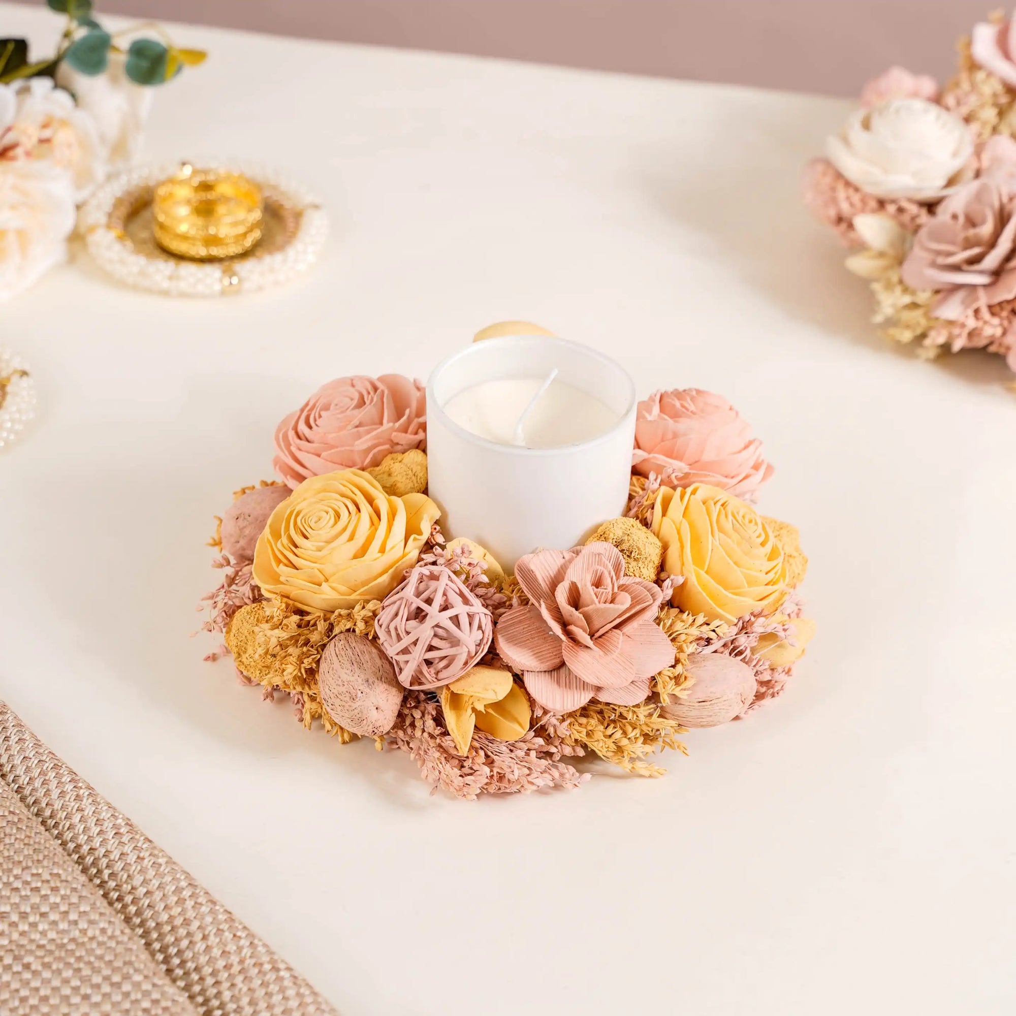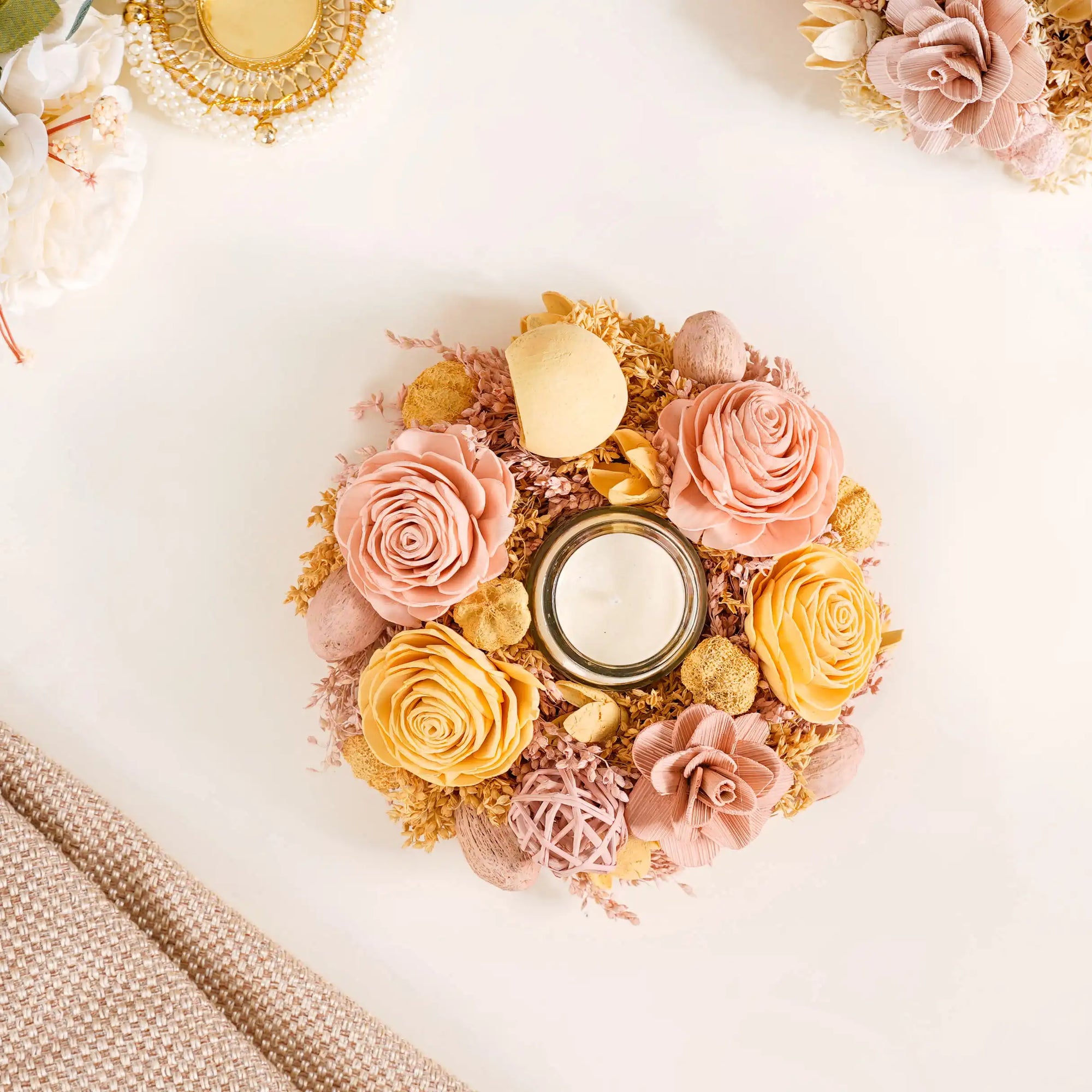Our wreath serves as a perfect base for creativity. Feel free to add ribbons, LED lights, or small ornaments, with the wreath for charming festive decor. Its neutral yellow and peach tones act as a splendid canvas, allowing you to customize and create unique festive looks tailored to various occasions, from Christmas to spring celebrations.