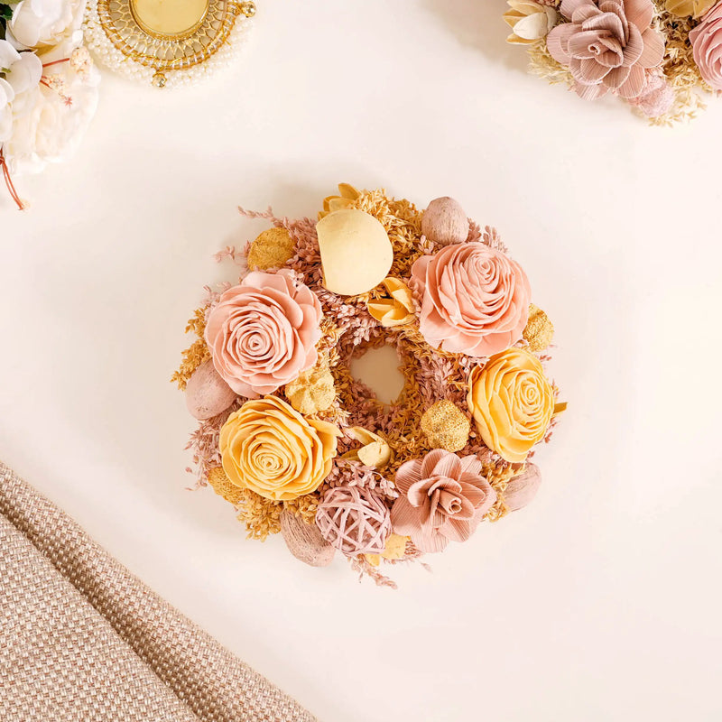 Maintaining the floral wreath is easy. Avoid direct sunlight and excessive moisture to preserve its vibrant colours. Dust it gently from time to time, and if it gathers dust or dirt, a soft brush or a hairdryer on a cool setting works wonders. Handle with care during storage, ensuring it’s kept in a dry, cool place, and your wreath will adorn your festivities for years to come.