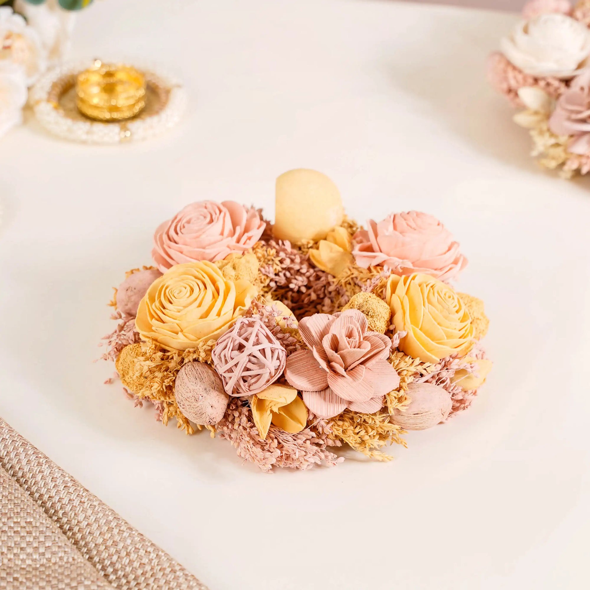 Introducing the yellow and peach dried flower wreath, a masterpiece of extraordinary craftsmanship and superb sustainability. Expertly handcrafted with precision, it features delicate shola pith flowers, organic rattan balls, dried bell cups, and flower buds. Its sturdy handwoven jute frame and easy-to-hang jute rope make it pretty straightforward to display on the wall or front door. Elevate your festive decor with this low-maintenance, long-lasting floral wreath for wall decor – a perfect blend of eco-friendliness and enduring elegance.
