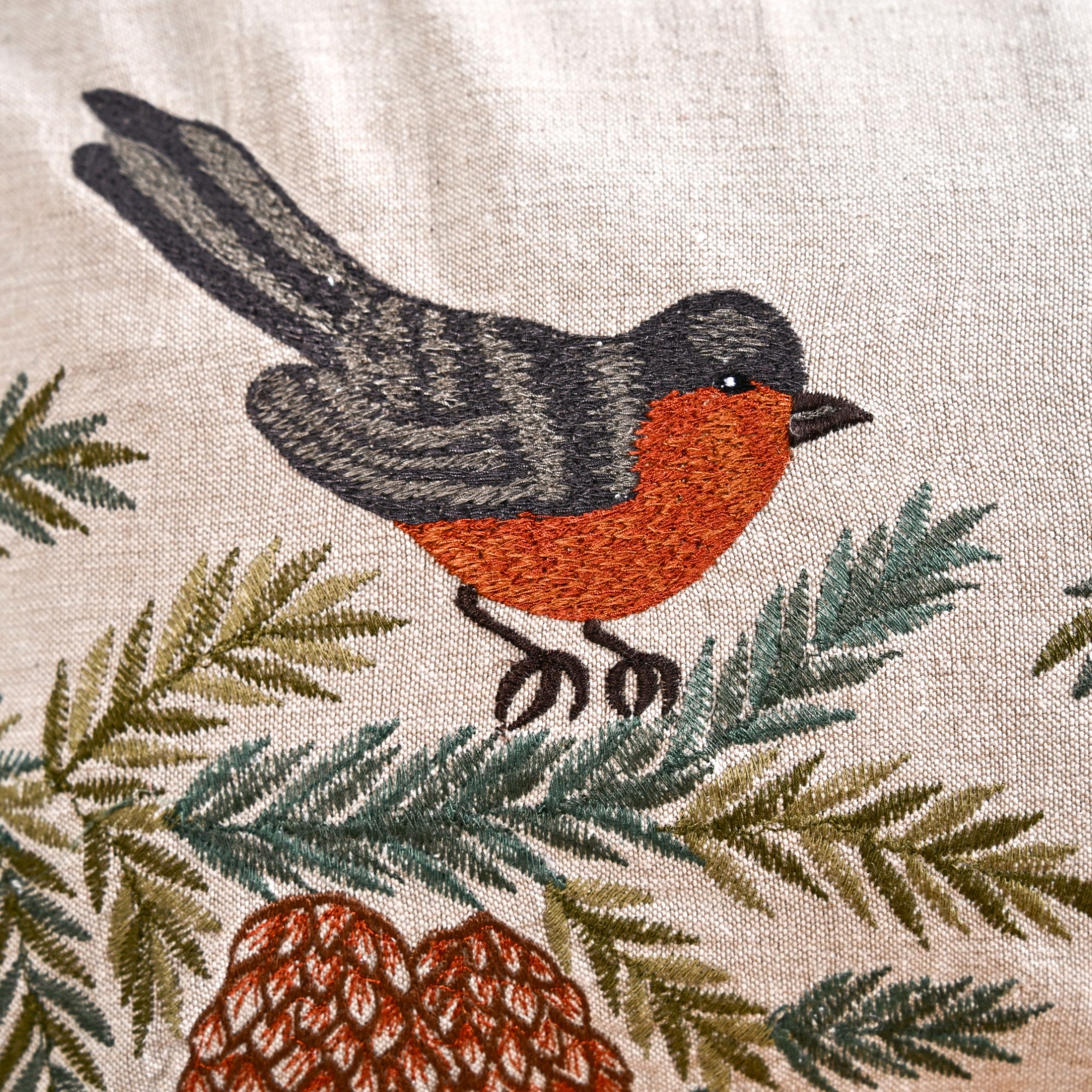 Design: Featuring two intricately embroidered swallows facing each other perched on pine branches, the sofa cushion cover blends the elegance of hand and machine embroidery. The subtle beige cotton chambray fabric enhances the design’s natural aesthetic, making it a versatile addition to modern and traditional decor styles. A concealed bottom zipper ensures a seamless and polished look.