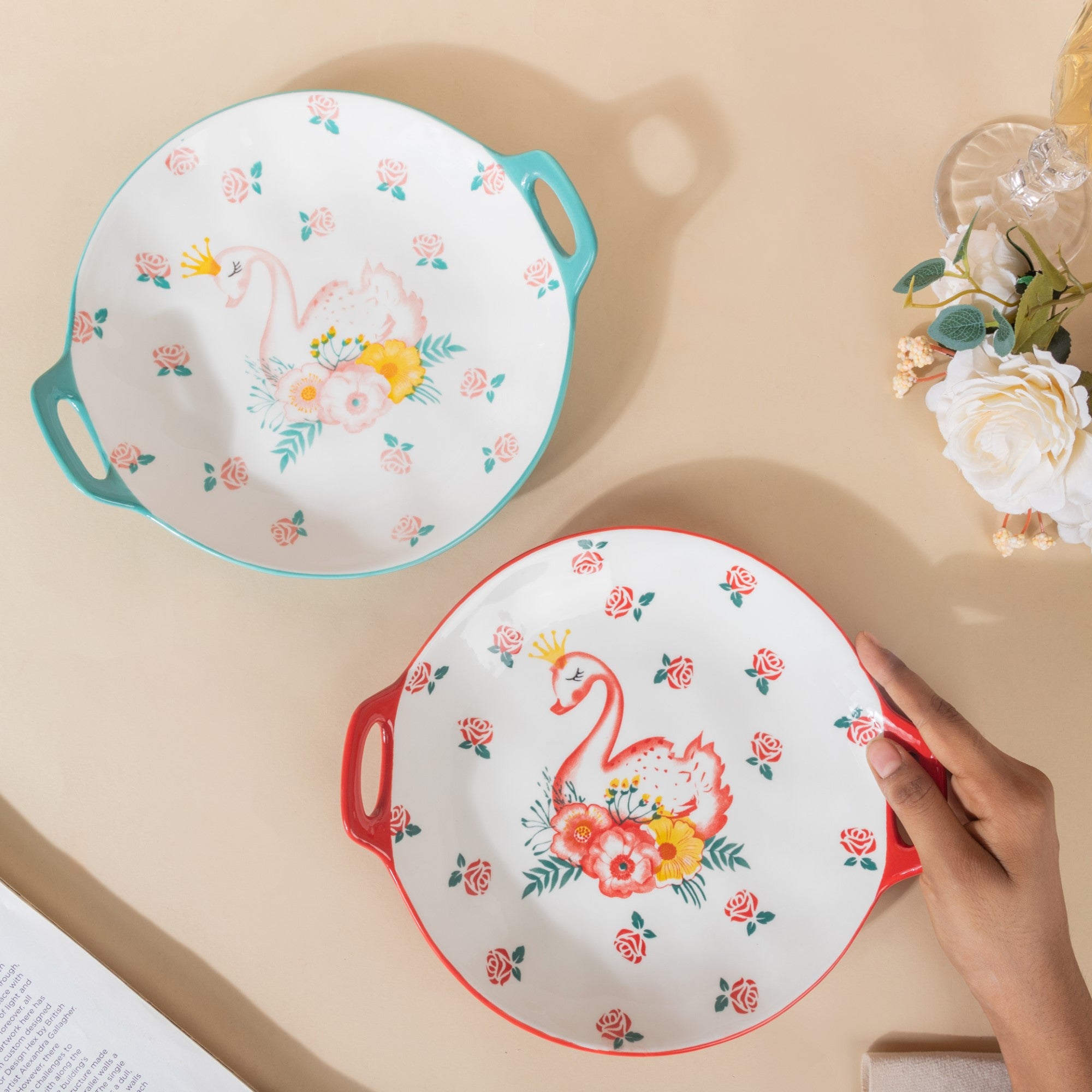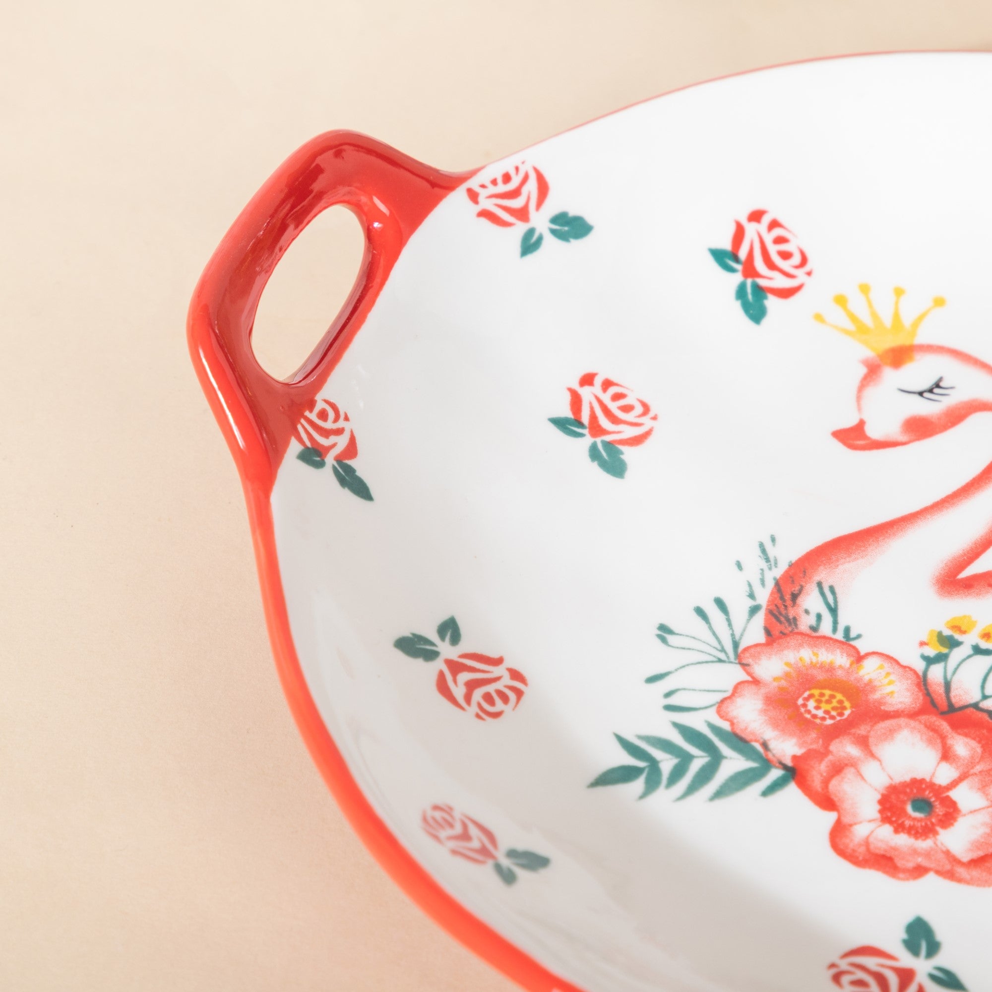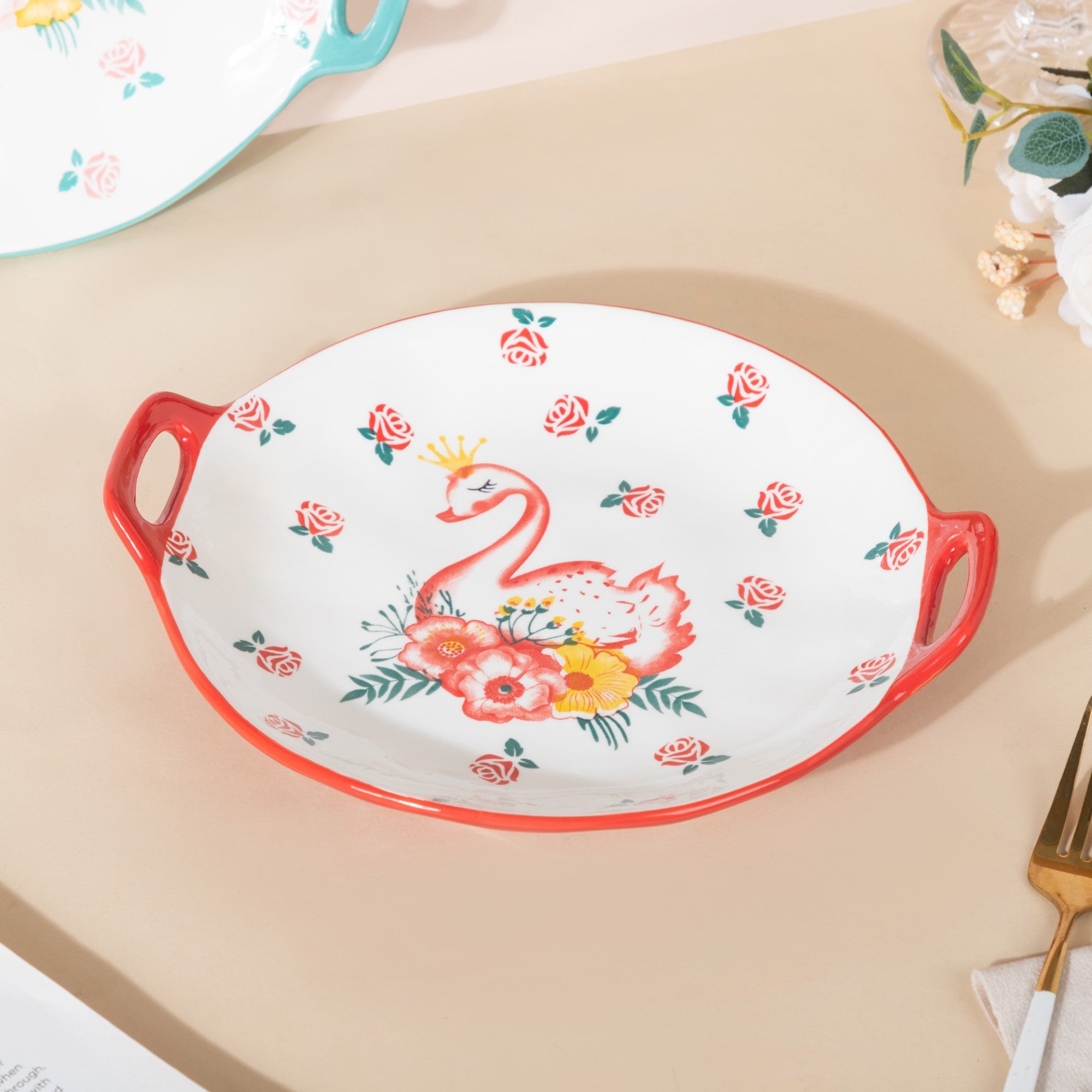 Round ceramic dish with handles and floral embossed prints, available in 2 variants. The plate's handles make it easy to pick it up and serve food at a table. This dish can be used as a platter, a salad plate, a pasta plate, or a noodle plate, among other things. It can also be utilized as a fruit plate. Main courses can also be served on the ceramic plate. The inner surface of the deep plate has a beautiful flower and swan print which gives it a unique look. From the swan collection, the ceramic plate can be used in the microwave which makes it easier to heat up food directly before serving it on the dinner table.