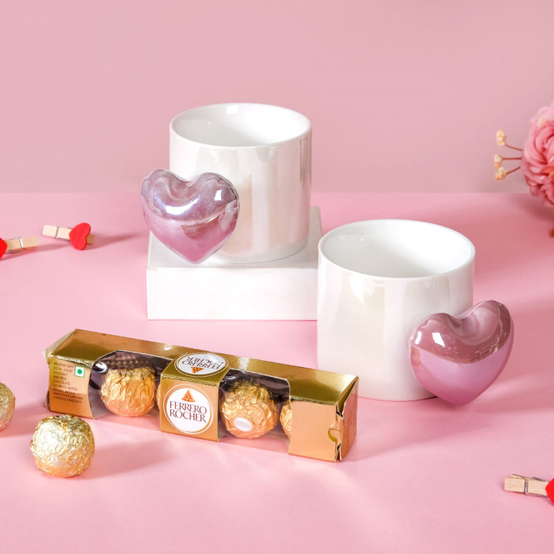 Indulge in heartfelt moments with our thoughtfully designed Valentine's gift hamper! The exquisite gift set features two charming ceramic mugs adorned with purple balloon heart-shaped handles, perfect for cosying up with your loved one on a coffee date. Complemented by a tantalising pack of Ferrero Rocher chocolates, each bite is a delightful symphony of taste. Celebrate romance with every sip and share sweet whispers over these elegant mugs. Whether it's a lazy morning together or a blissful evening by the fire, the gift hamper set embodies affection and warmth. Elevate your Valentine's Day with this thoughtful gift, a blend of exquisite taste and heartfelt design.