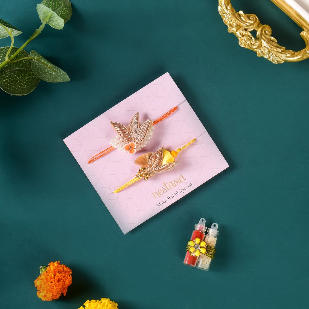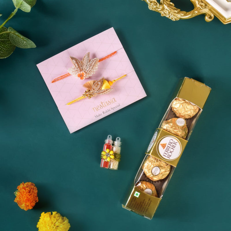 Introducing our delightful Raksha Bandhan gift hamper, a perfect way to celebrate the bond of love and protection between siblings. Our specially curated set includes a vibrant combination of one yellow and one orange coloured rakhi, symbolizing joy and enthusiasm. Accompanied by a convenient roli-chawal bottle set for traditional rituals and a delectable pack of Ferrero Rocher chocolates, this hamper is designed to add sweetness to your celebrations. With these beautifully crafted rakhis and the indulgent treat of Ferrero Rocher, our hamper promises to make Raksha Bandhan truly memorable. Embrace the spirit of togetherness with our rakhi hampers and create cherished memories on this auspicious occasion.