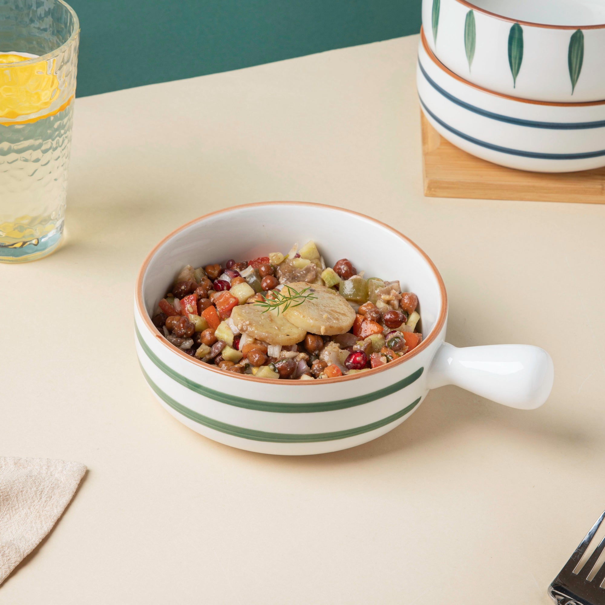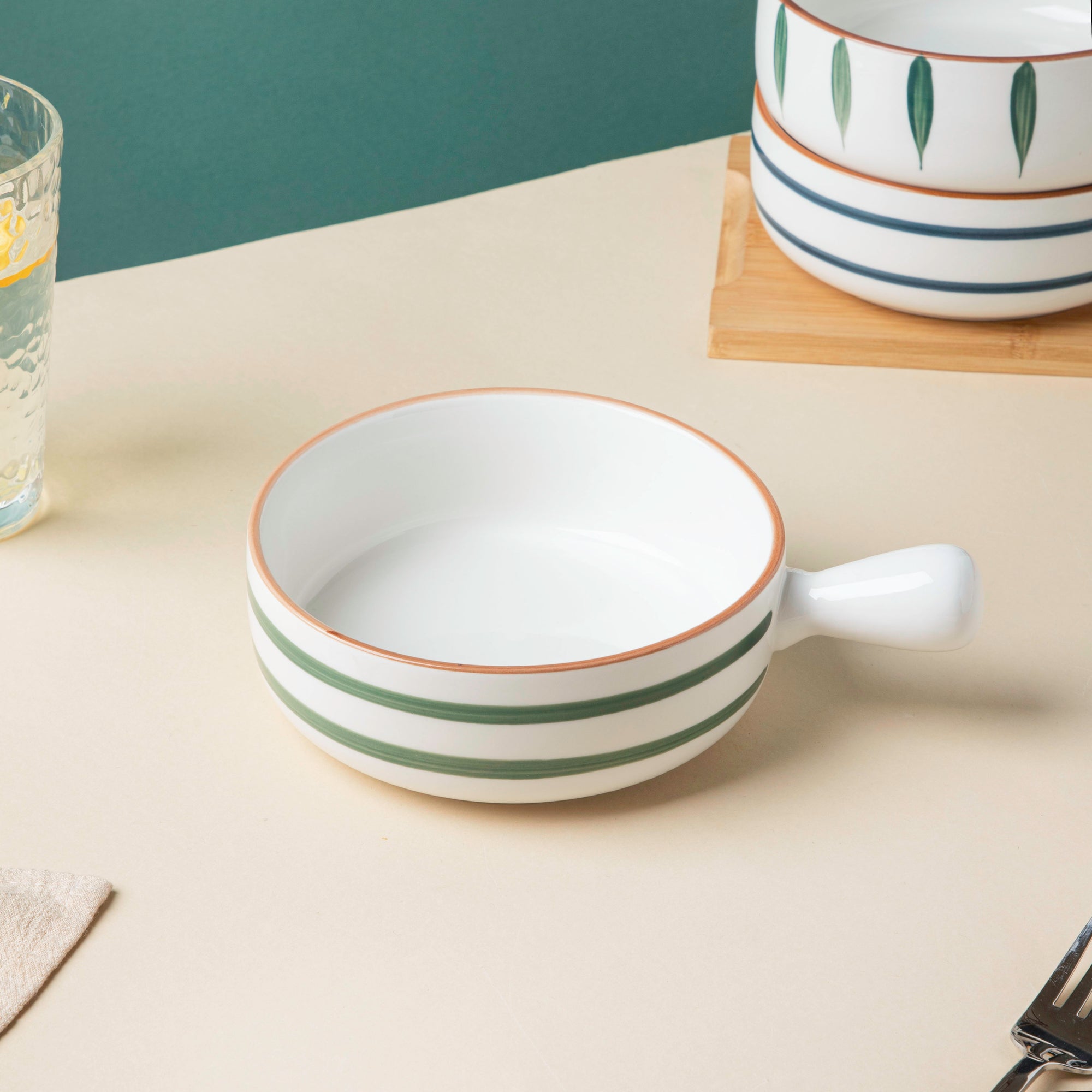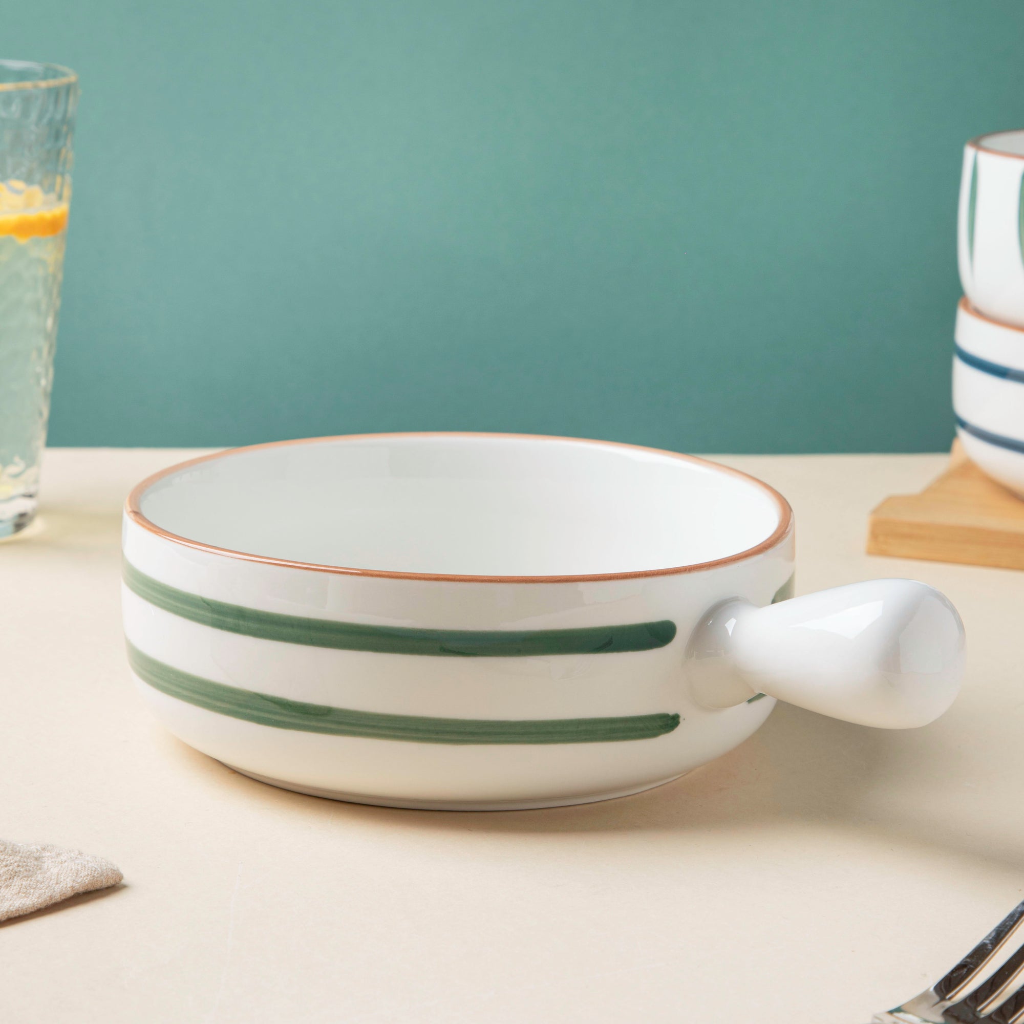 The elegantly designed bowl with a handle, also referred to as a ceramic pot, may simply be used as a dining table decoration. A handcrafted white striped pot with a handle is always bound to get appreciated by the guests and be the star of an event for a long time. The ceramic food serving pot with a handle has a distinctive style and pattern, making it excellent for serving pickles, salad, and other foods. The white pot features an exquisite design of horizontal lines that will complement the look of the table during dinner or lunch. Nestip: The baking bowl can be used to serve cheese-loaded lasagna. Size: 15cm D x 6cm H Length with handle- 21cm Capacity- 500ml Color: White, green, and brown Material: Ceramic Products included: 1 bowl with handle Style: BRC88C117
