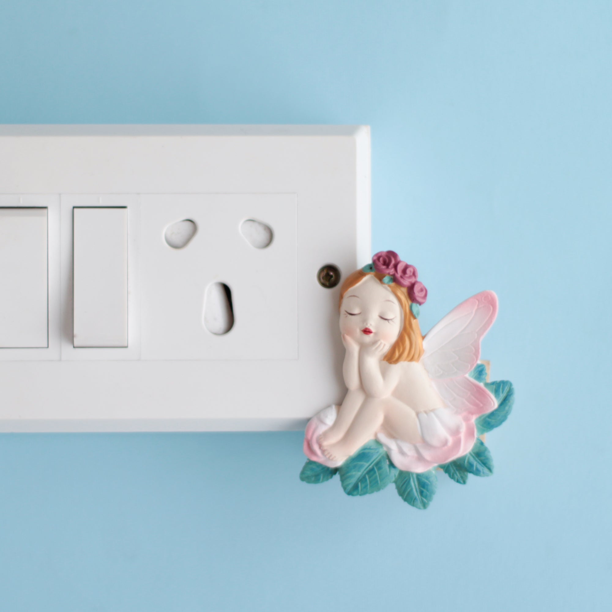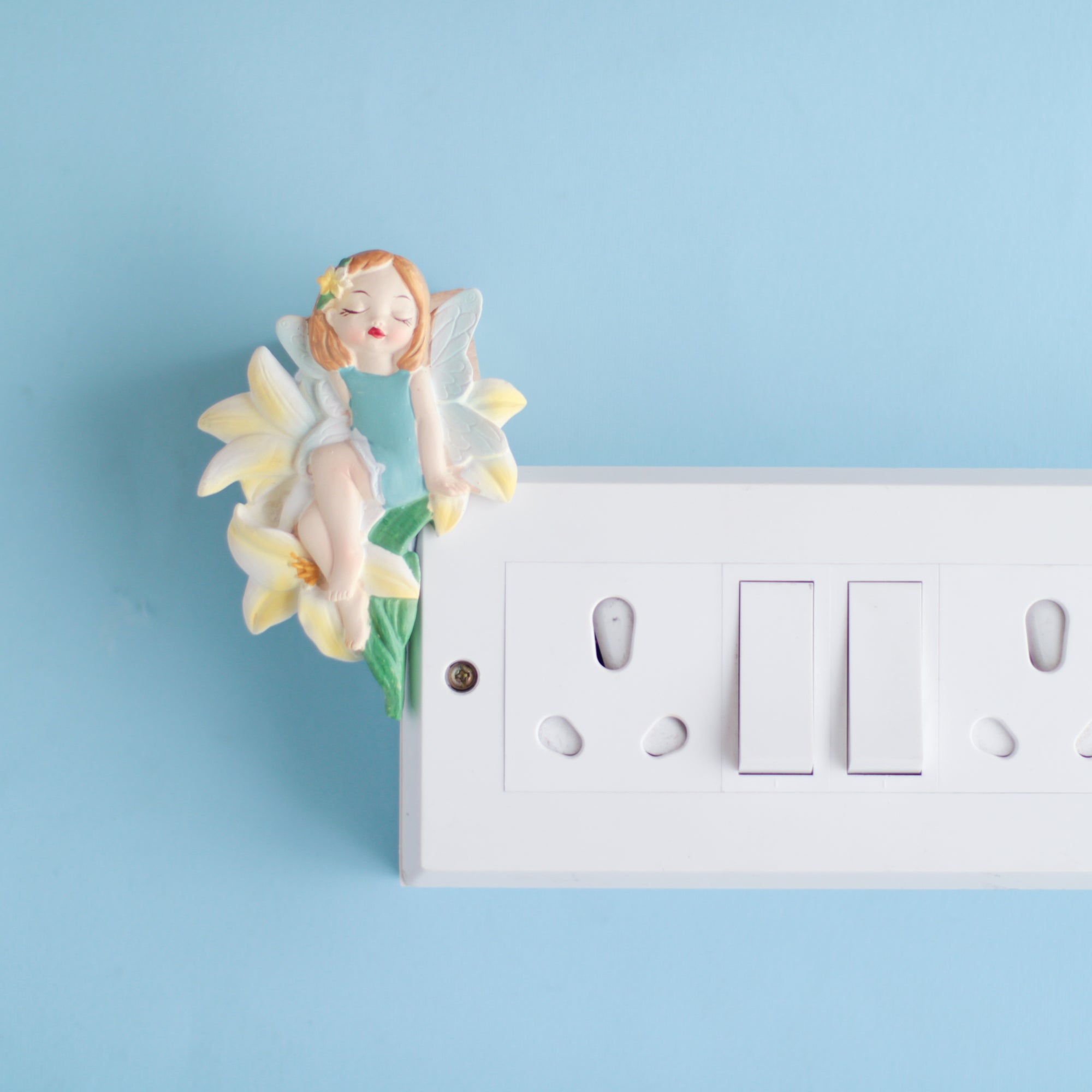 Switchboard decoration to add colours and element to a dull wall or switch panel. The switch board decor comes in shapes of fairies in pink, blue and yellow that can add little magic to the room decor. Stick the decor on the switch panel or on a soft board or on a wall.