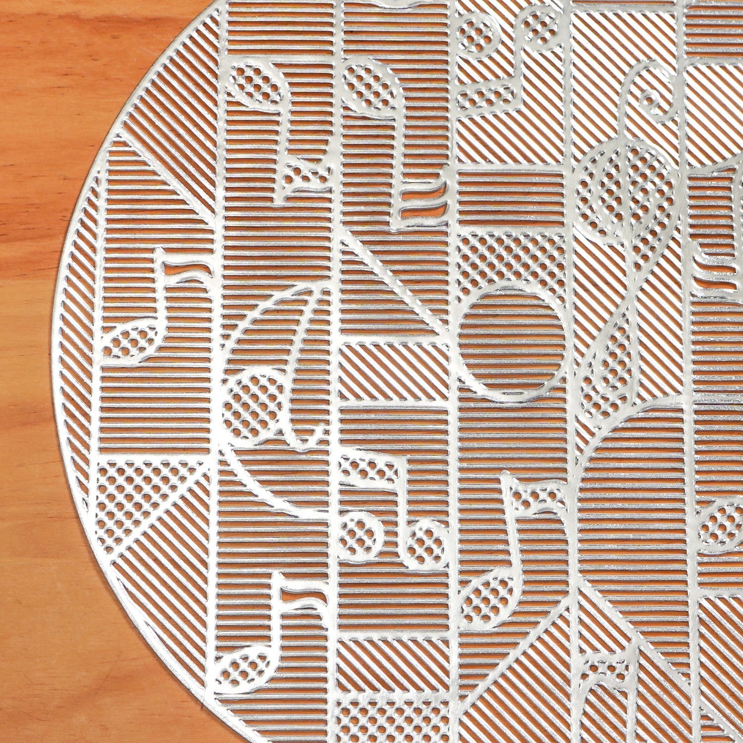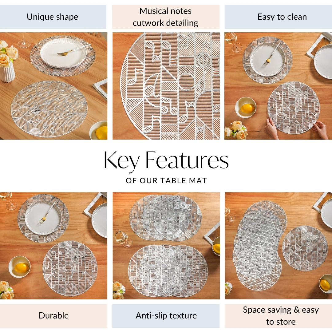 Design: This is a lovely set of six individual mats. Each mat has a modern design with subtle musical shapes. Fine cut-out details of musical notes are smoothly combined into a stylish, geometric pattern. This creates a look that is striking but not overdone. Every part of the mat is clearly defined by neat, straight lines, giving a feeling of order, much like a sheet of music. These mats are light and feel airy, adding to their elegant look. The front side shines with a bright silver finish, giving your table a rich and modern sparkle. The back has a practical matte finish, making it easy to know which side is up.